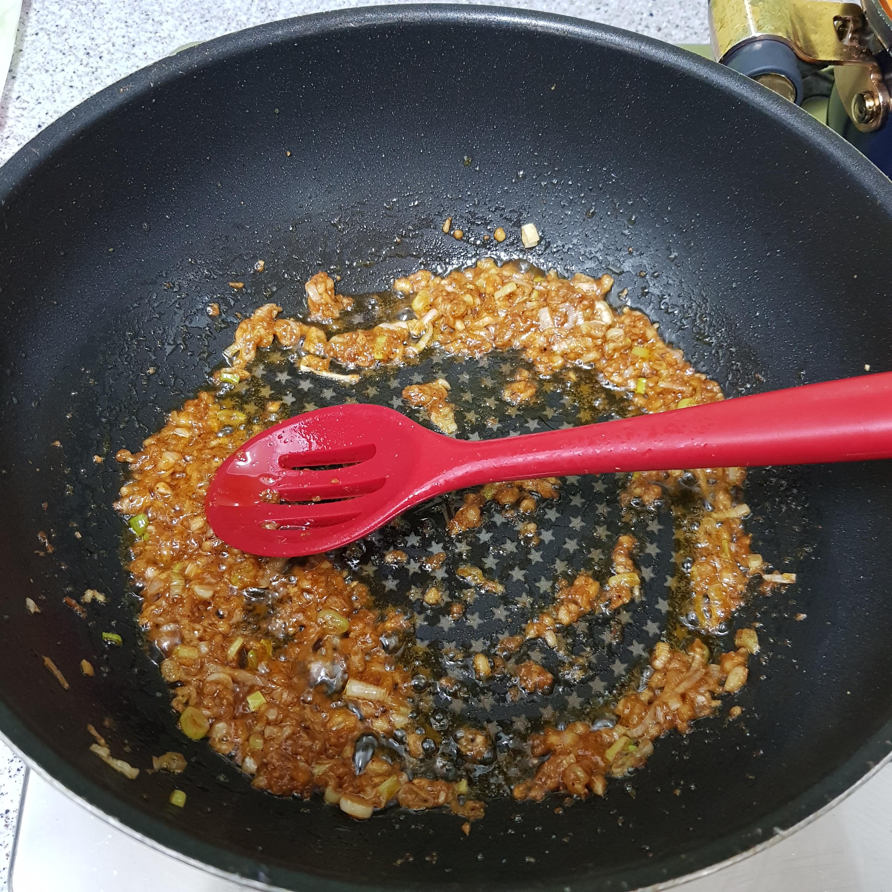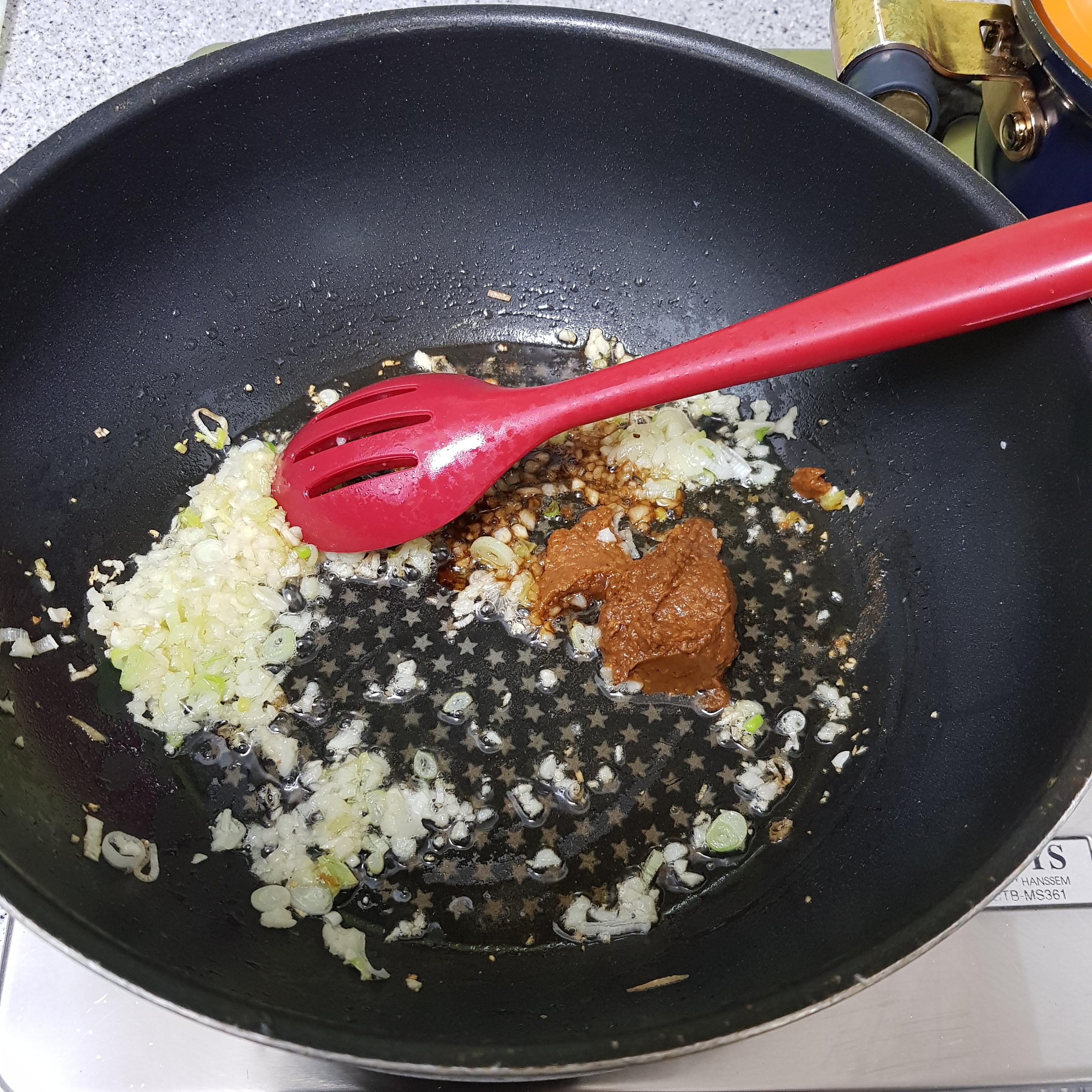 ▶ 다진마늘 1큰술을 넣고 파와 마늘의 수분과 매운 향이 날아갈 때까지 볶아주세요 파 기름 효과는 덤이랍니다