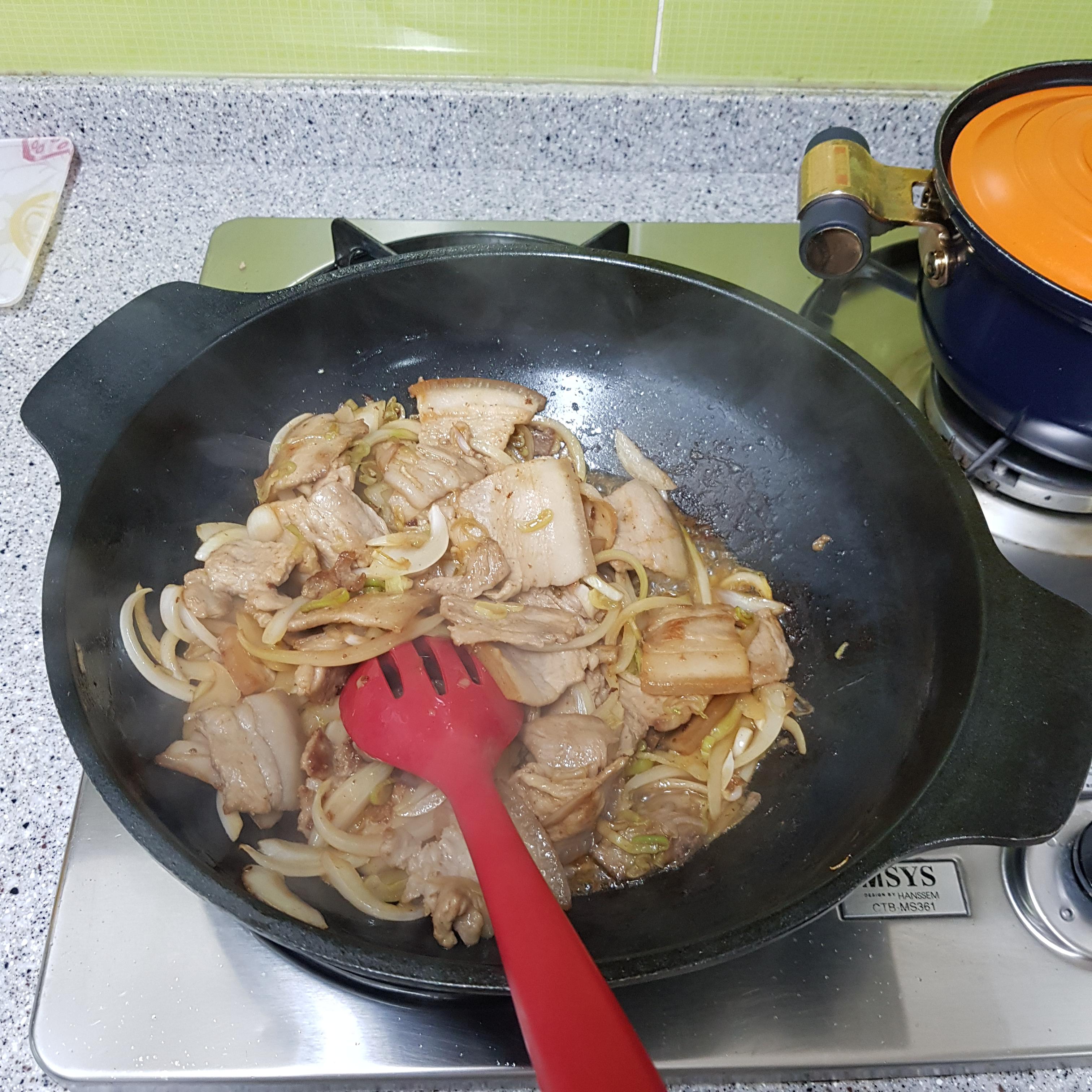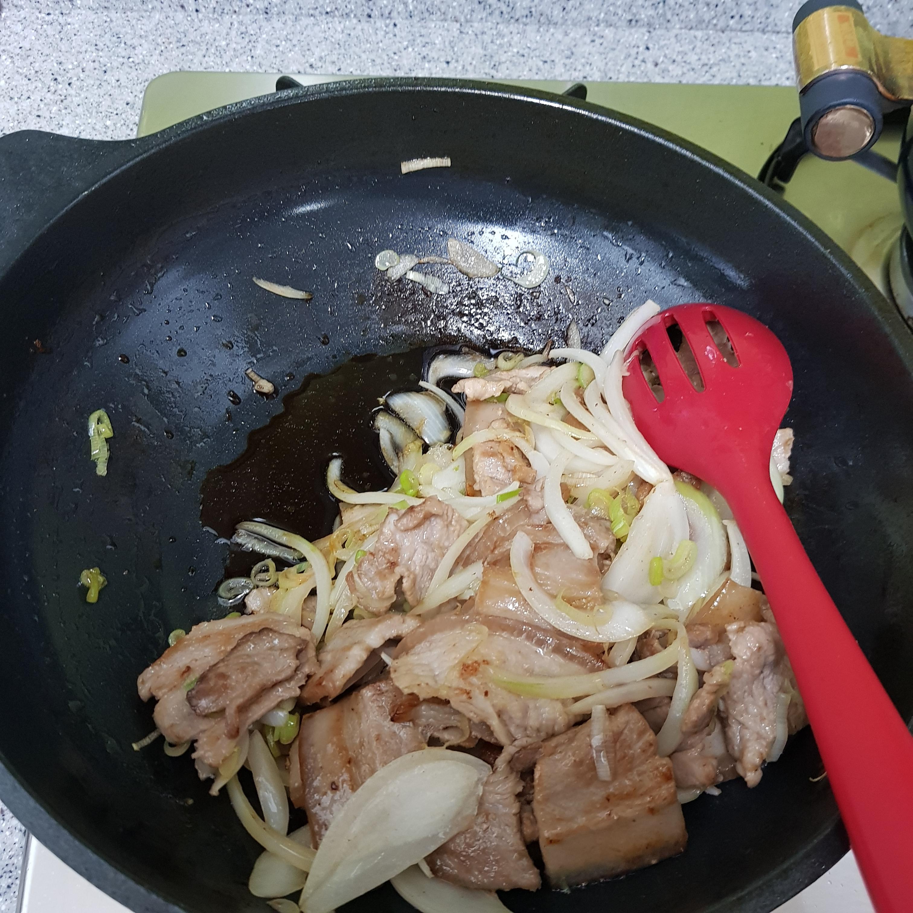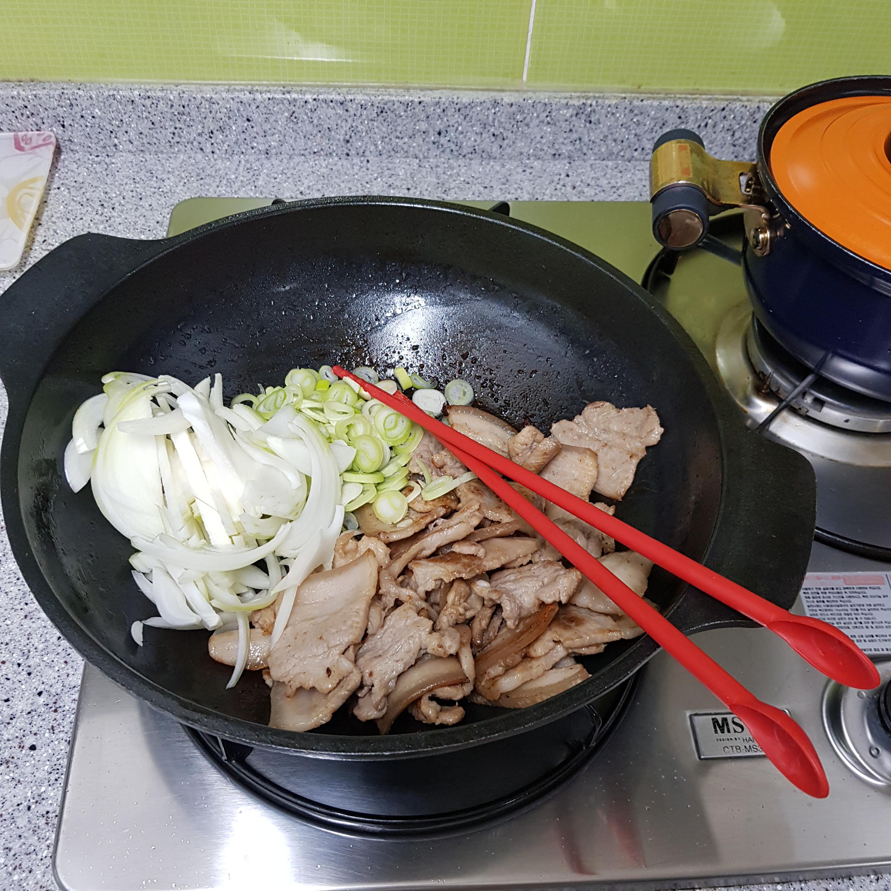 ▶ 돼지고기가 노릇노릇하게 구워지면 나오는 기름에 송송 썰어 준비한 대파를 넣어 볶아주세요