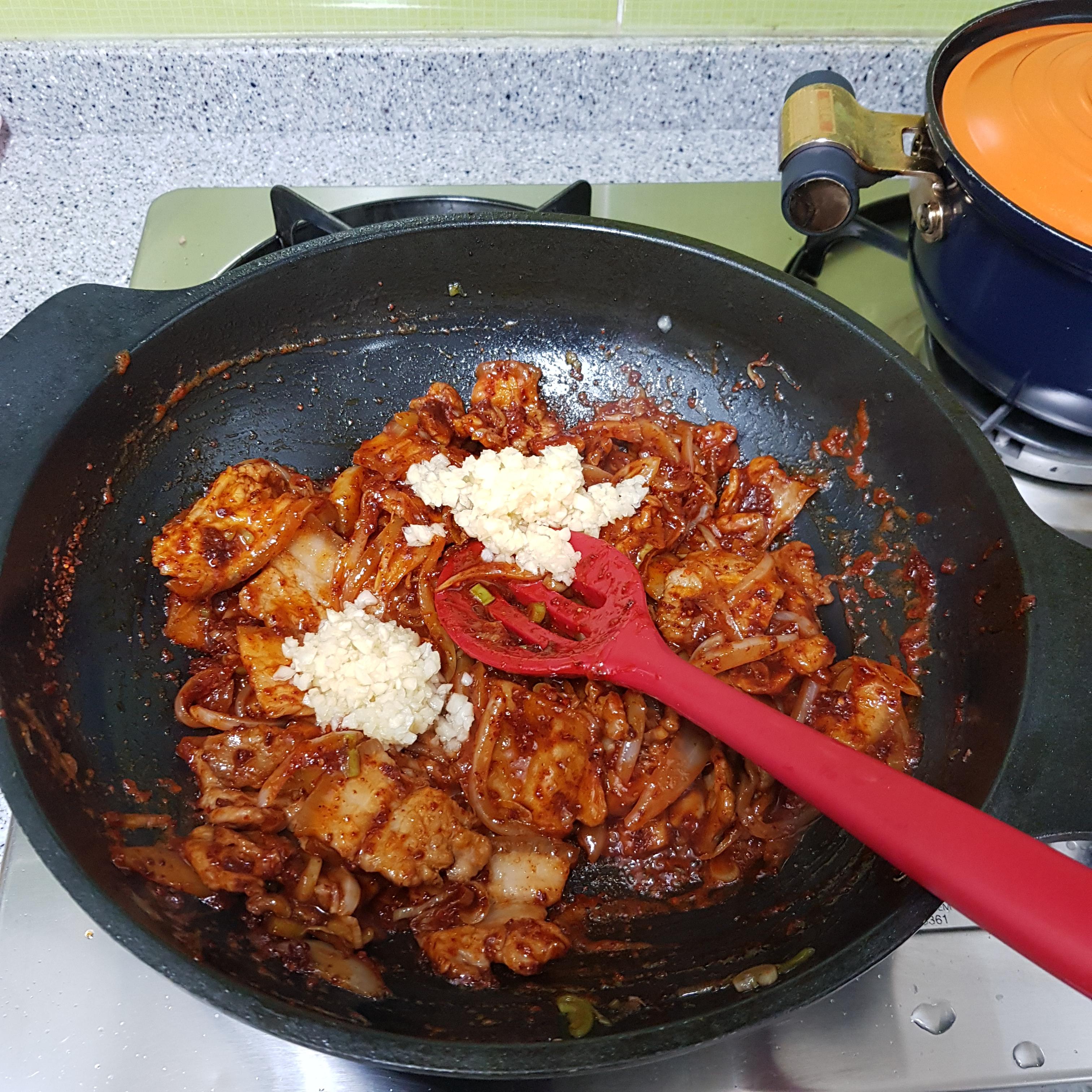 ▶ 고추장 2큰술, 고춧가루 4큰술을 넣고 볶아주세요