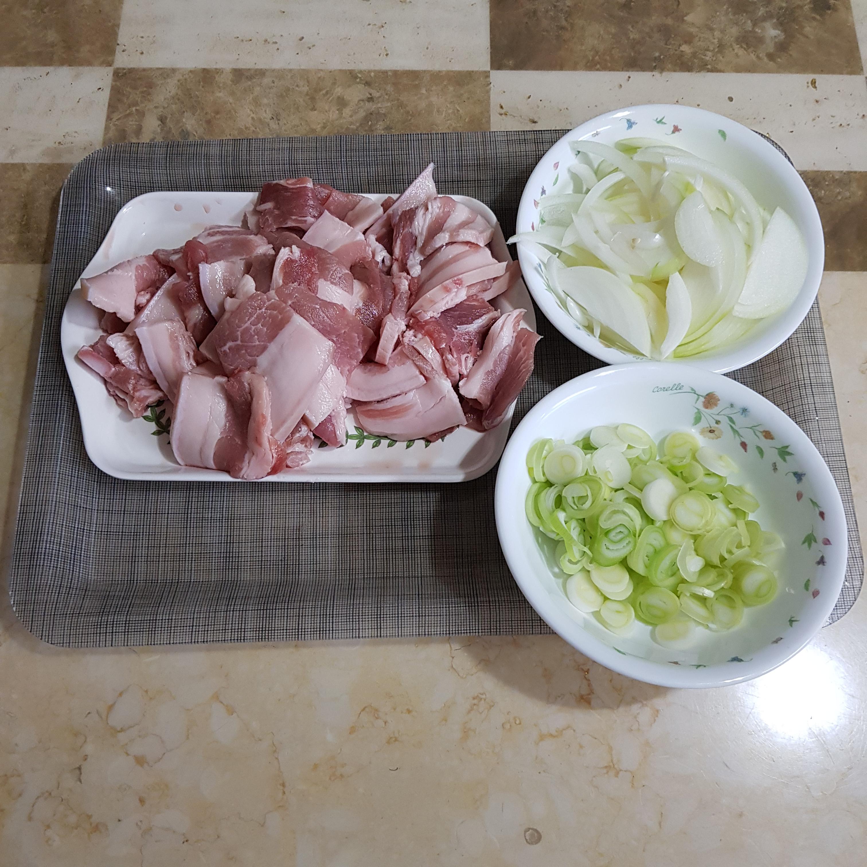 돼지고기 400g, 양파 반개, 대파 흰부분 1대, 채 썬 대파+쪽파 약간+홍고추 1개(고명용)