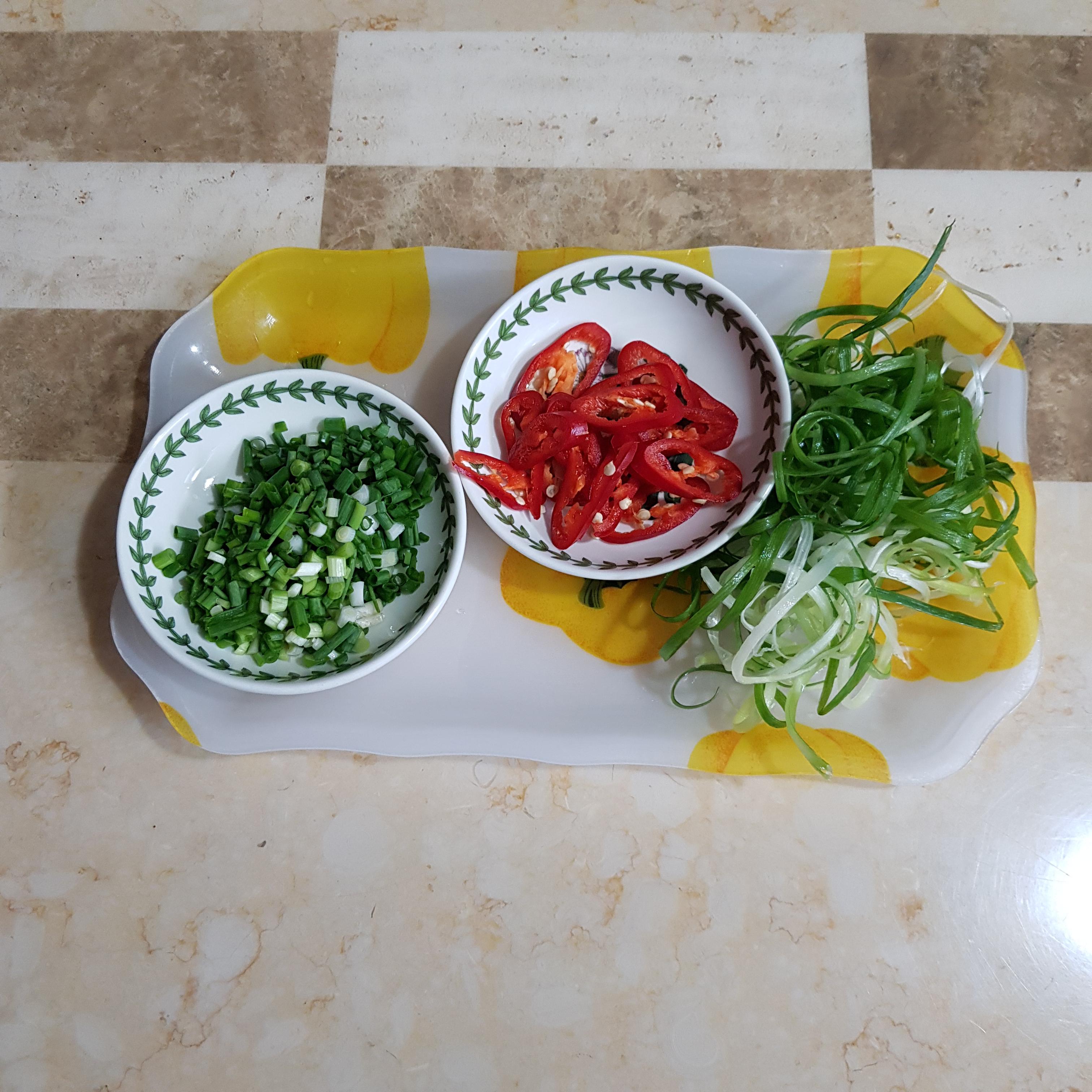 ▶ 고명으로 사용할 쪽파는 송송 썰어주고 홍고추는 얇게 어슷썰기, 대파는 채 썰어 사진을 참고하여 준비해주세요 고명은 생략 가능하답니다