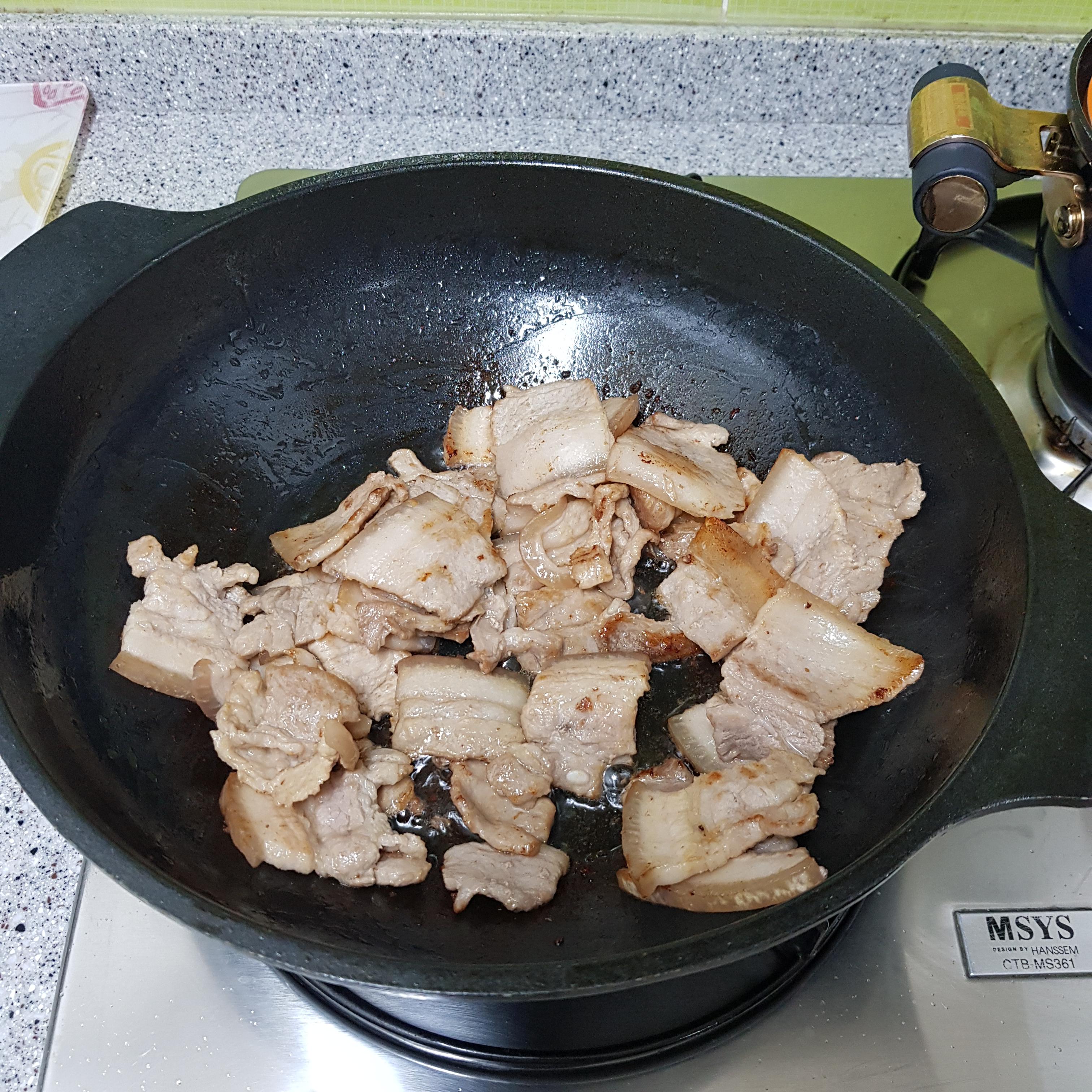 ▶ 삼겹살을 먼저 구워주면 고소한 맛이 배가 된답니다 삼겹살을 센 불에서 앞뒤로 노릇노릇하게 구워 준비해주세요