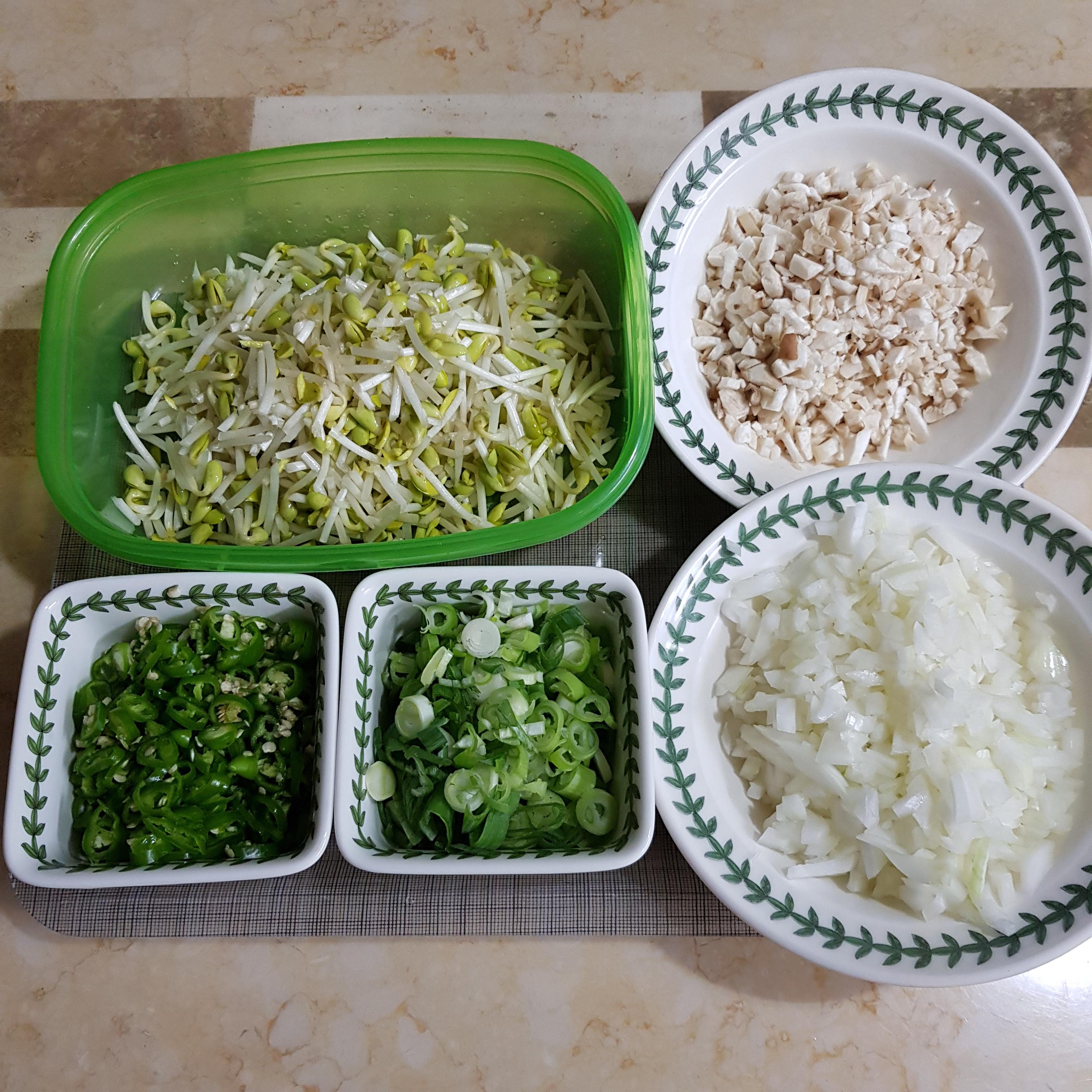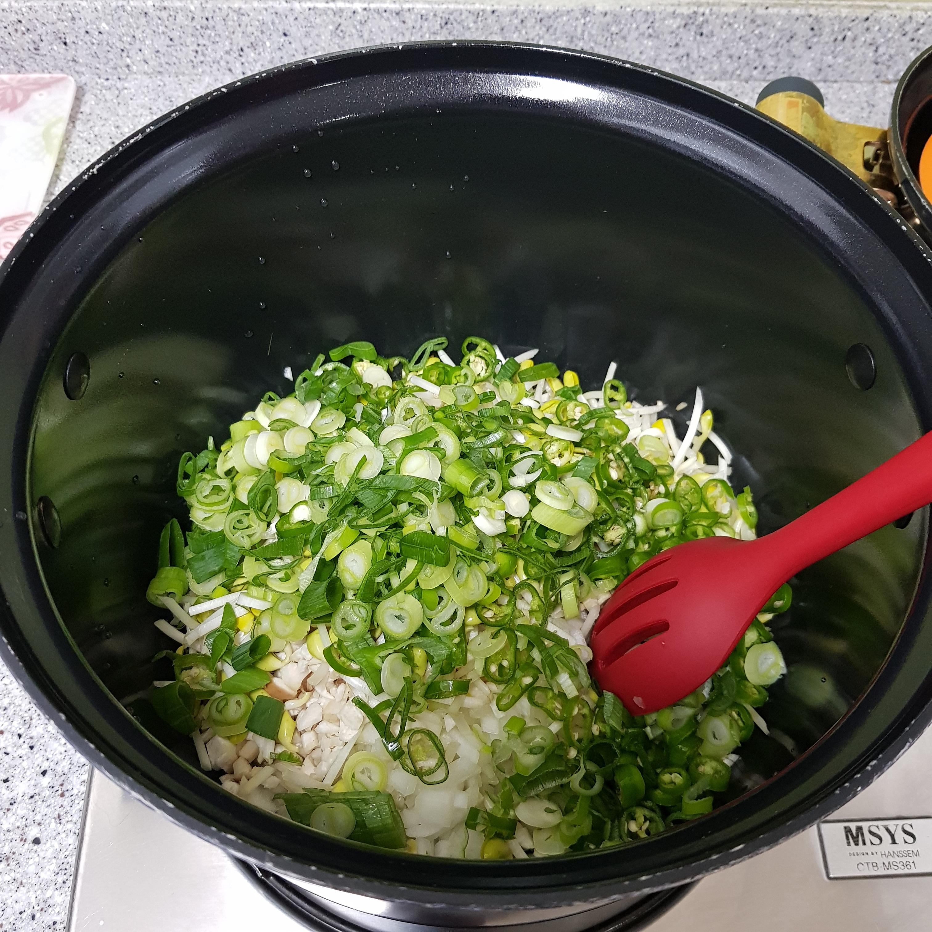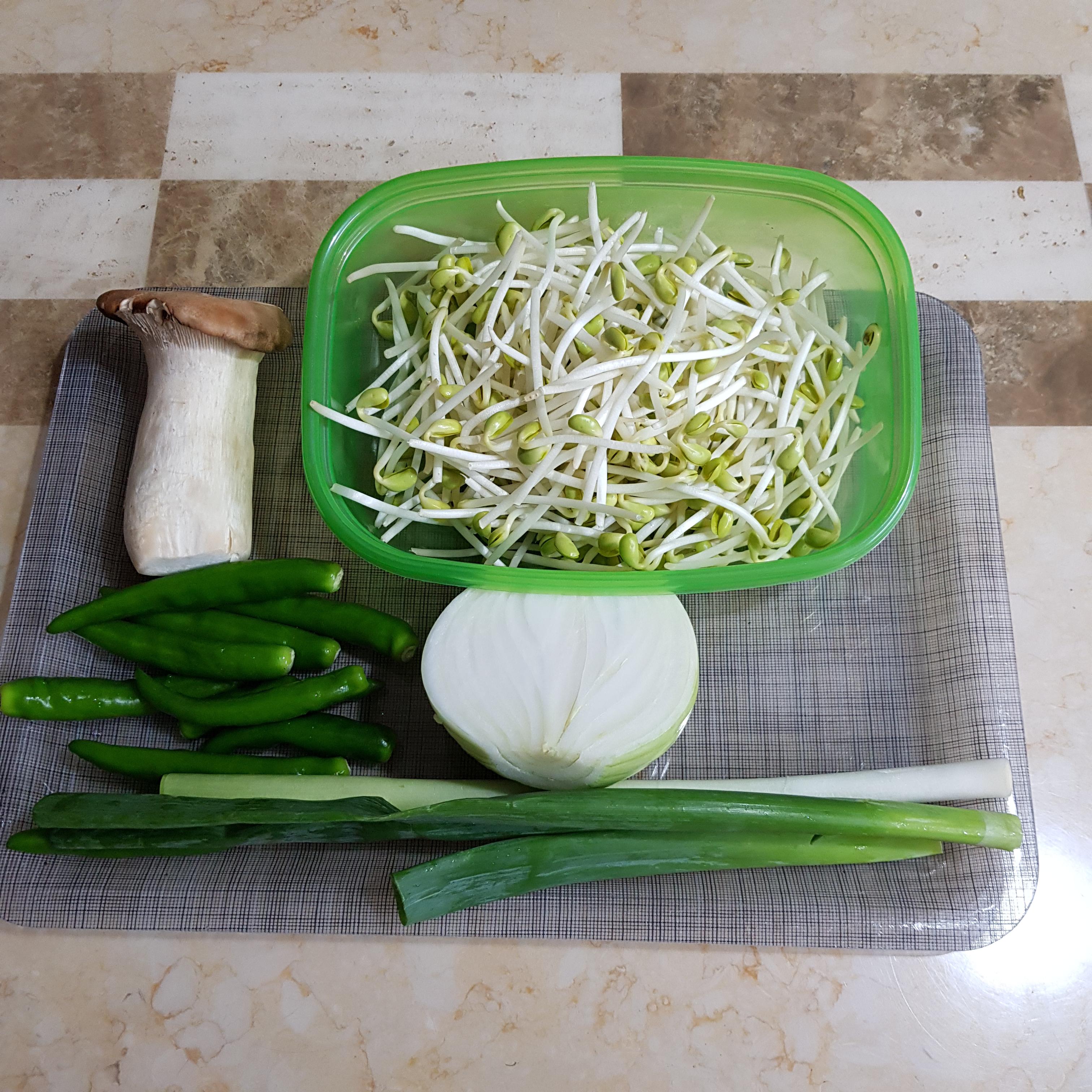 콩나물 180g, 새송이버섯 1개(80g), 양파 반개(170g), 청양고추 10개, 대파 1대(60g)