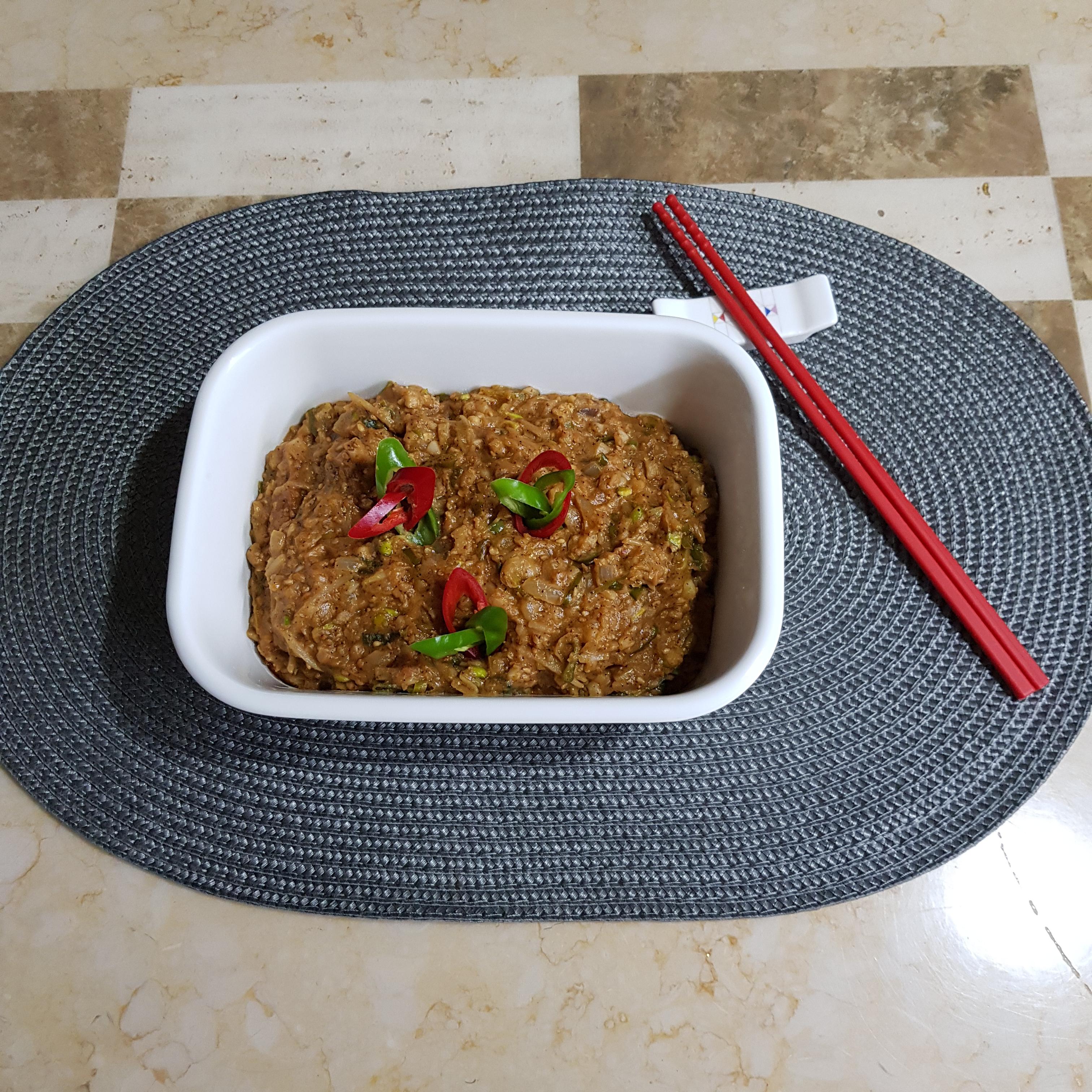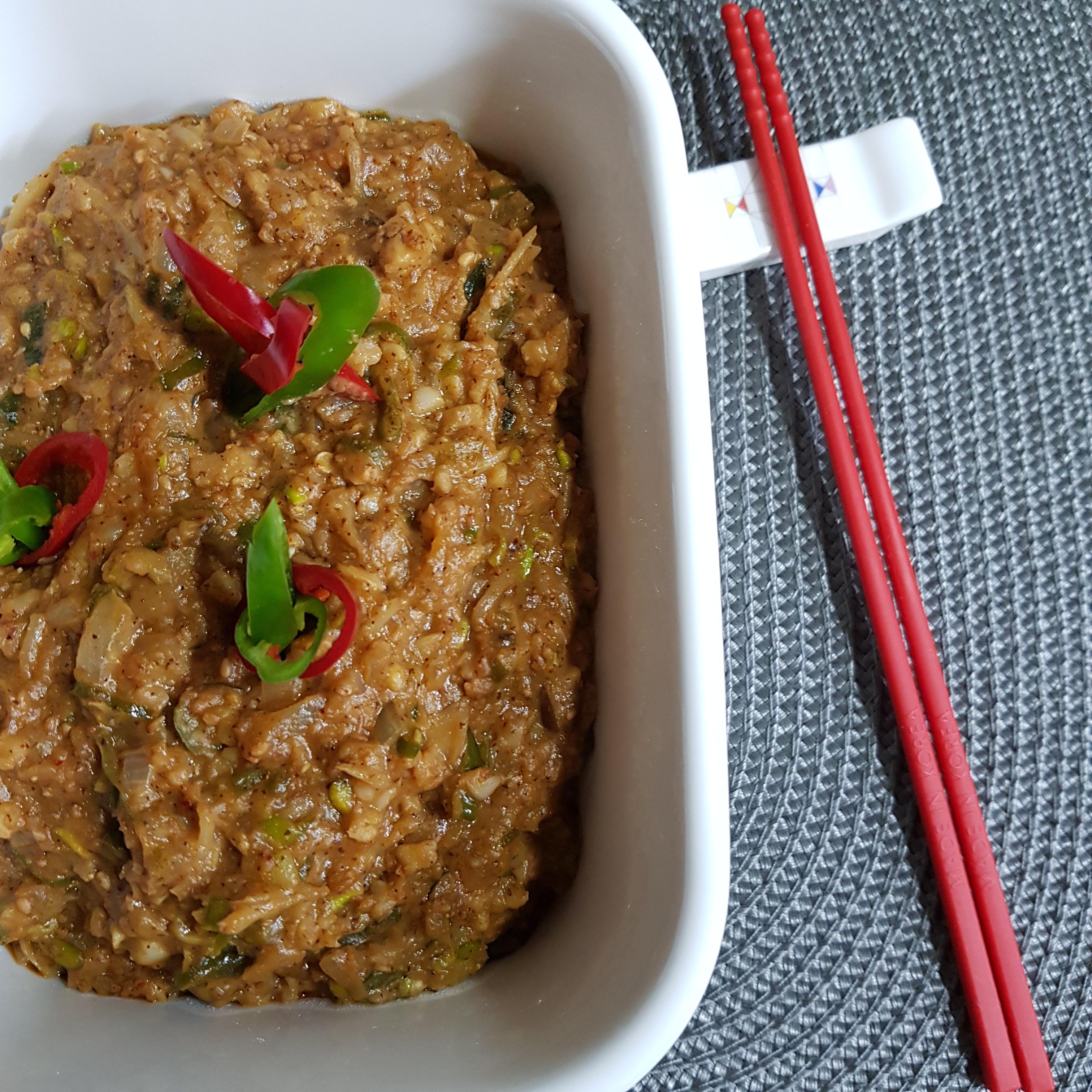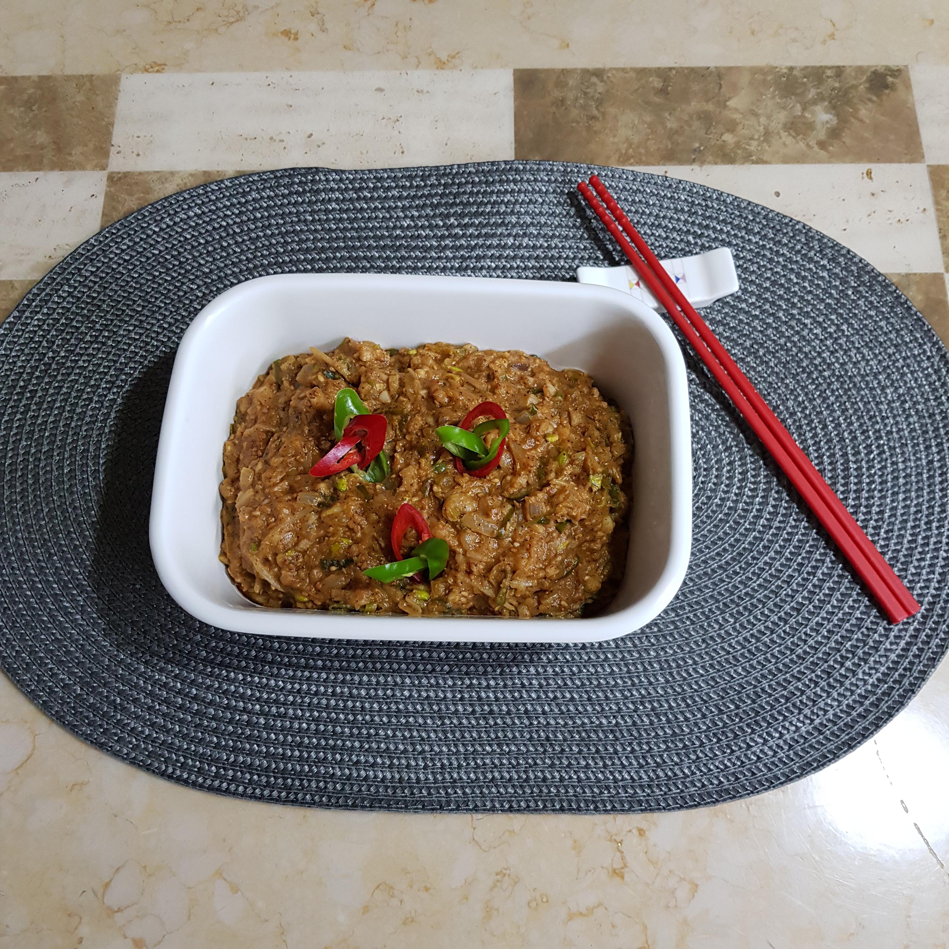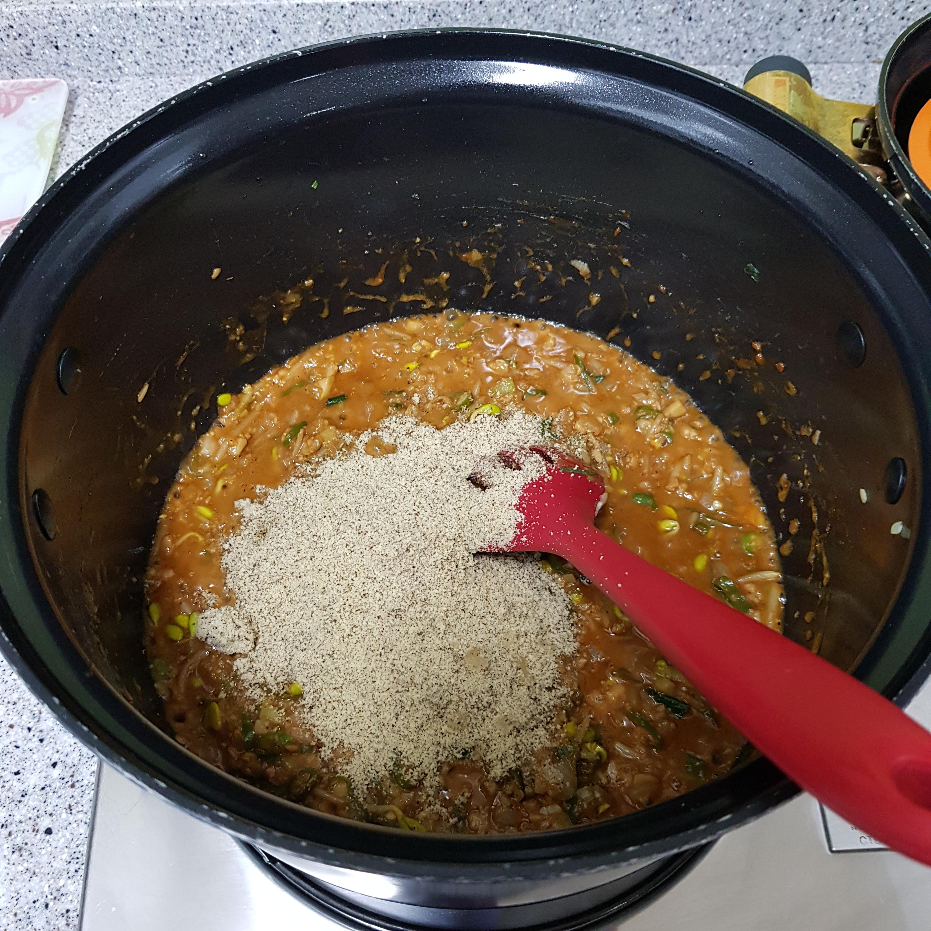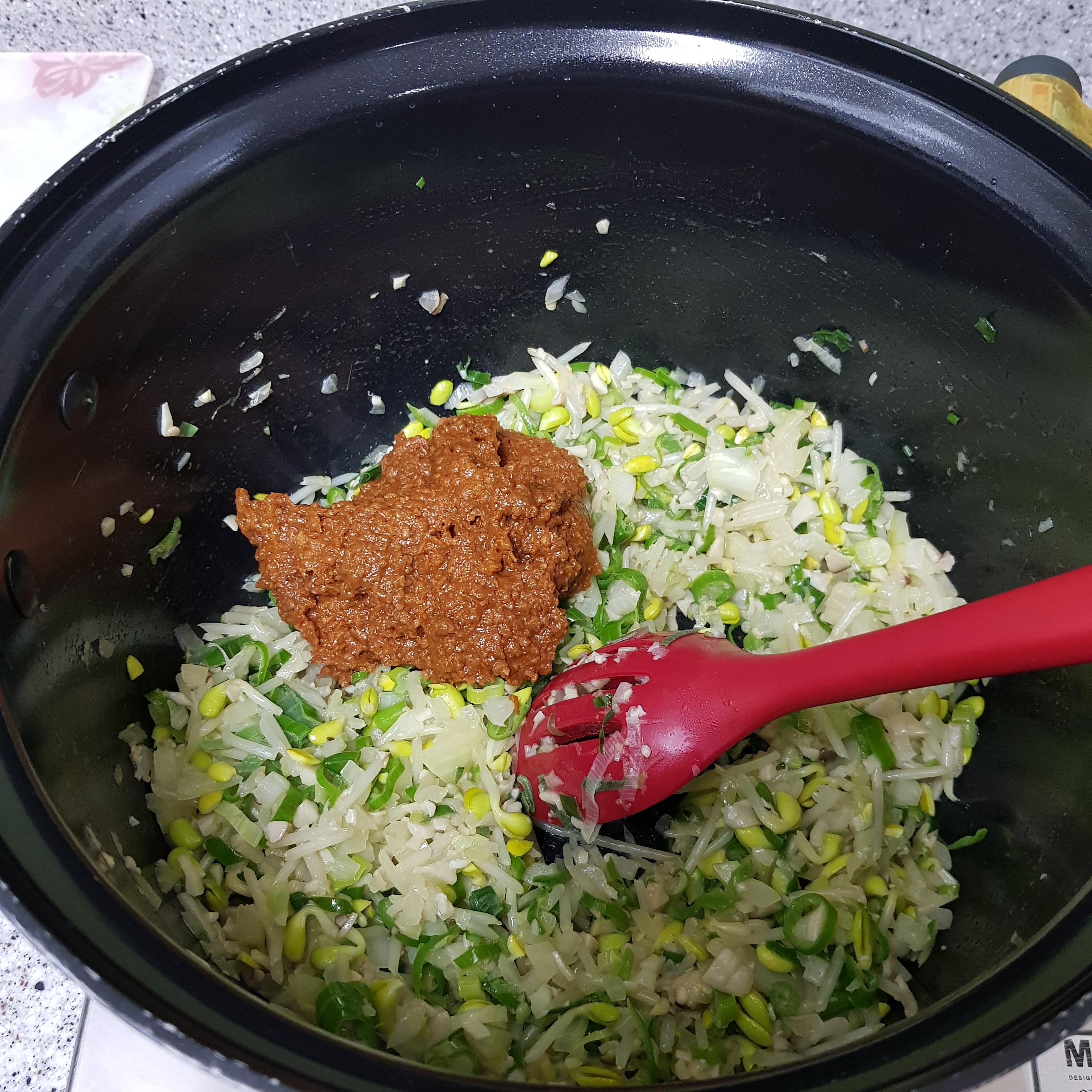 ▶ 채소를 먼저 넣고 들기름을 넣어 수분을 날린 후 시판용 된장 1컵을 넣고 볶아주세요
