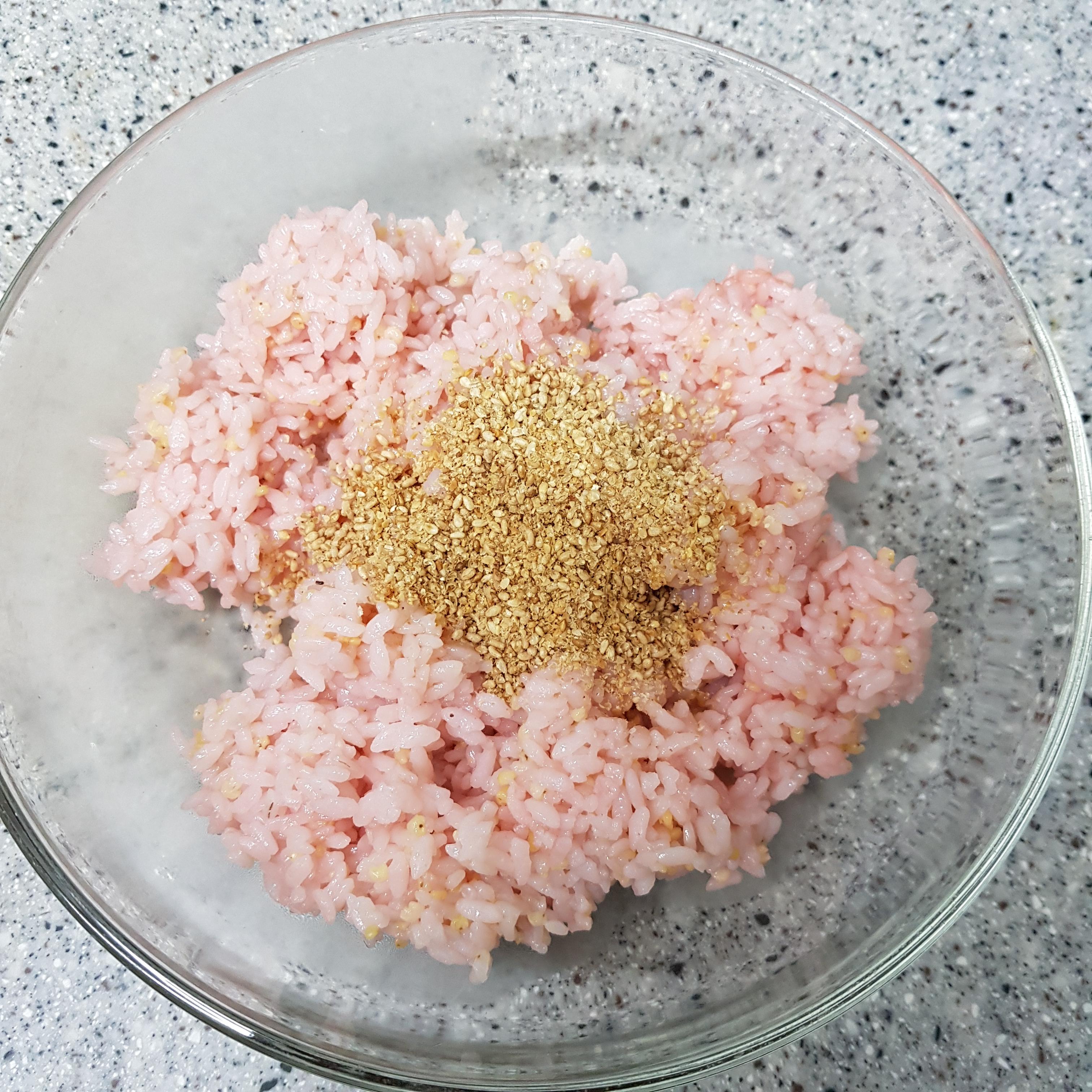 ▶ 밥에다 참기름 약간, 깨소금 1큰술 넣고 골고루 섞어 준비해주세요