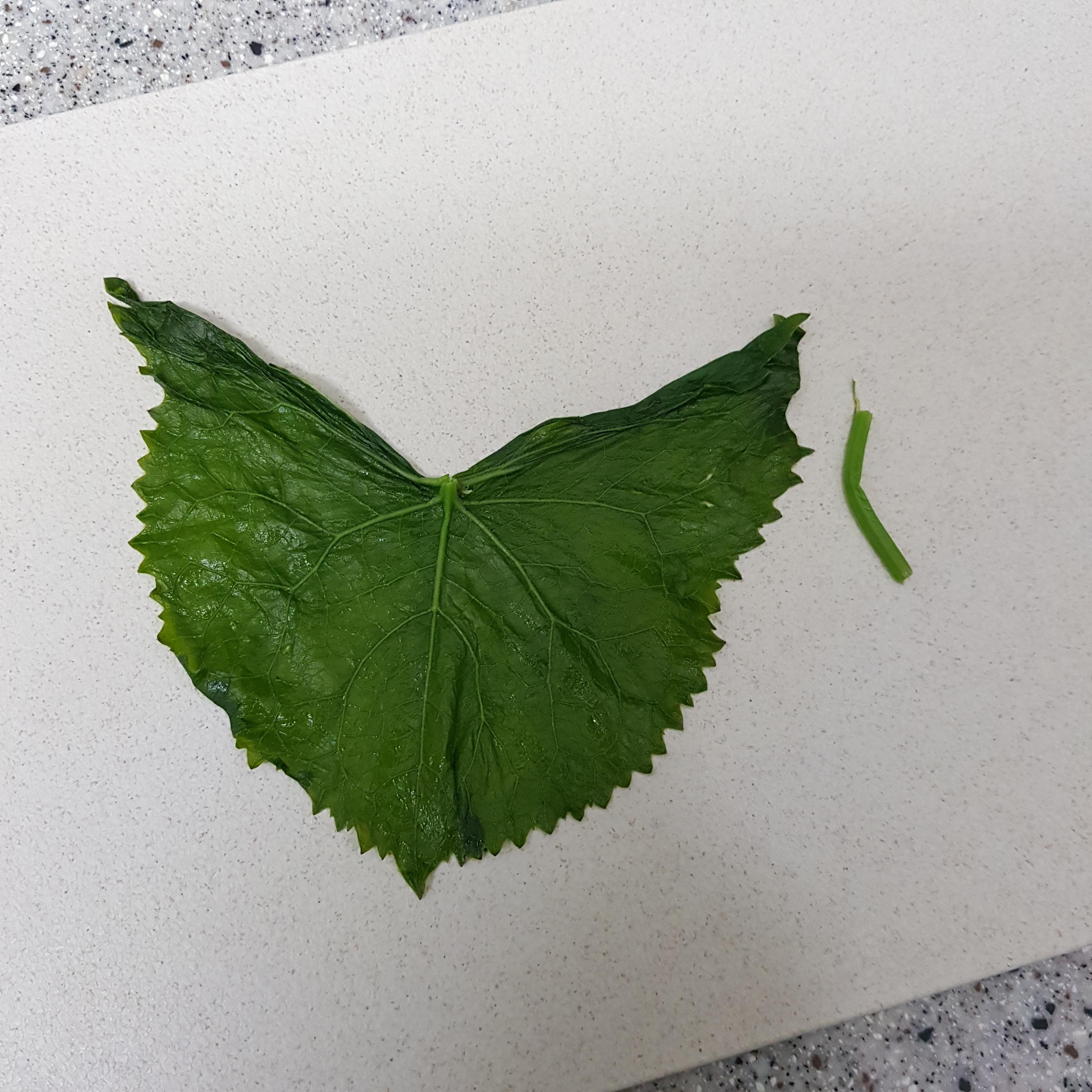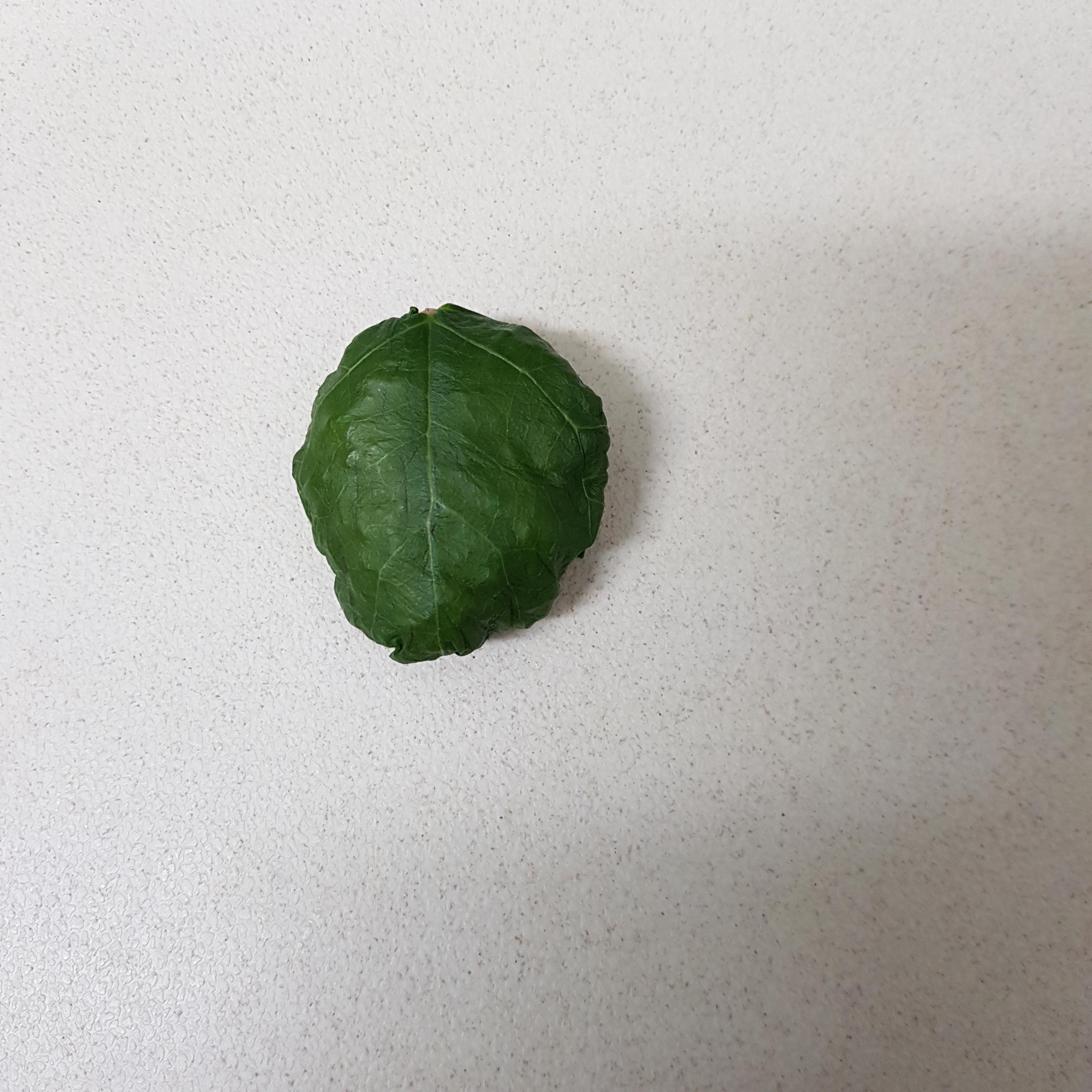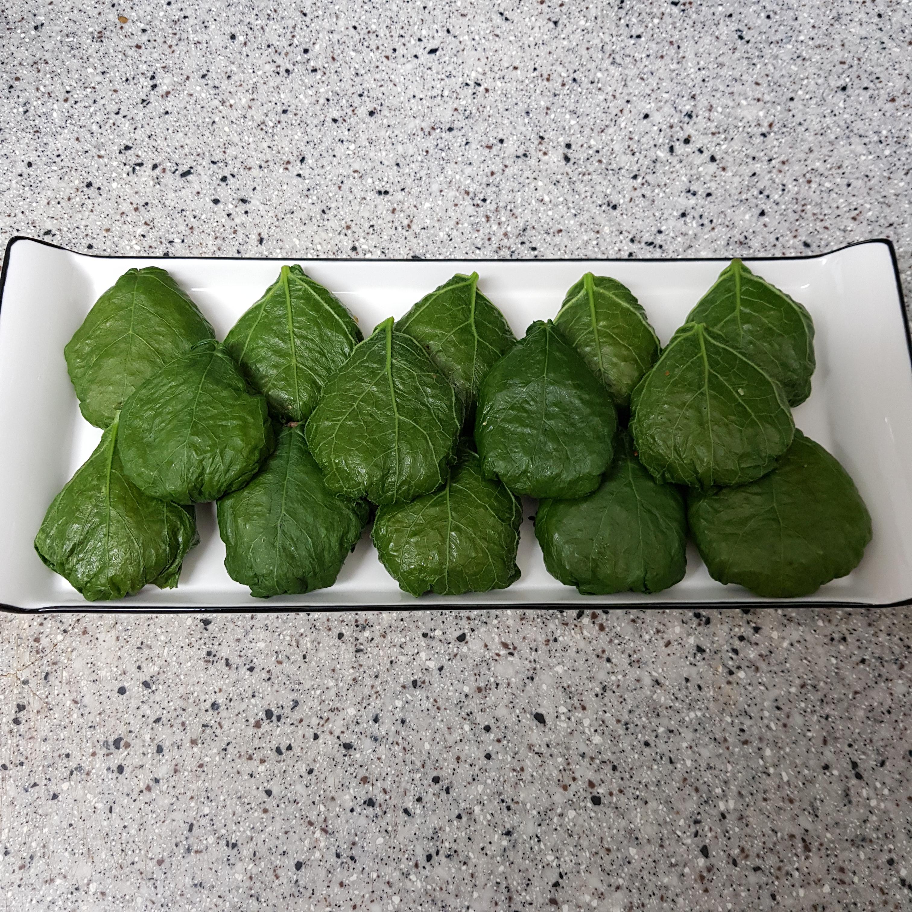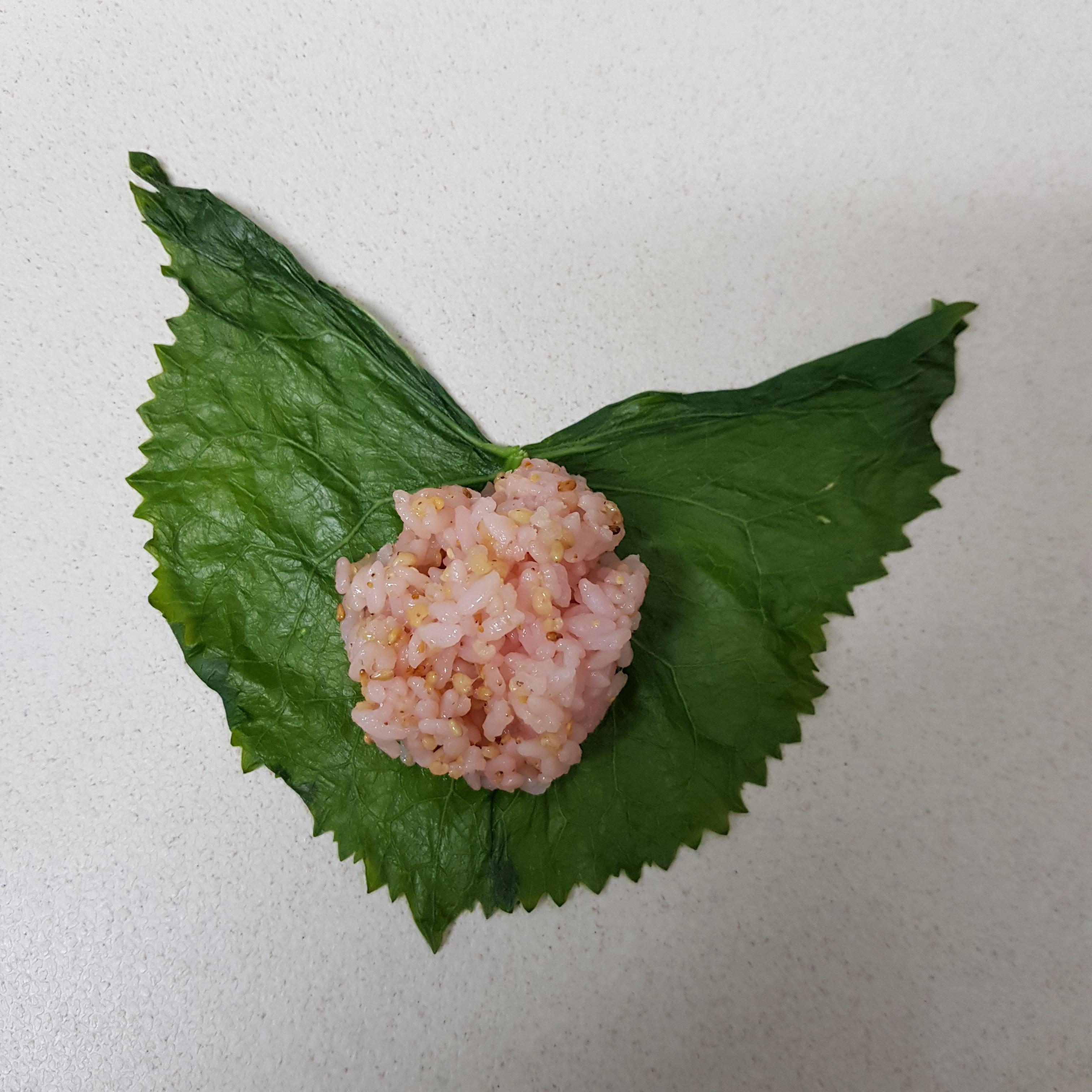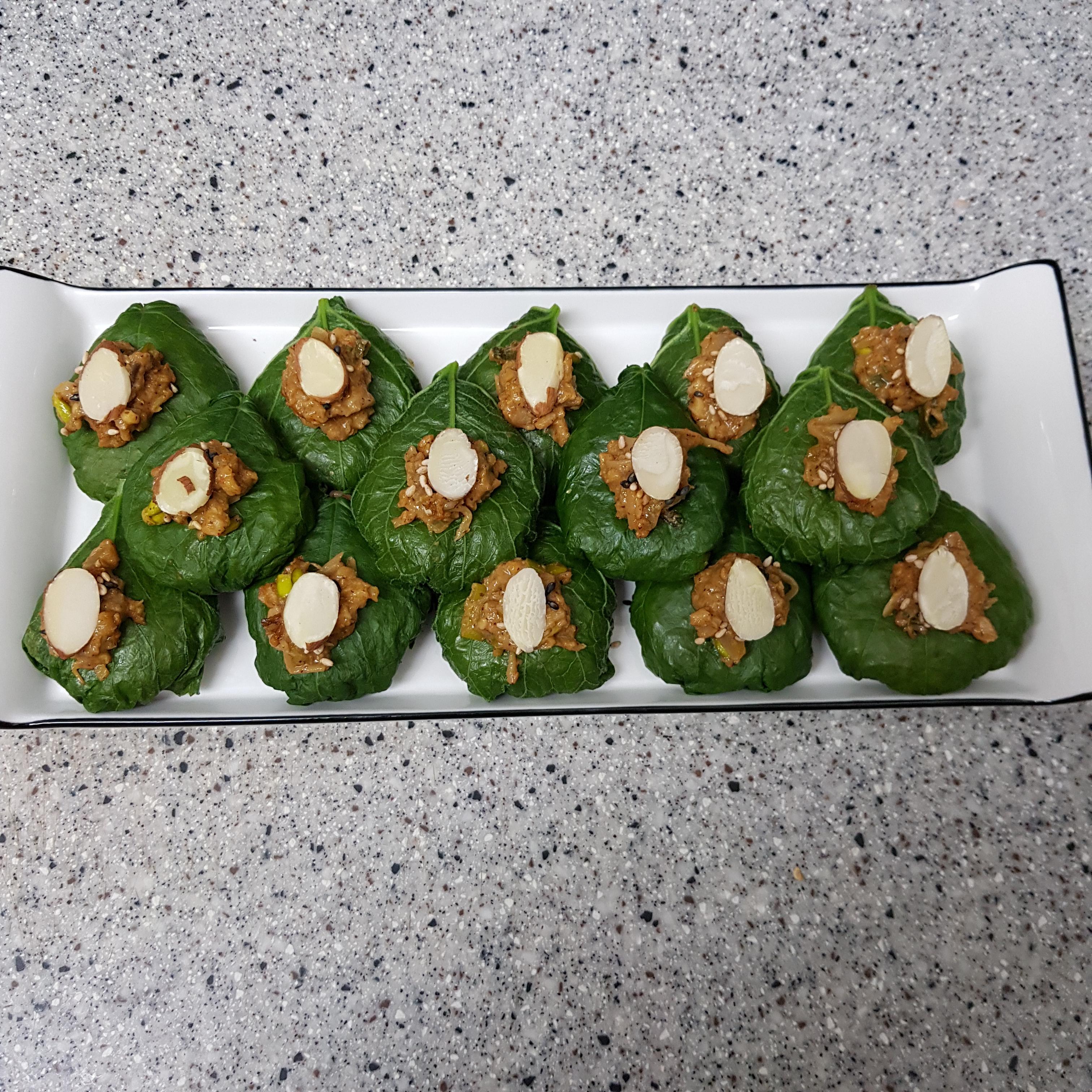 ▶ 곰취나물은 줄기를 잘라내주고 밥 1큰술을 올려 사진과 같이 싸서 준비해주세요