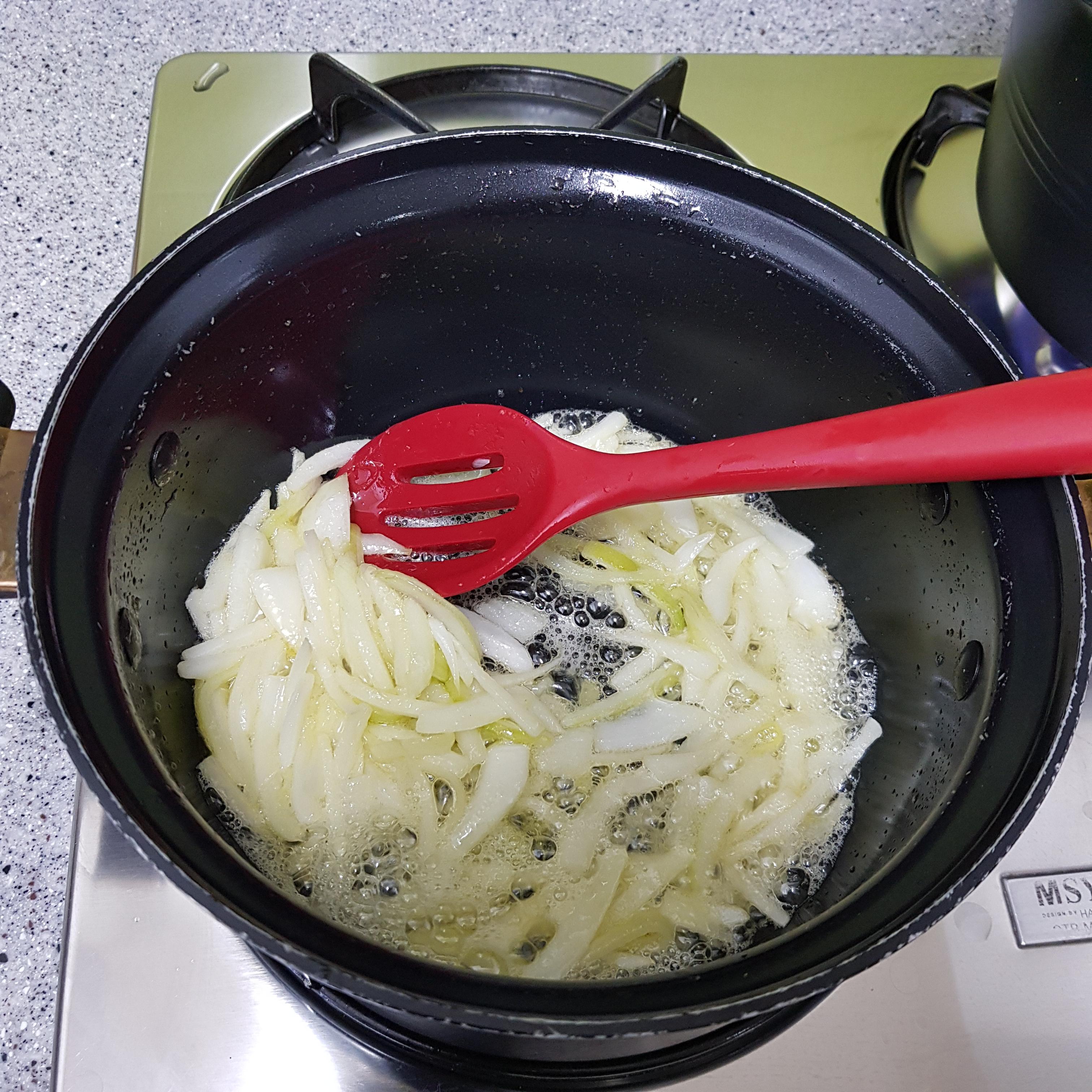 ▶ 양파 반개를 채 썰어준 후 버터 넣고 노릇노릇하게 볶아주세요
