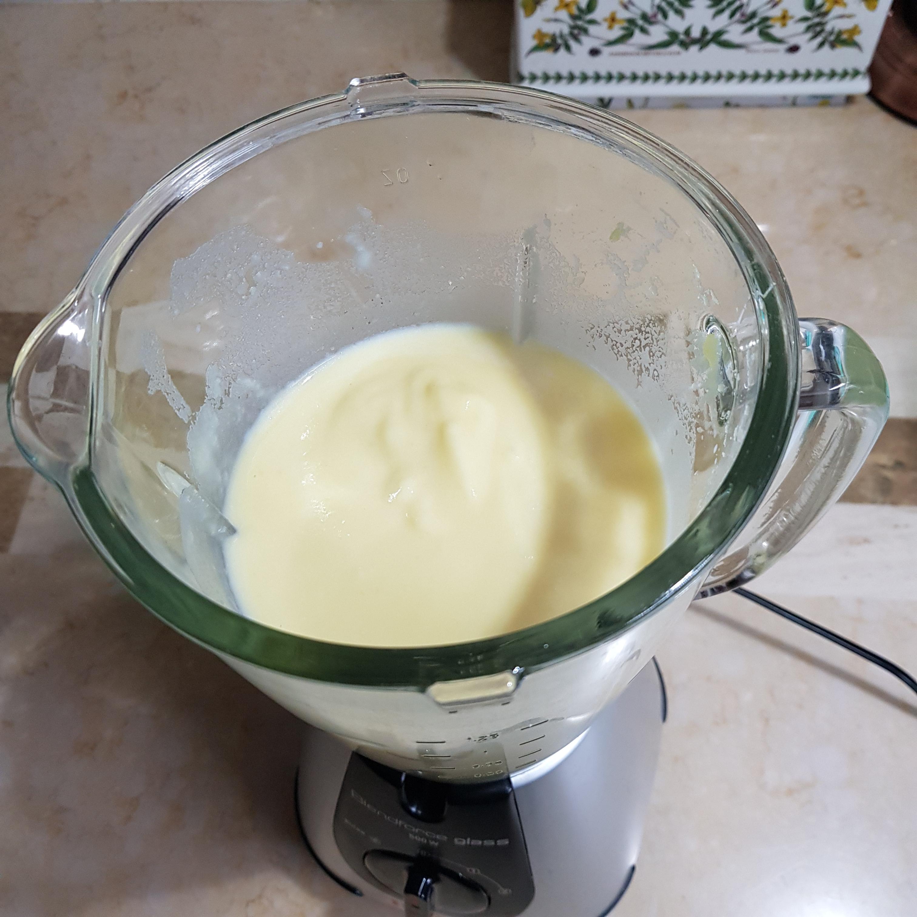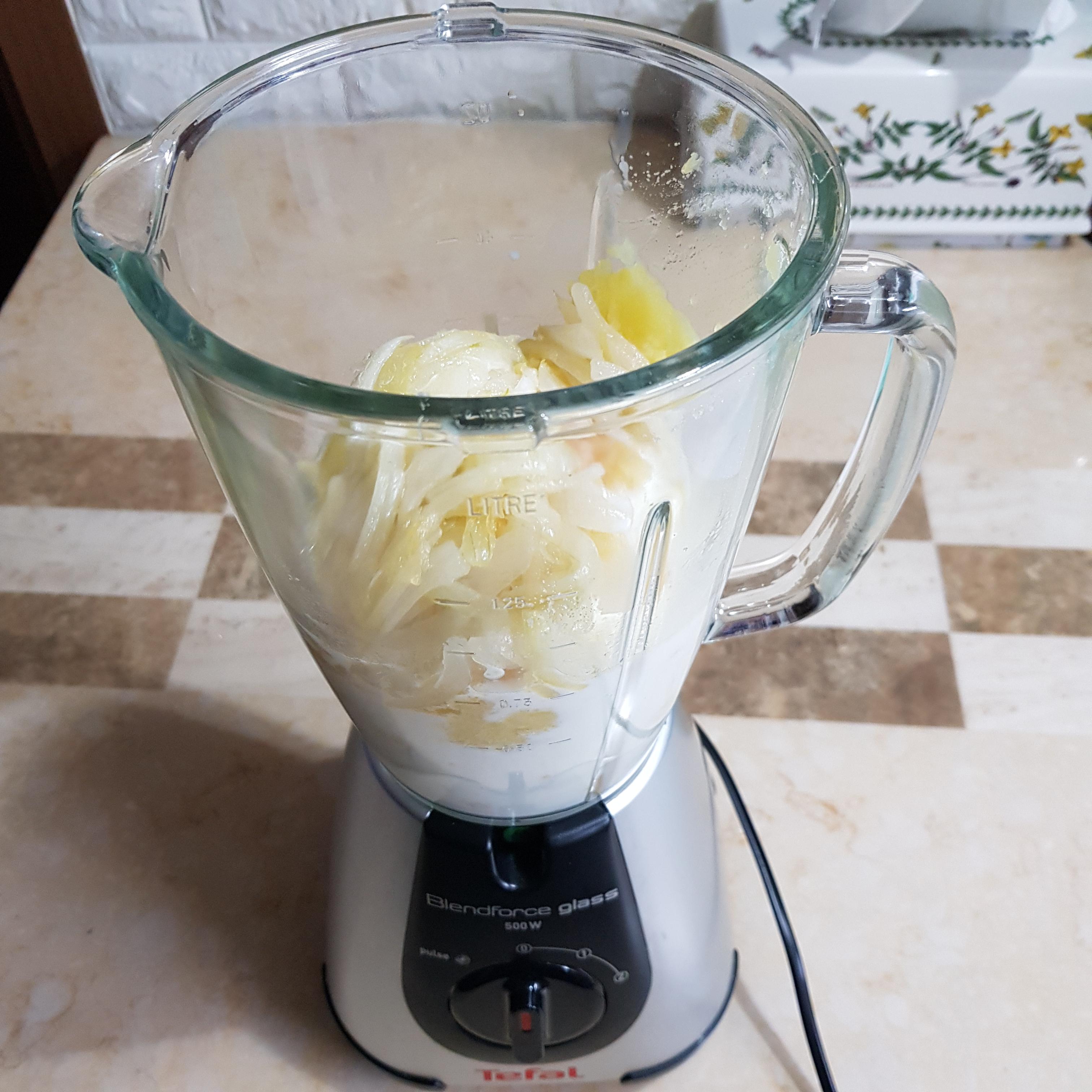 ▶ 믹서기에 삶은 감자, 볶음 양파를 넣고 우유 3컵을 넣어 곱게 갈아주세요 참고로 걸쭉한 걸 좋아하시면 우유량을 적게, 부드러운 걸 좋아하시면 우유량을 많게 취향껏 조절하여 넣어주시면 된답니다