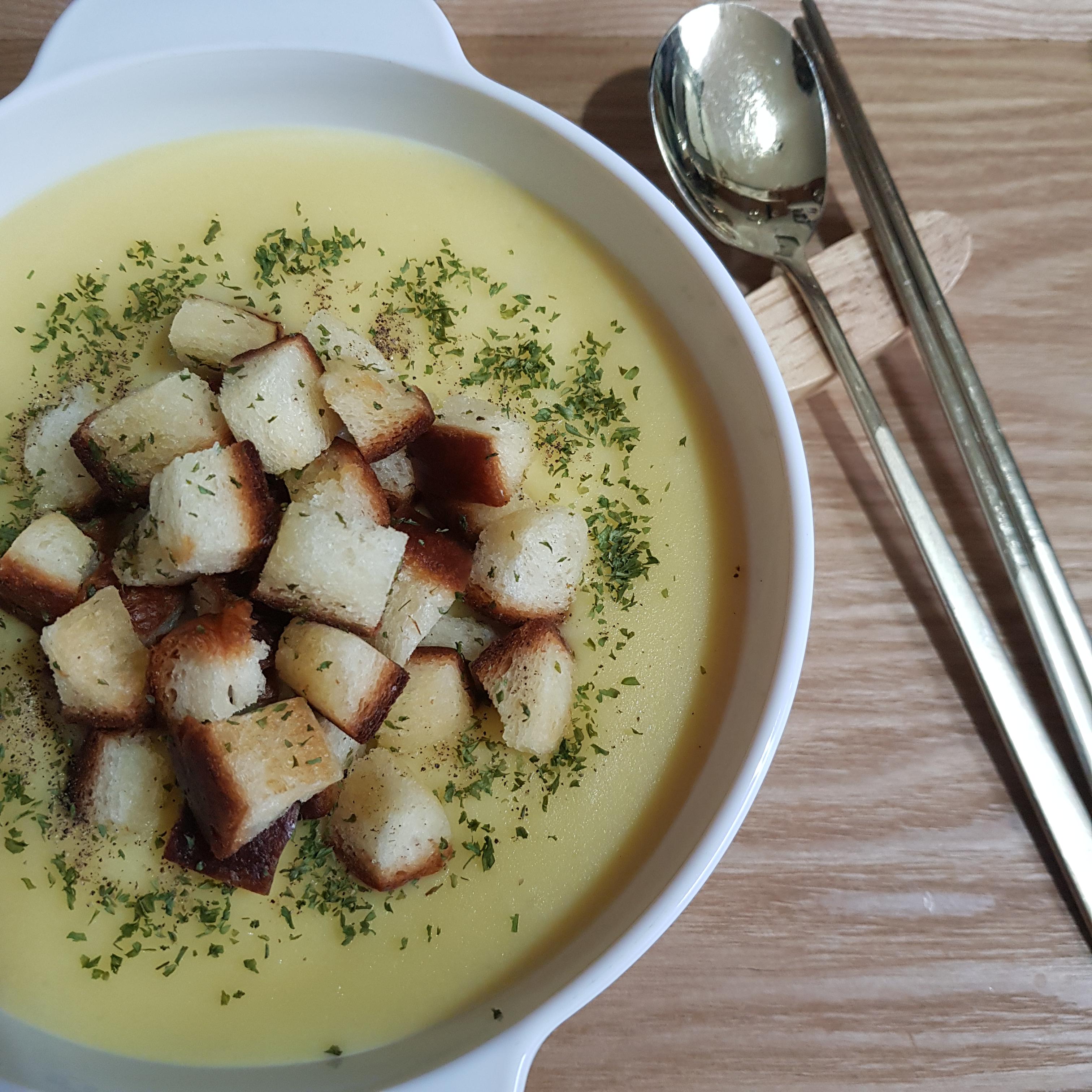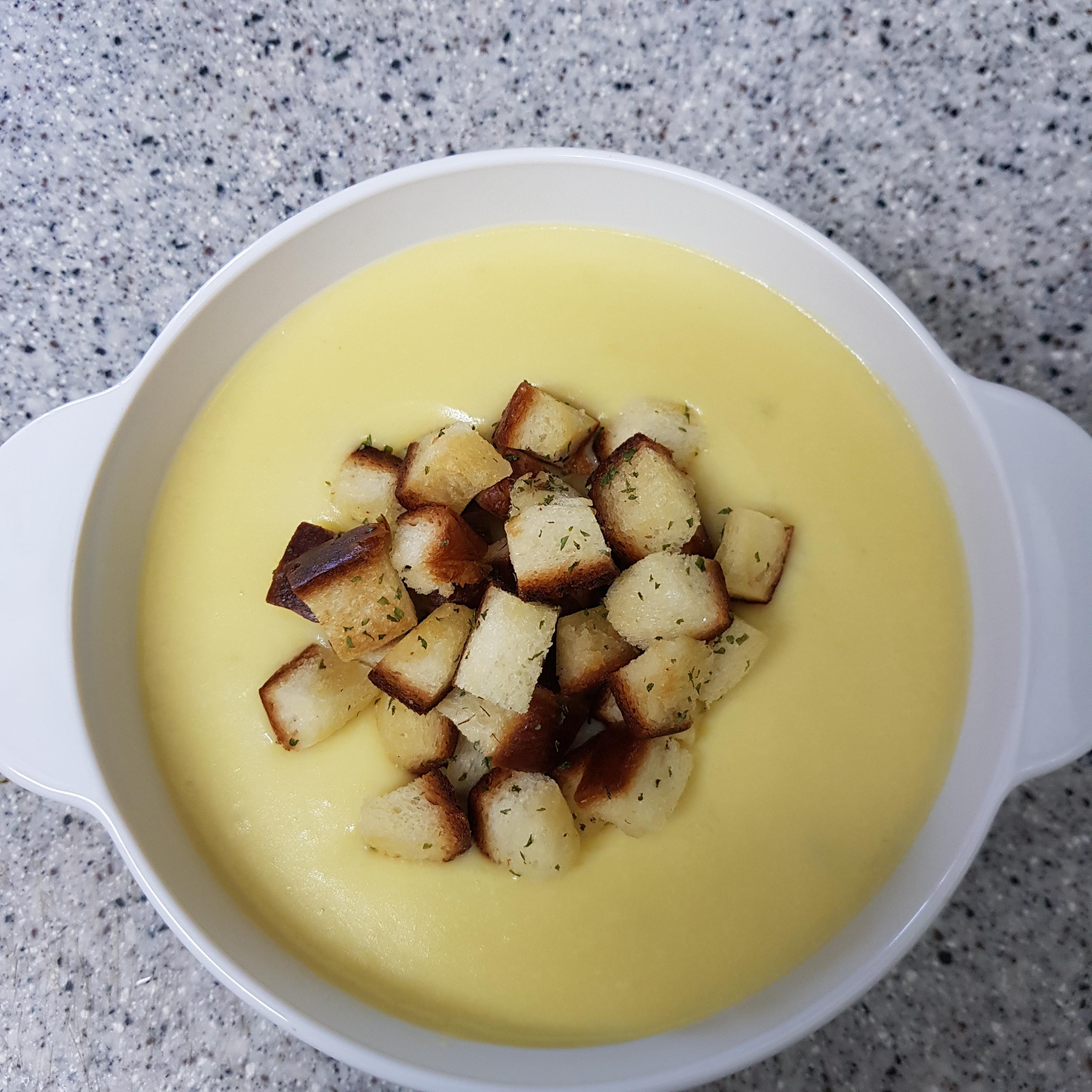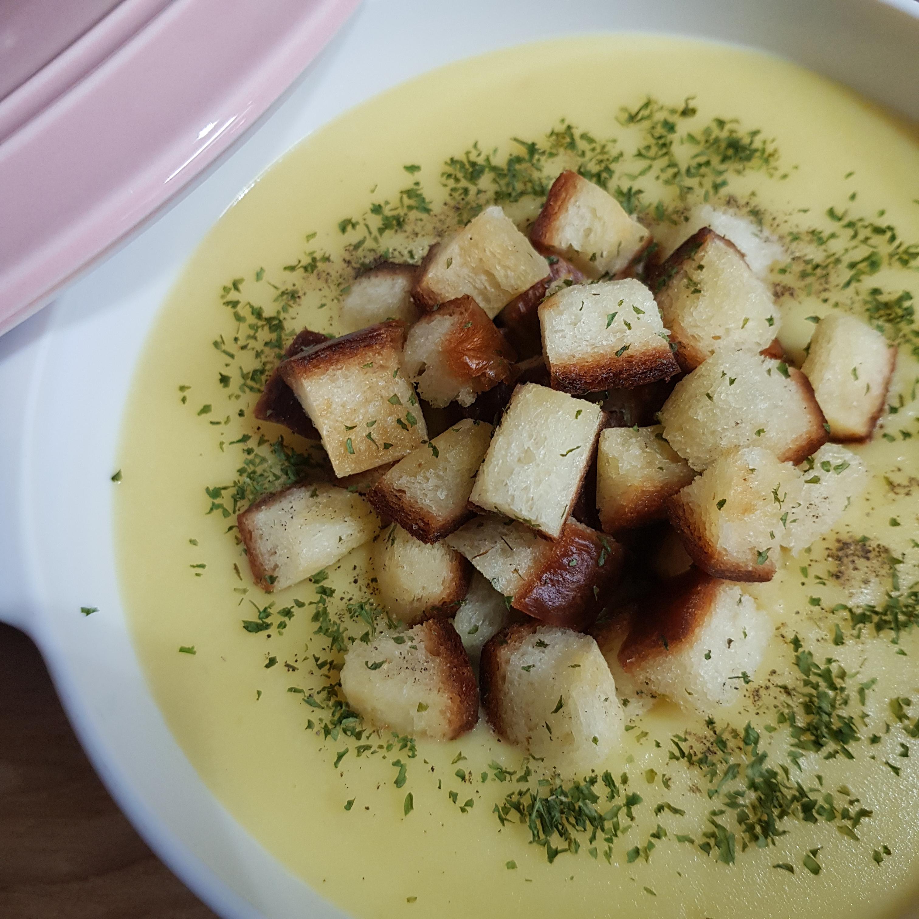▶ 적당한 크기의 그릇에 백종원 감자스프를 옮겨 담고 식빵으로 만든 크루통을 얹어주세요 저는 씹는 식감도 더해줄 크루통을 조금 많이 얹어주었답니다