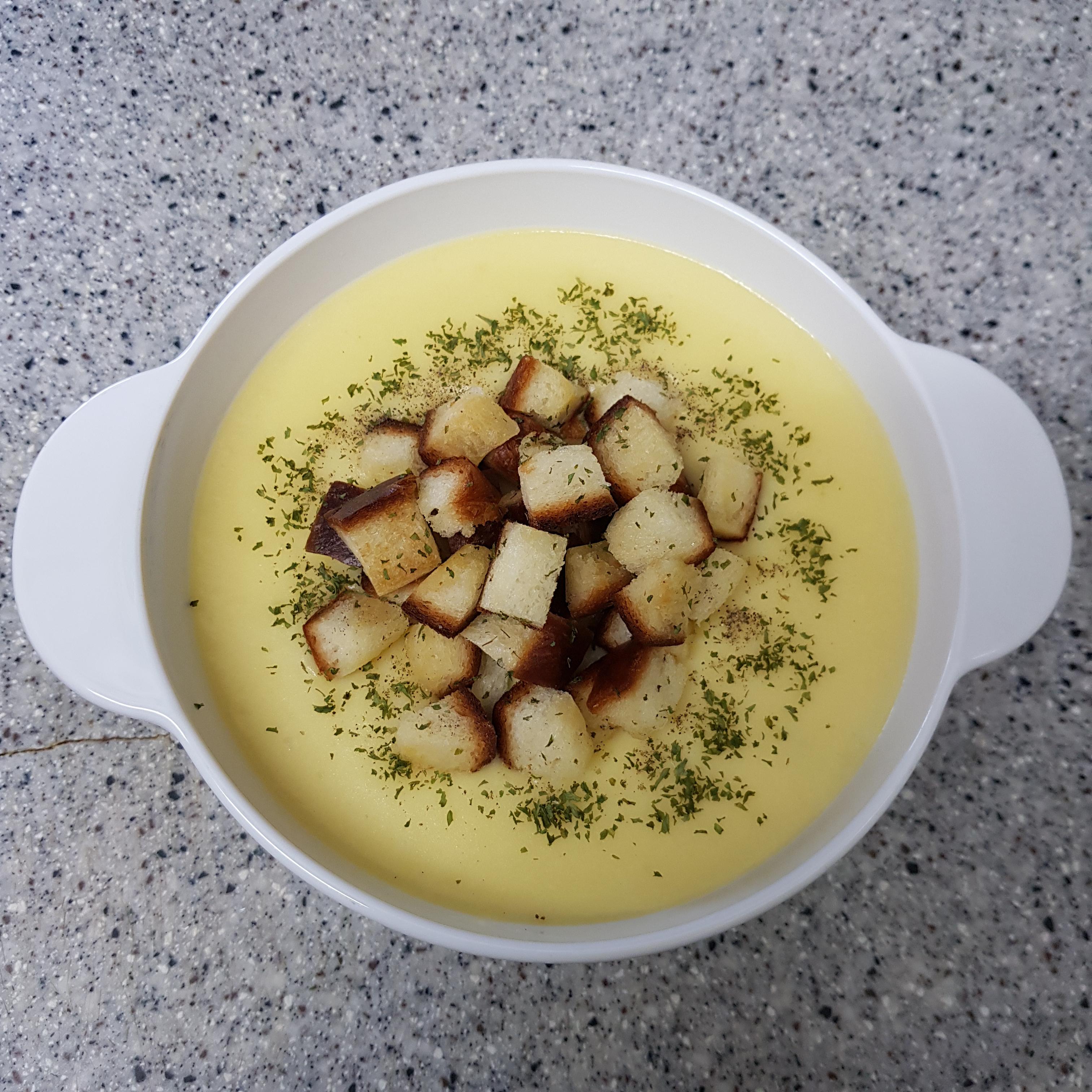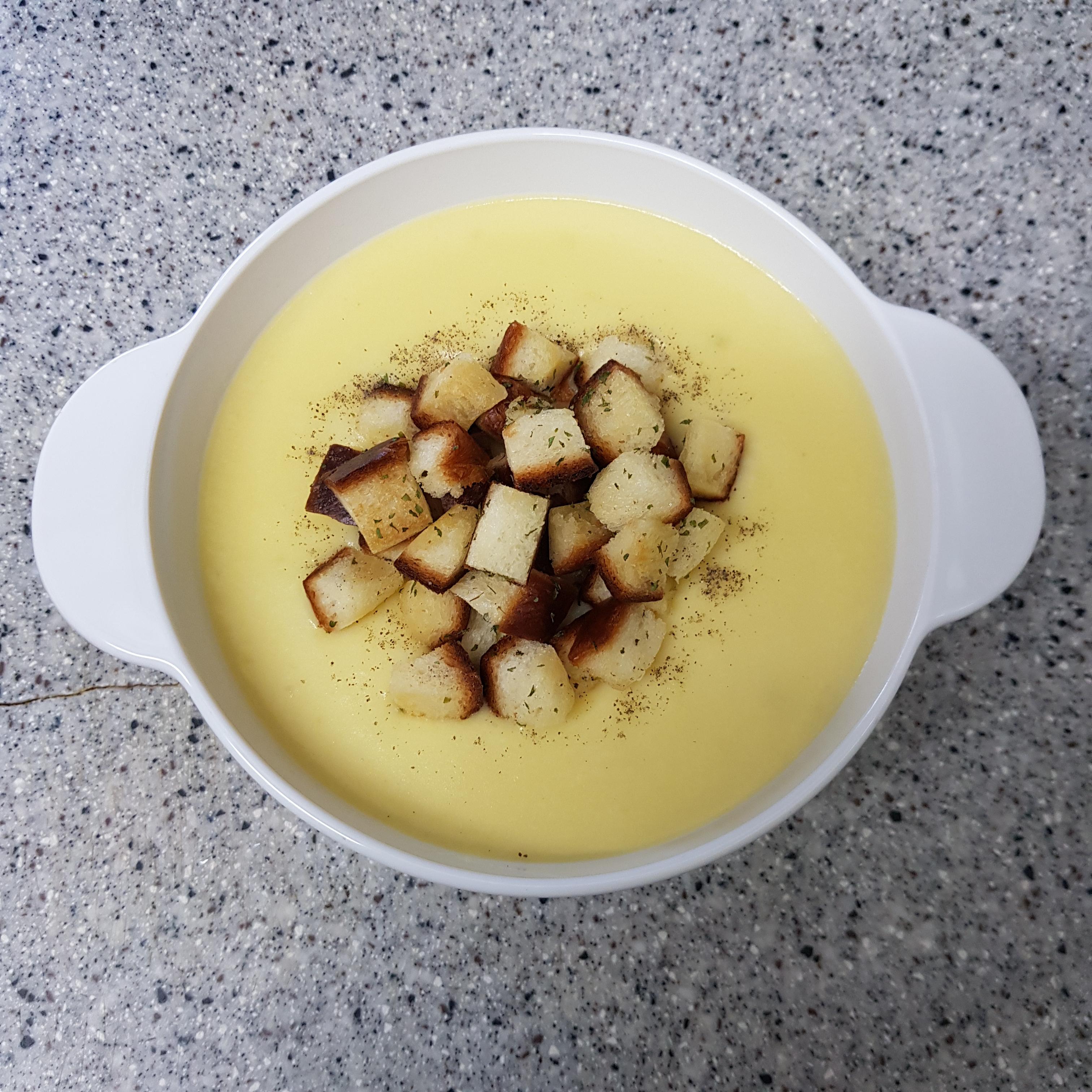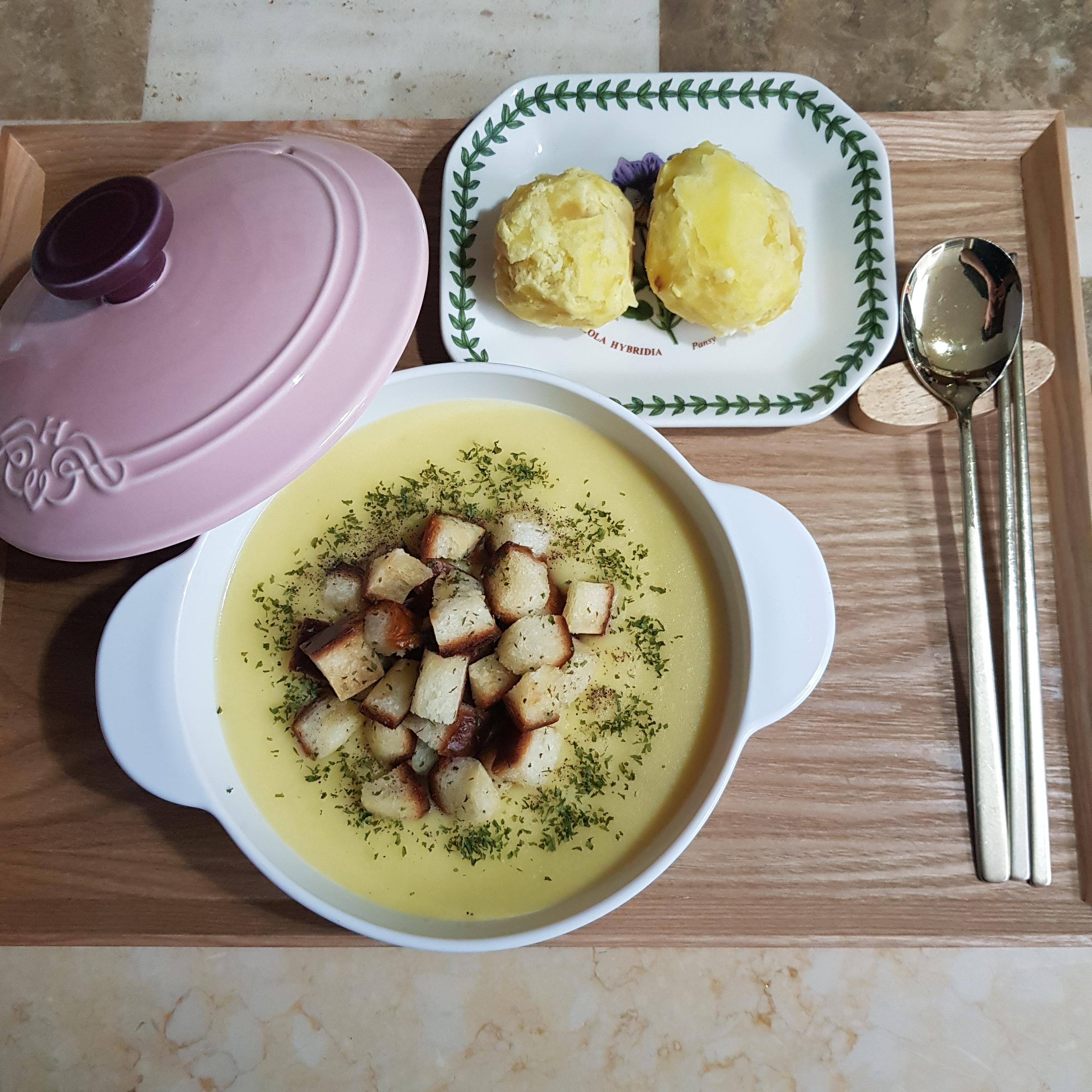 ▶ 적당한 크기의 그릇에 백종원 감자스프를 옮겨 담고 식빵으로 만든 크루통을 얹어주세요 저는 씹는 식감도 더해줄 크루통을 조금 많이 얹어주었답니다