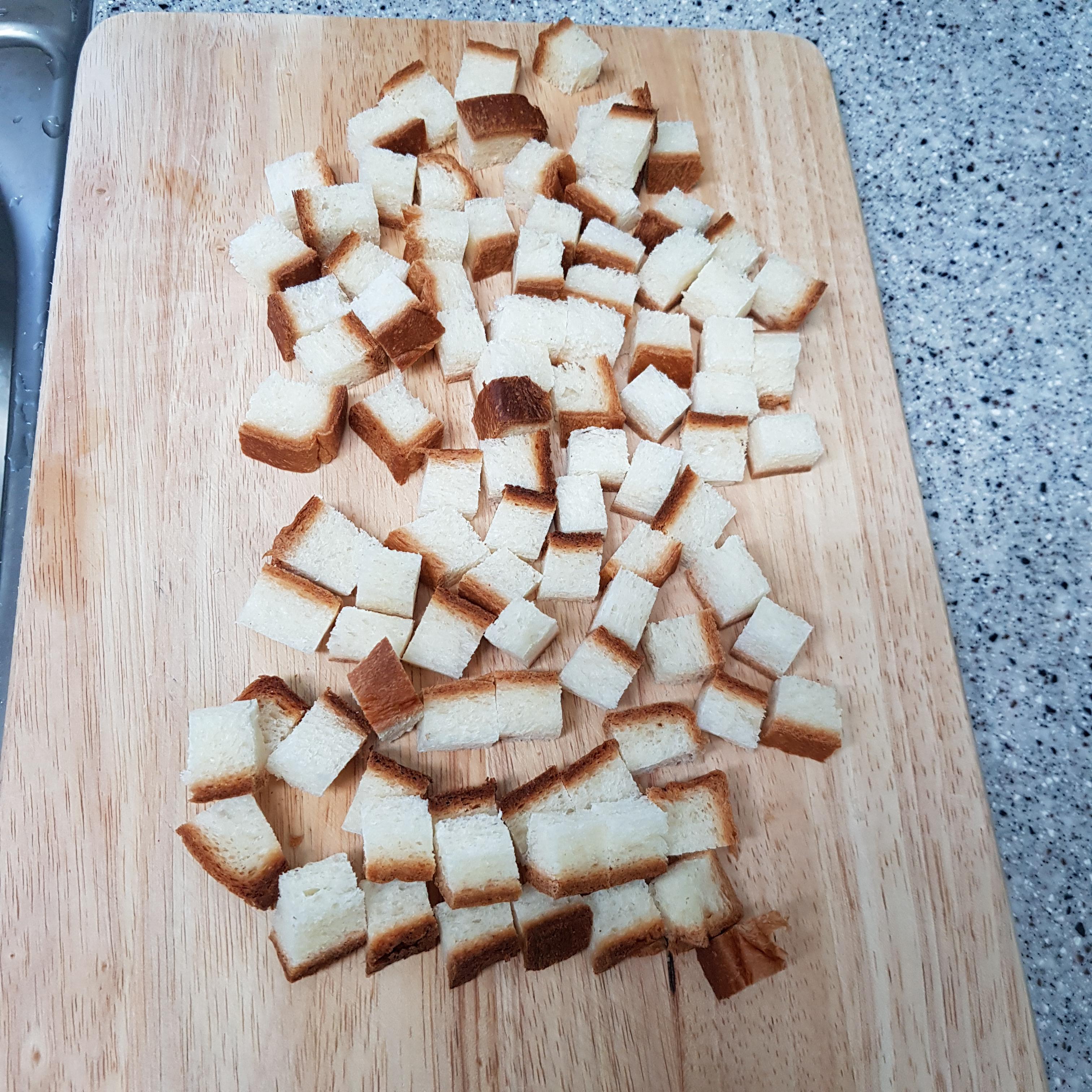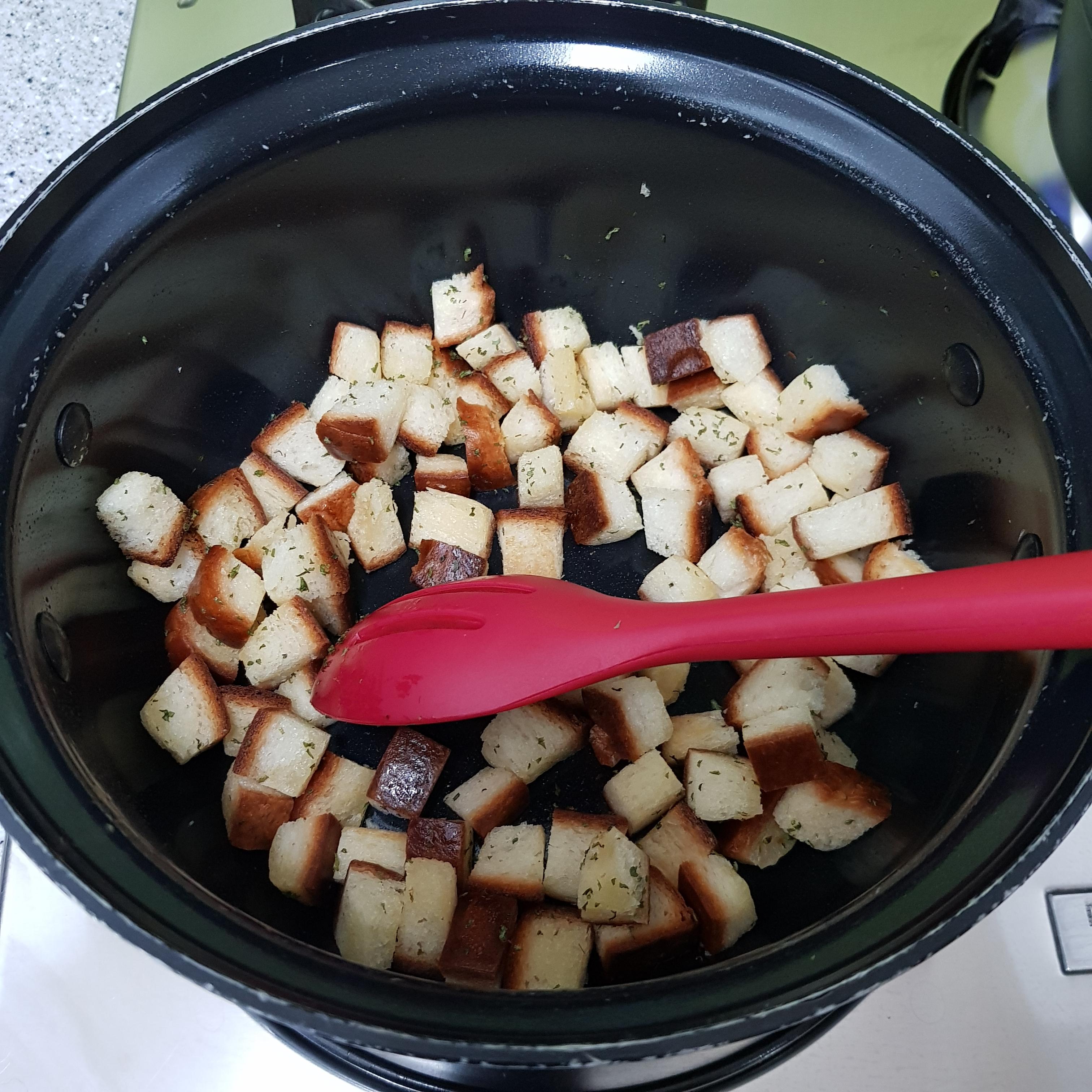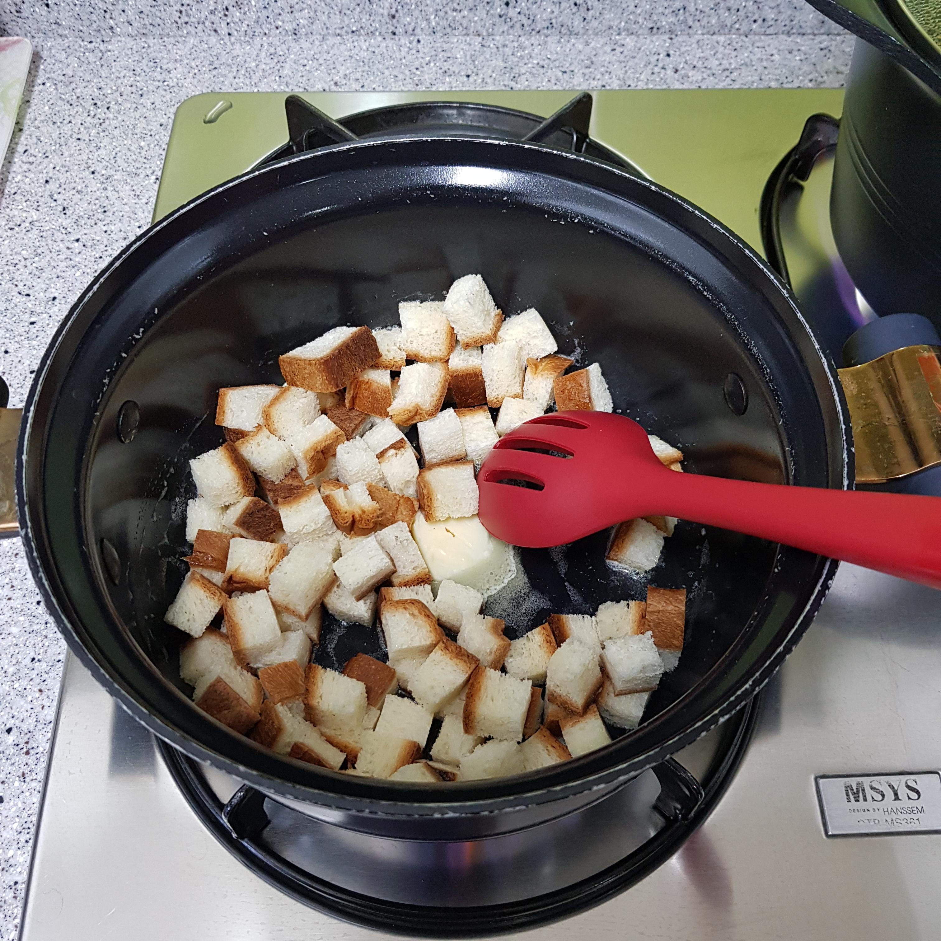▶ 식빵 테두리는 1.5cm 정도로 깍둑썰기 해 냄비에 버터 넣고 볶아준 후 불을 끄고 파슬리가루 약간 뿌려 식빵 크루통을 만들어주세요 김밥도 꼬투리가 맛있듯이 저는 식빵도 테두리가 더 맛있더라고요^^ 그래서 저는 빵을 약간 많이 준비했답니다 참고해주세요