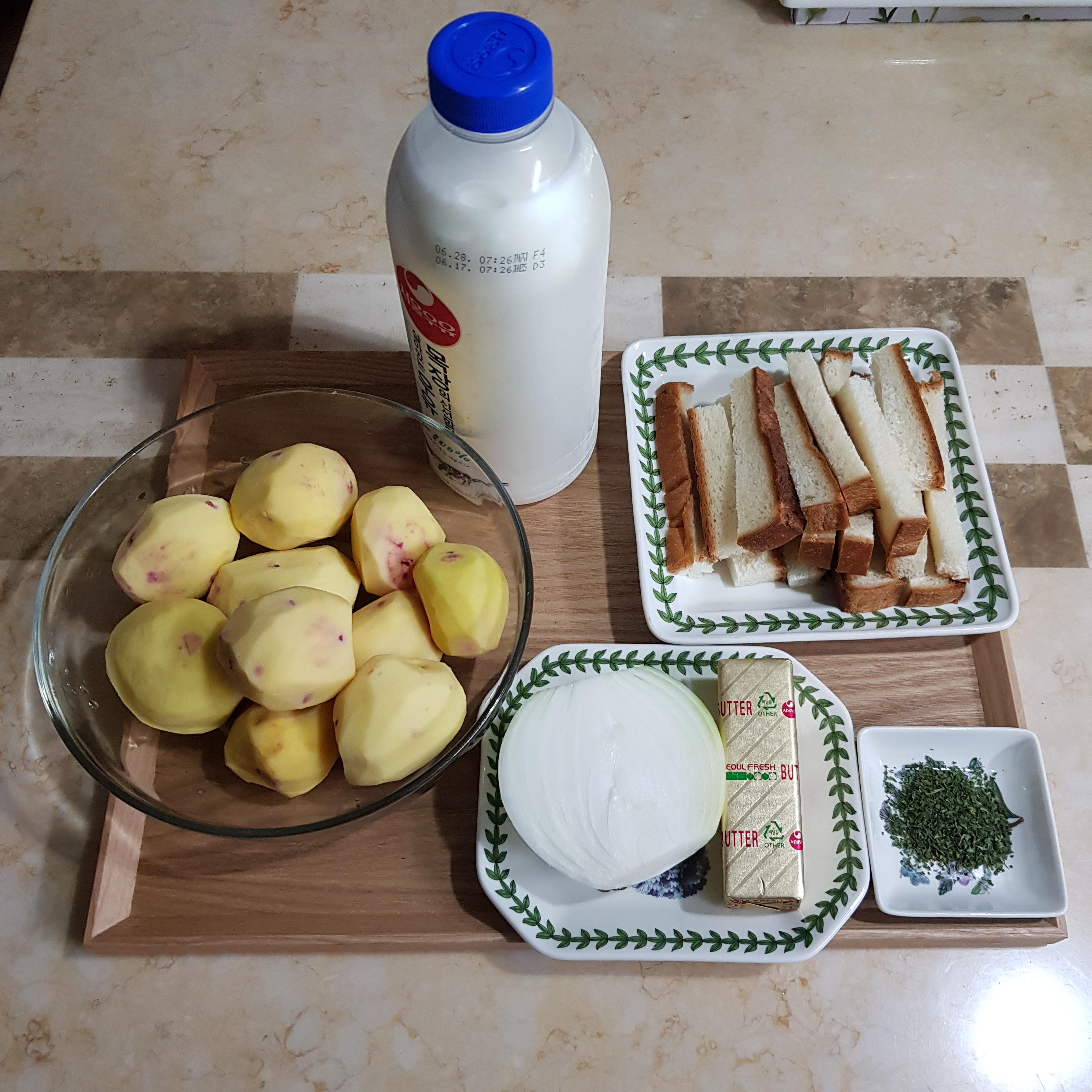 홍감자 530g, 우유 3컵, 자투리 식빵 100g, 양파 반개(170g), 버터 70g, 후춧가루 약간+파슬리가루 1티스푼(고명용), 꽃소금 반큰술(감자 삶는용)