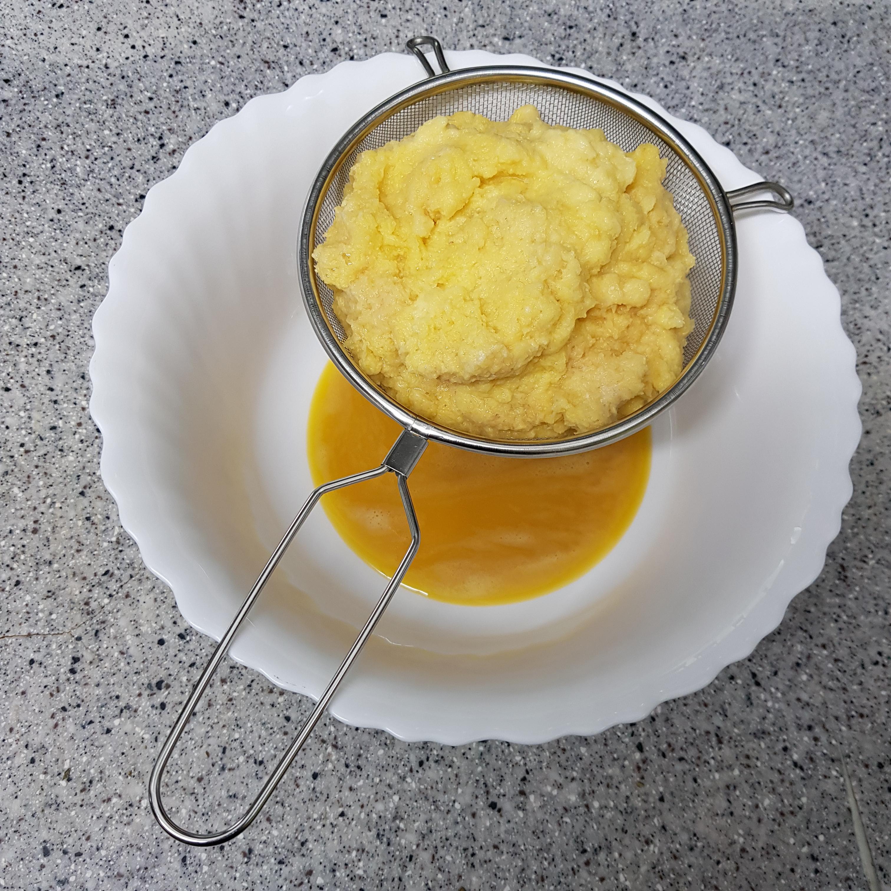 ▶ 강판에 갈아준 감자는 체에 밭쳐 건더기와 수분을 분리해주세요 수분 속 앙금을 가라 앉혀 반죽에 사용할 거랍니다