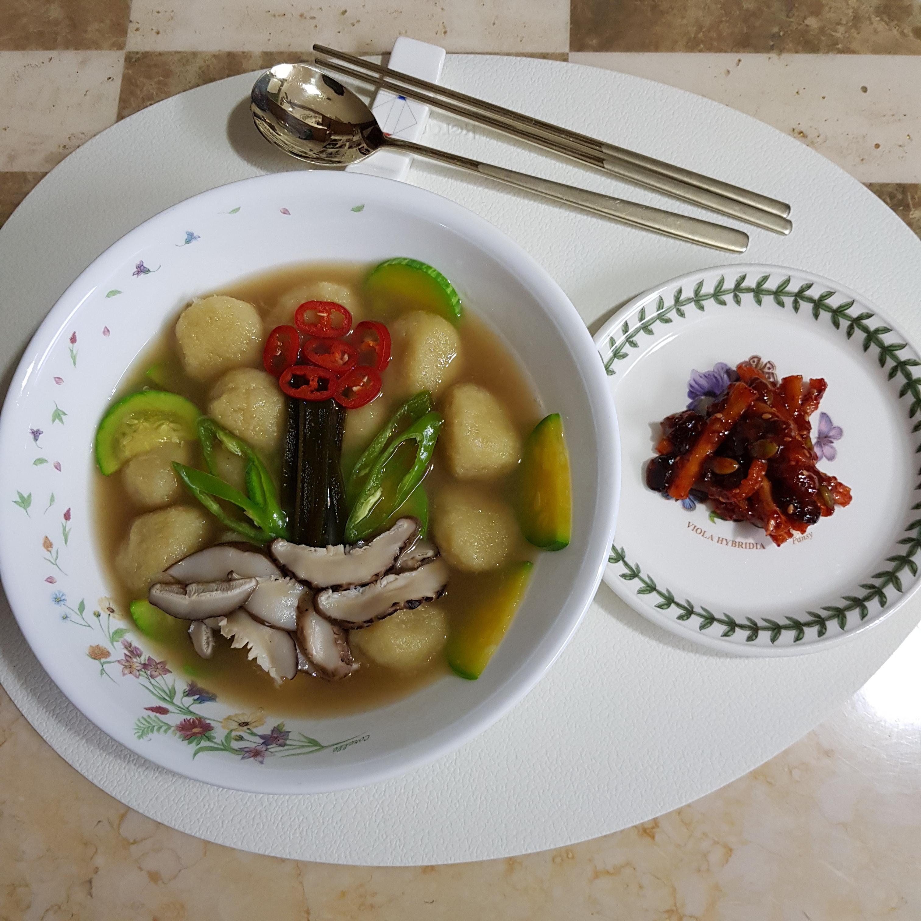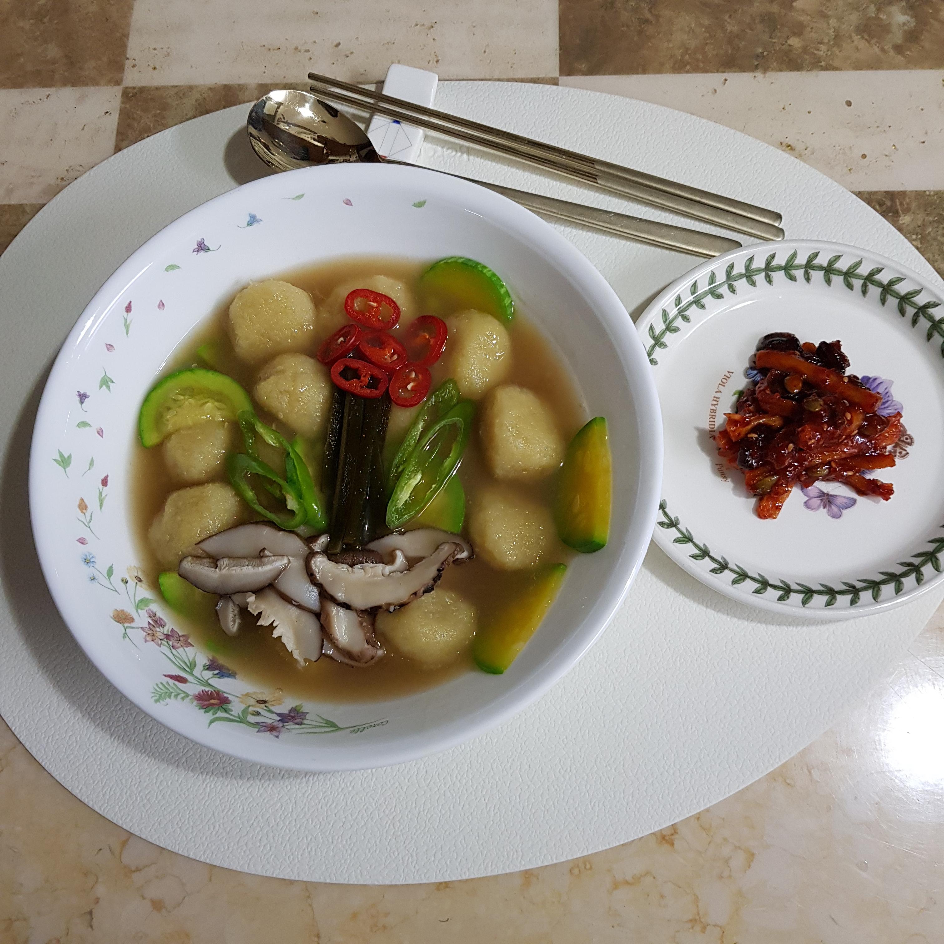 ▶ 감자옹심이가 떠오르면 다 익었다는 증거예요 이때 반달 썰기 해 준비한 애호박을 넣어주세요 참고로 육수는 간단하게 시판용 육수 티백을 사용하시면 더욱 편리하답니다
