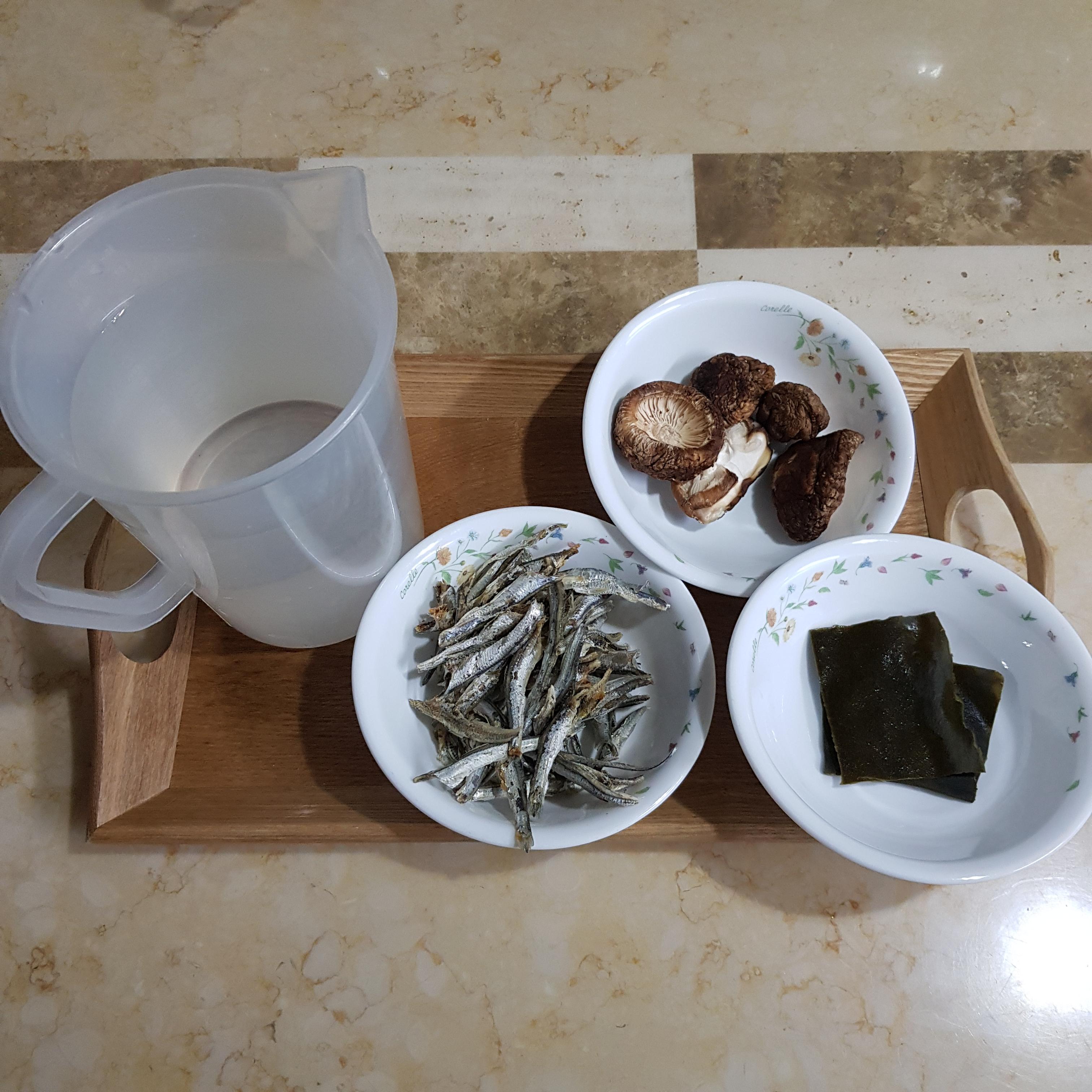 물 1L, 건표고버섯 30g, 국물용 볶음 멸치 30g, 다시마 2장(가로 세로 5cm 크기)