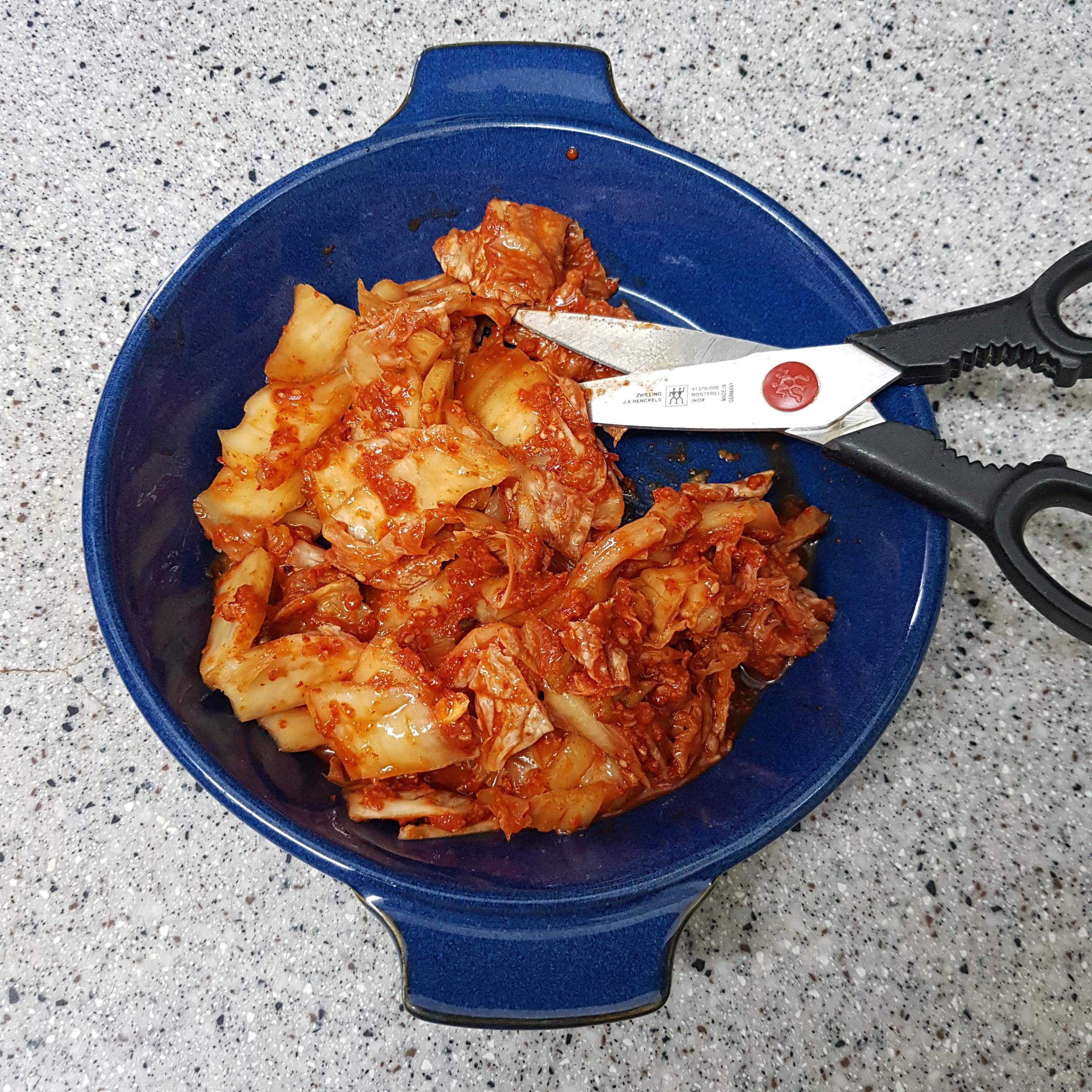 ▶ 볼 또는 그릇에 담은 김치는 가위로 대략 1~2cm 정도 잘게 잘라주세요