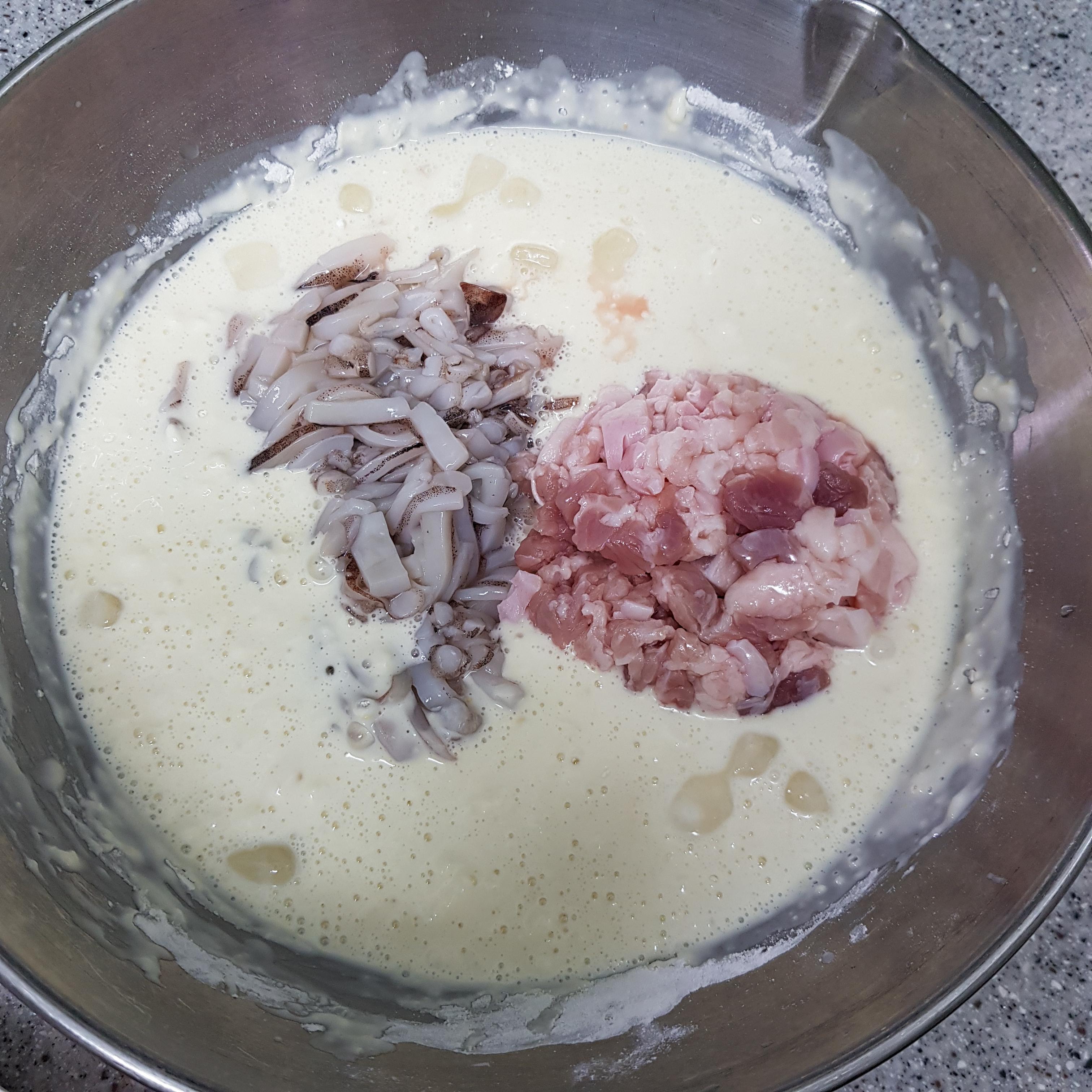 ▶ 부침가루 1컵반, 튀김가루 1컵반, 손질해 준비한 오징어와 삼겹살을 넣어주세요