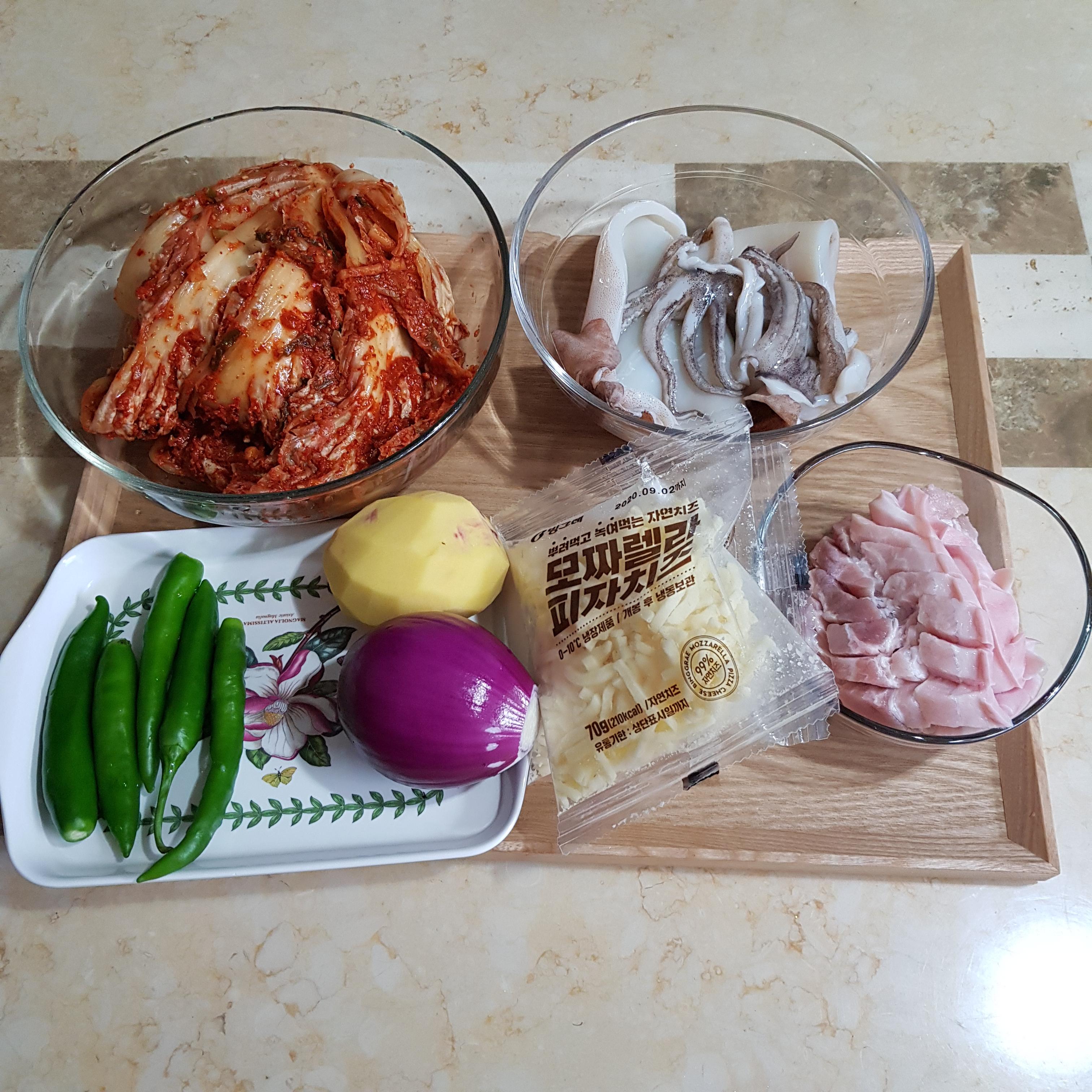 잘 익은 김치 1/4포기, 오징어 300g, 삼겹살 250g, 모짜렐라치즈 140g, 양파 140g, 감자 150g, 청양고추 5개