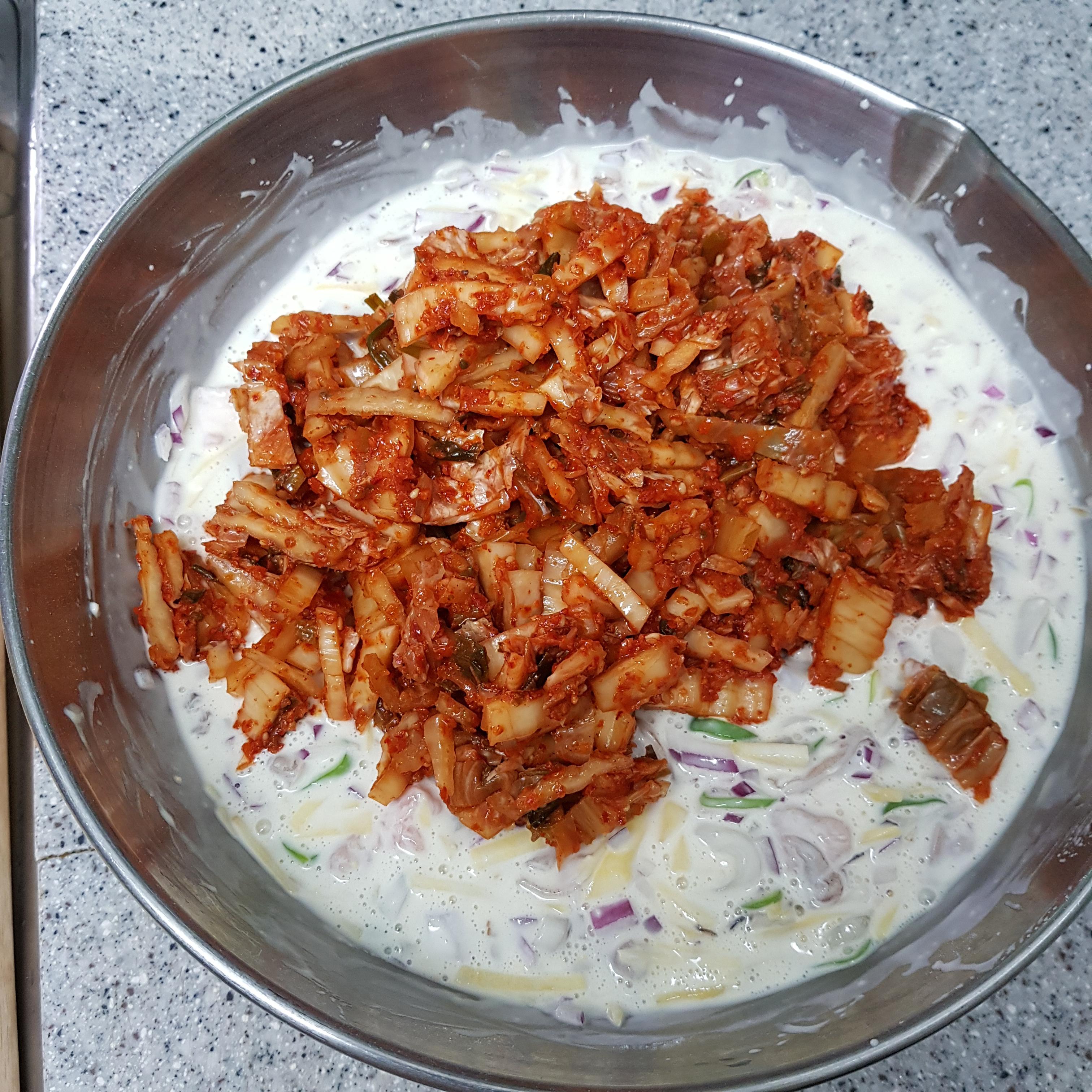 햇볕이 쨍쨍한 날에는 바삭바삭해 맛있고 요즘같이 비 내리는 장마철에 빗소리 들으며 먹는 전만큼 맛있는 요리가 있을까요? ^^ 전 부치는소리, 빗소리 합창하는날 잘 어울리는 지글지글 김치전 황금레시피입니다 얼마 전 미우새에서 홍자매가 만든 김치전 보고 집에 있는 묵은지 다 먹기 전에 꼭 한번 따라 해봐야지 싶어 오늘 만들어봤어요 씹히는 식감이 싫어 재료를 몽땅 믹서기에 갈아 우유에 반죽을 만들어 김치전을 만들더라고요 근데 저는 씹히는 식감을 더 좋아해 재료를 잘게 채 썰고 다져 조금 다르게 만들어봤어요 삼겹살, 오징어, 치즈가 들어가 초보자도 전이 아니라 일품요리가 되는 김치전 황금레시피 지금 소개해드릴게요