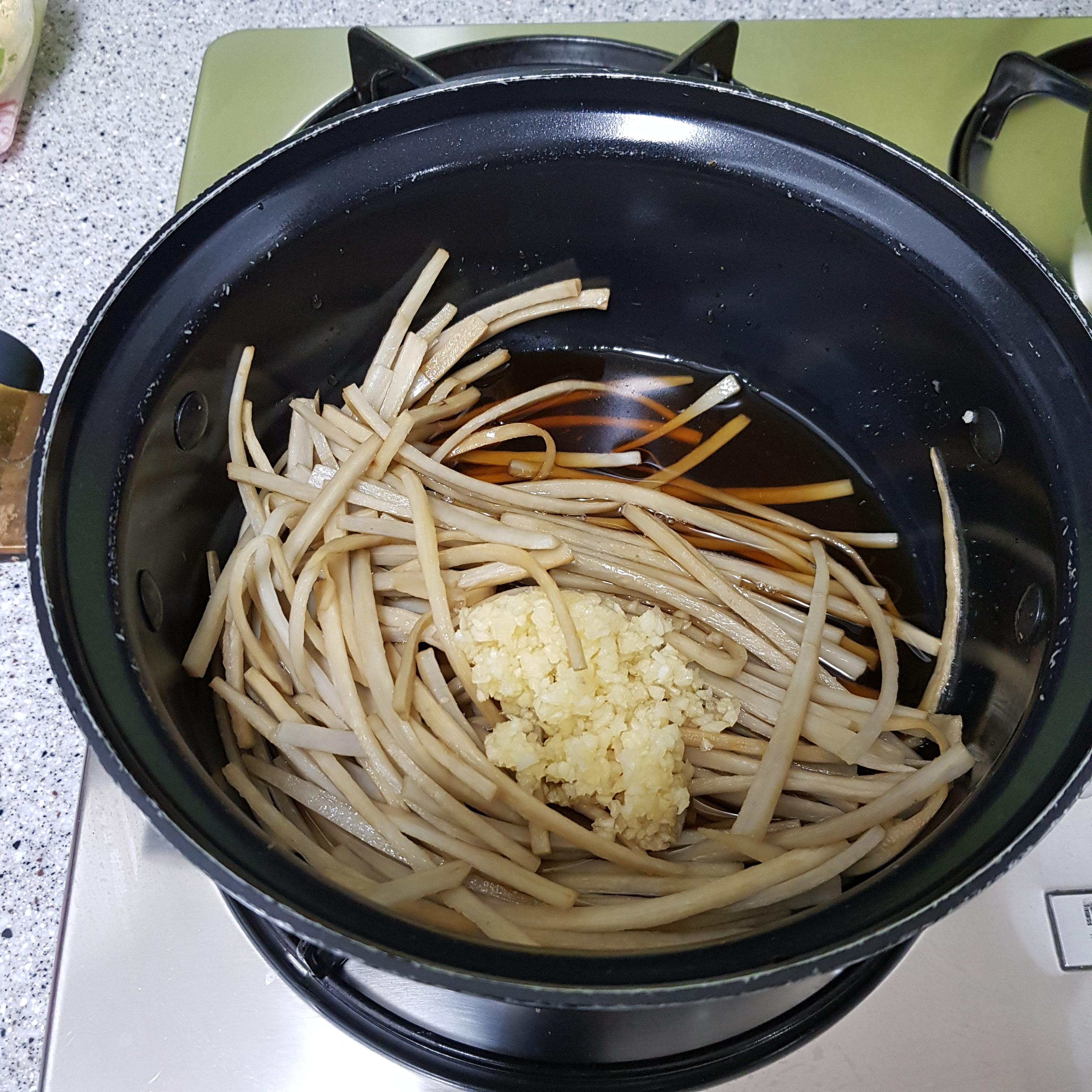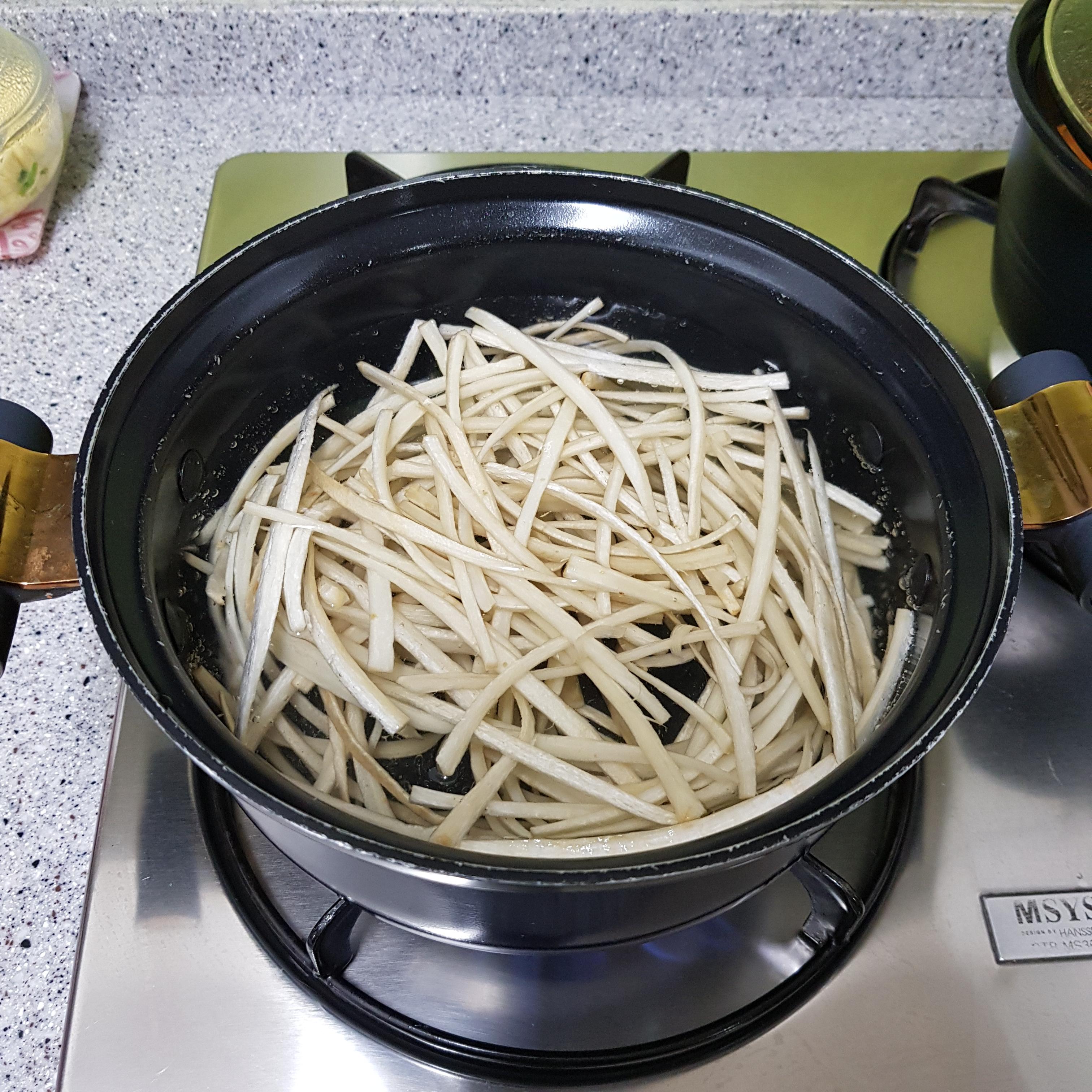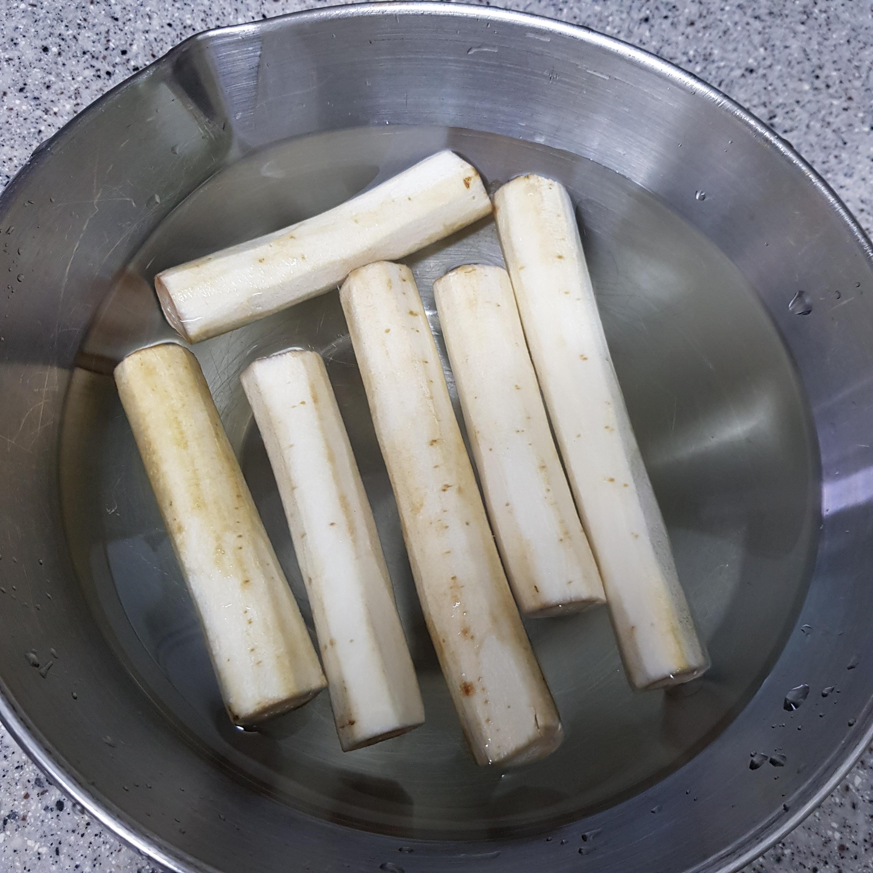 ▶ 갈변현상과 아린 맛 제거를 위해 끓는 물에 식초 3큰술 정도 넣고 2분 정도 데친 후 냉수에 헹궈주고 채반에 밭쳐 물기를 빼주세요