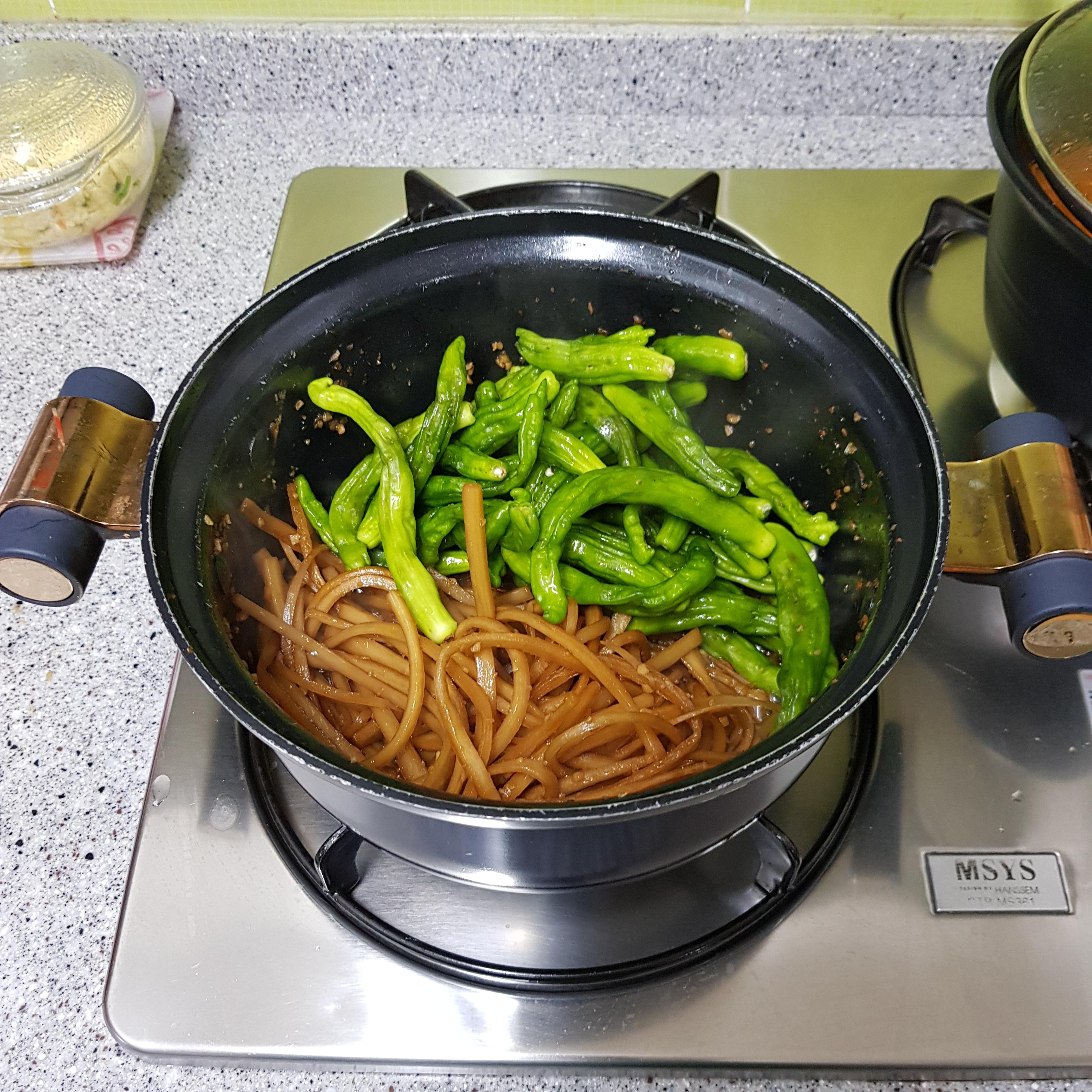 ▶ 우엉조림 양념장이 1큰술 정도 남았을 때 고운 소금에 절여 준비한 꽈리고추를 넣어주세요