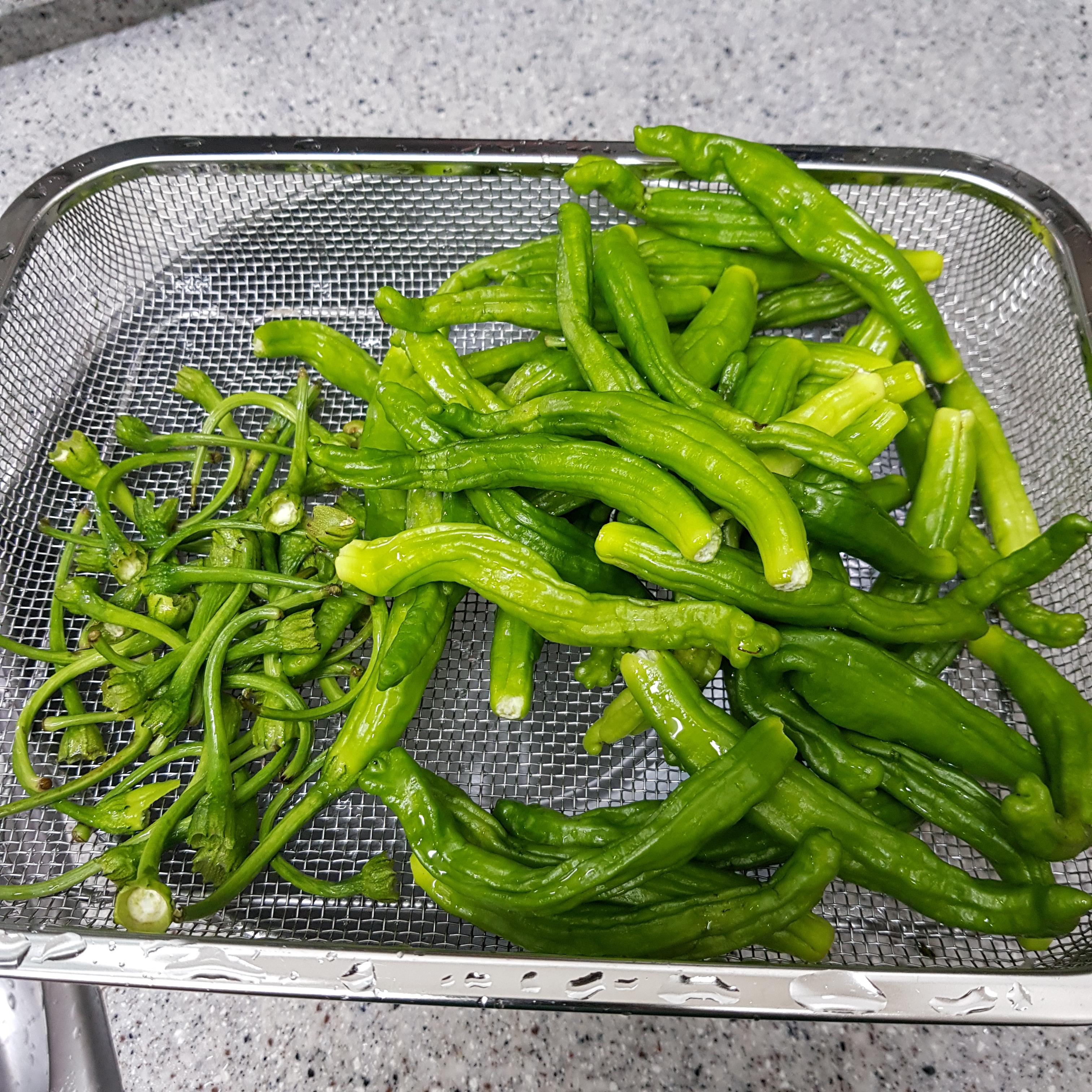 ▶ 꽈리고추는 깨끗이 씻은 후 꼭지를 제거하고 포크를 사용해 콕콕 찍어 구멍을 내주세요 구멍을 내준 후 볼에다 넣고 고운 소금 1티스푼 넣어 20분 정도 절여서 준비해주세요