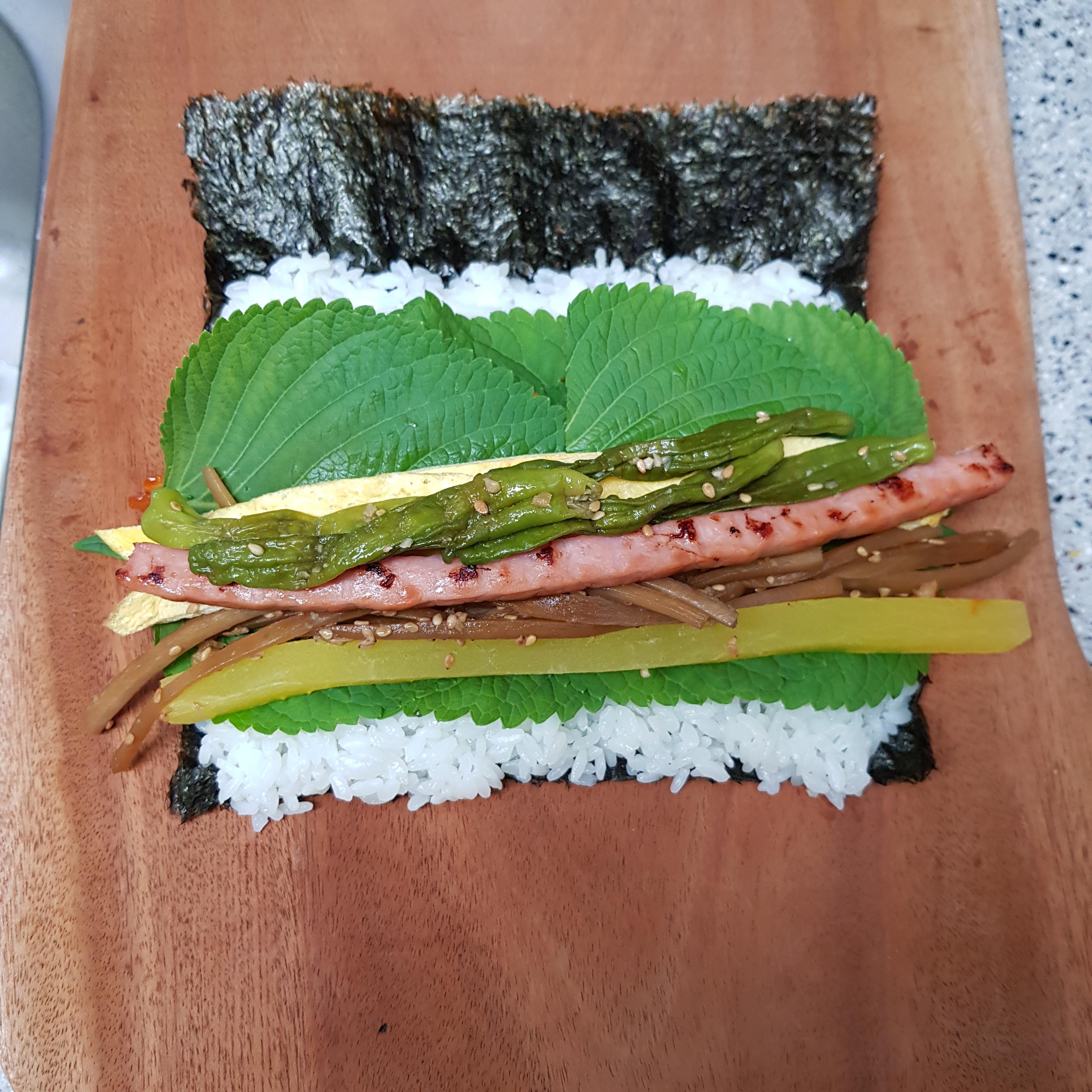 ▶ 햄, 꽈리고추 올려주고 돌돌 말아주면 진미채김밥 완성입니다^^