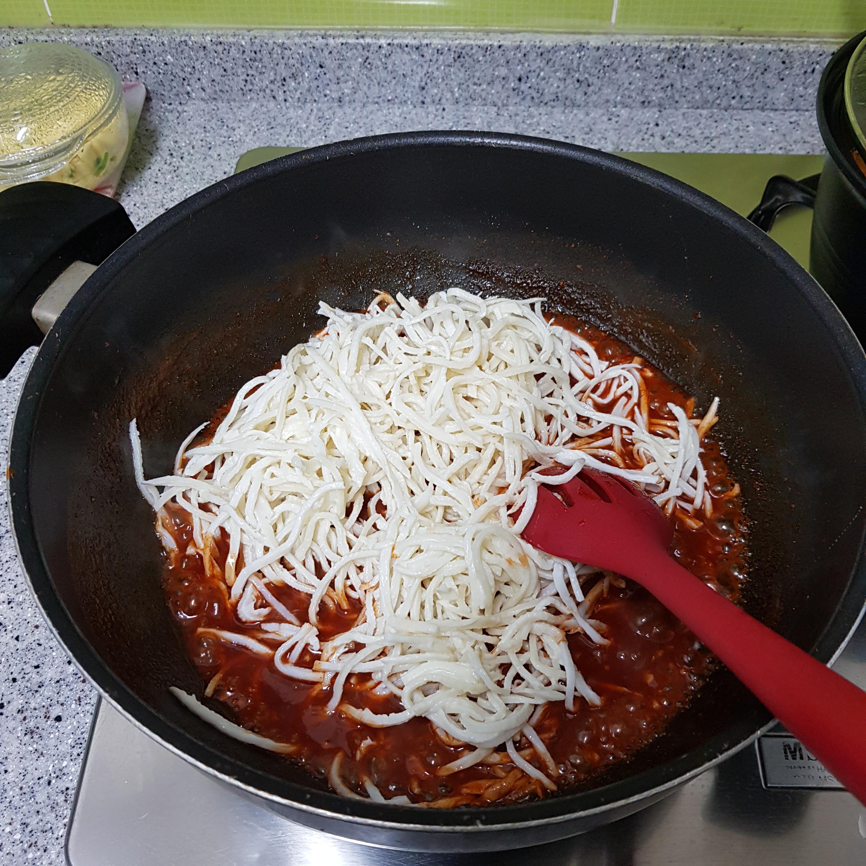 ▶ 양념장을 골고루 섞어주고 센 불에서 보글보글 끓인 후 준비한 진미채는 먹기 좋은 길이로 자른 후 넣고 볶아주세요 참고로 오래 볶지 않습니다