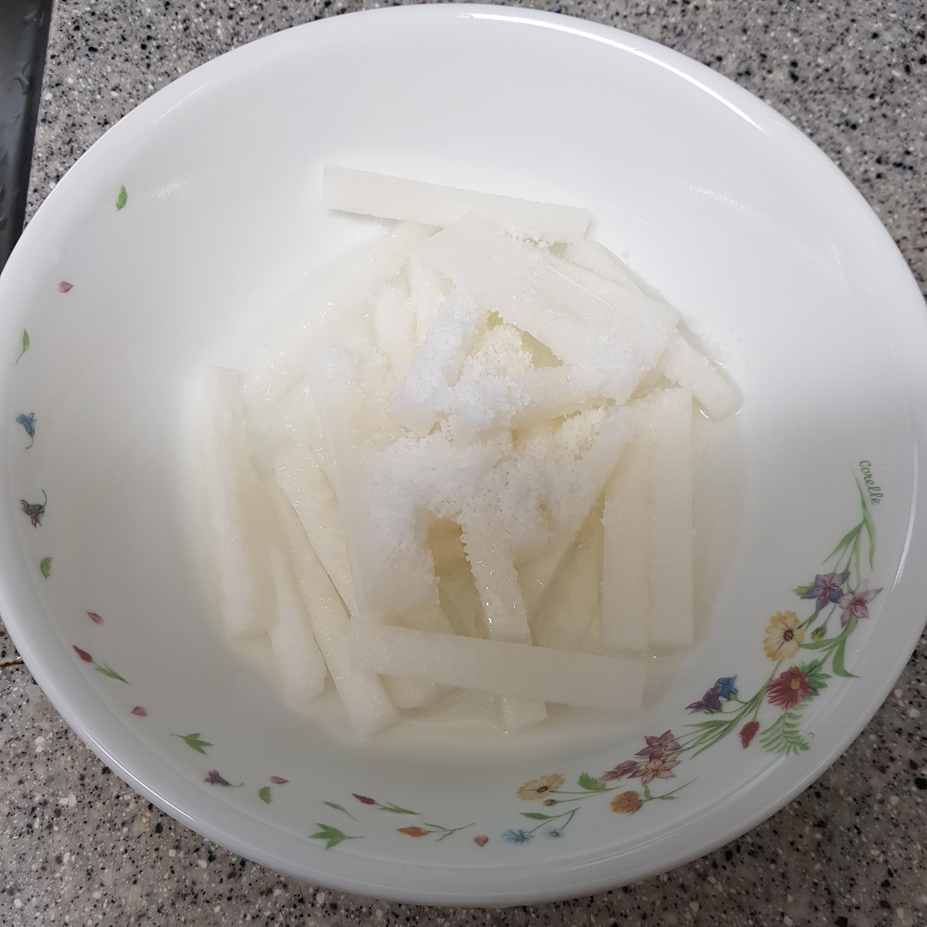 ▶ 먼저 무 200g을 0.5cm 정도 두께로 채 썰어준 후 물엿 반 컵, 꽃소금 1작은술 넣고 2시간 정도 절여서 준비해주세요 무가 절여지는 동안 나머지 재료 손질을 하시면됩니다 참고로 단맛이 덜한 여름 무는 물엿에 절이면 단맛이 베여 맛도 있을뿐더러 오독오독 씹히는 식감이 좋답니다 만약 무말랭이가 있다면 물에 불려 그대로 사용하셔도 된답니다
