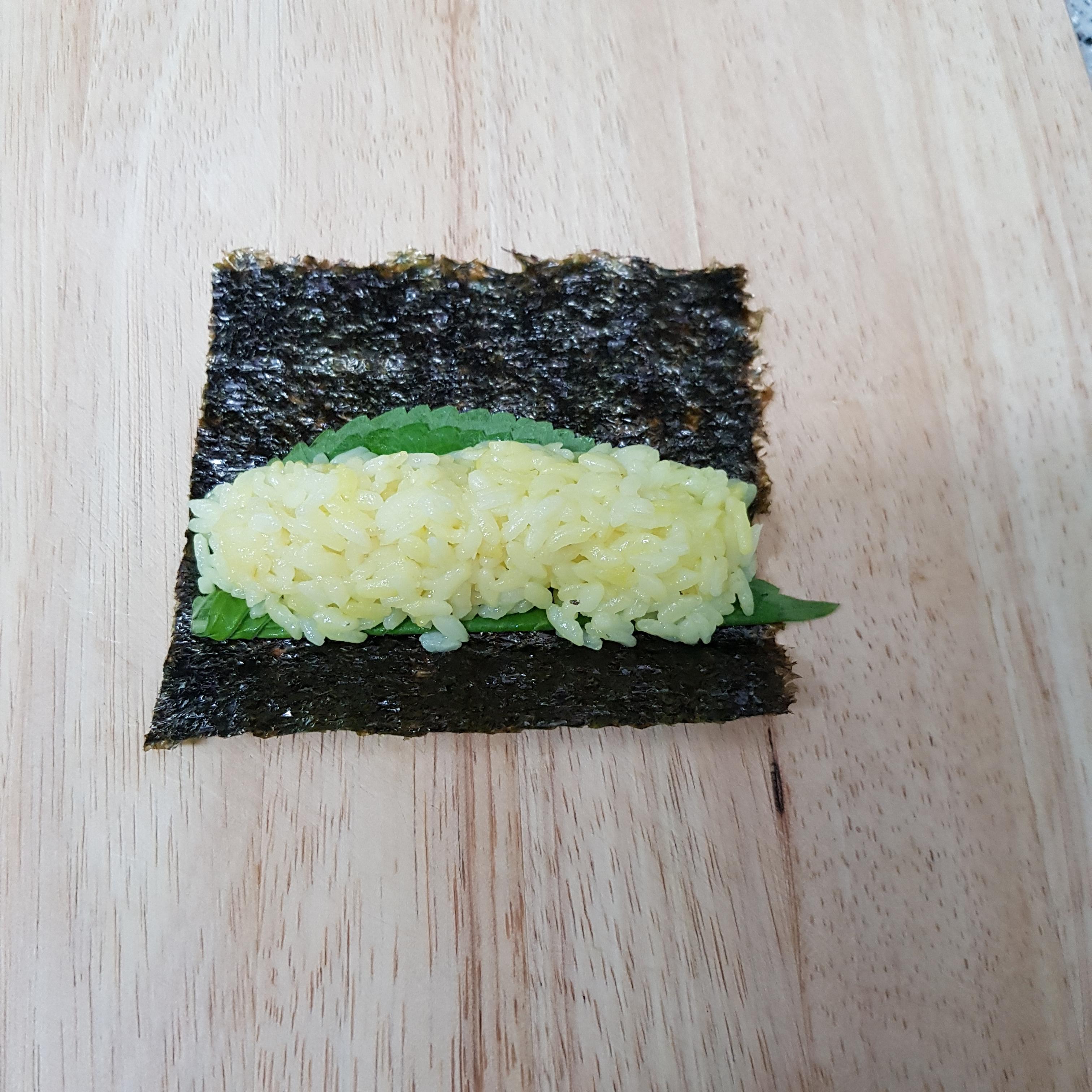 ▶ 4등분으로 자른 김 위에 깻잎 1장을 반으로 접어주고 그 위에 밥을 올린 후 돌돌 말아주세요