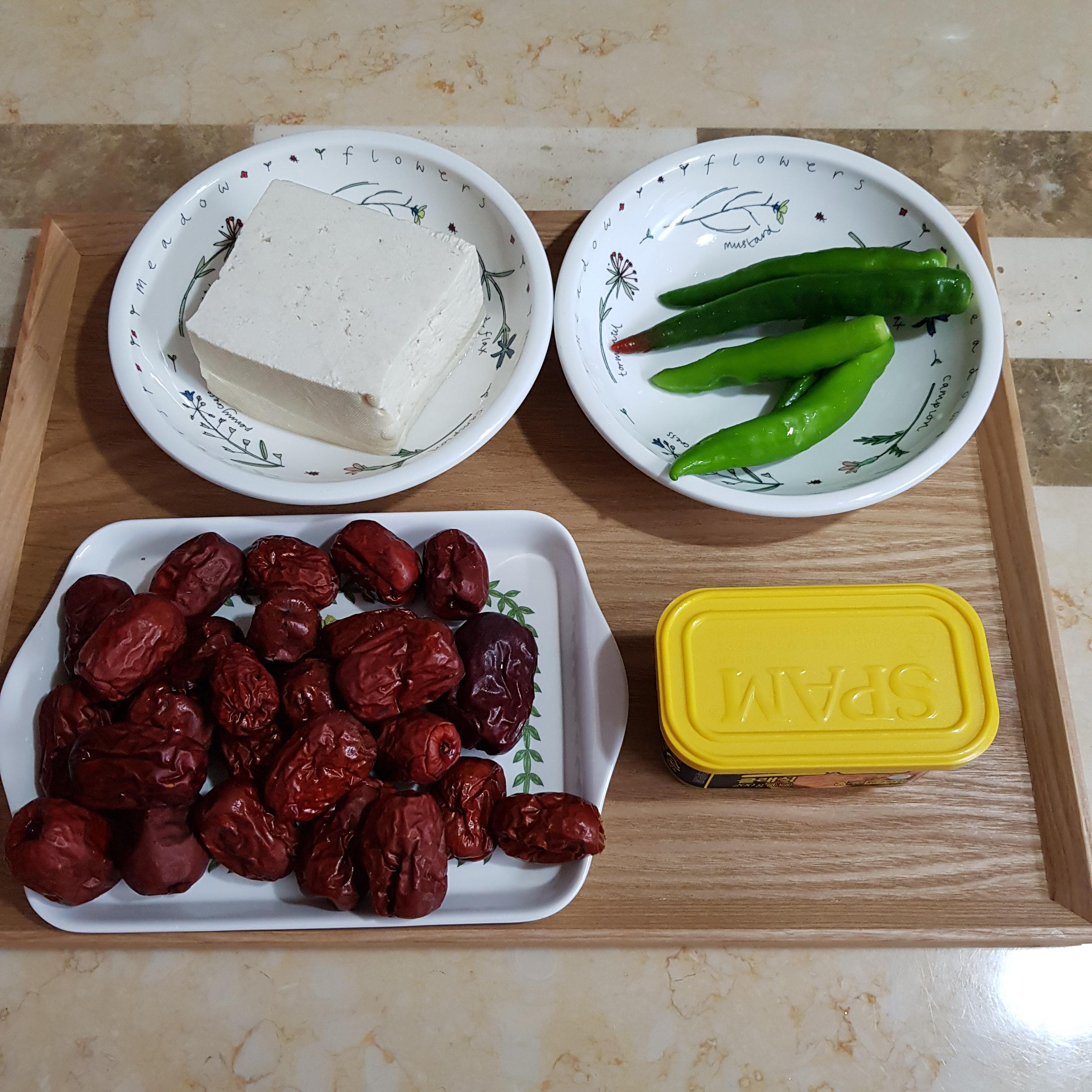 건대추 30개 정도, 스팸 200g, 두부 200g, 청양고추 5개(취향껏), 밀가루 반큰술(접착제 용도)