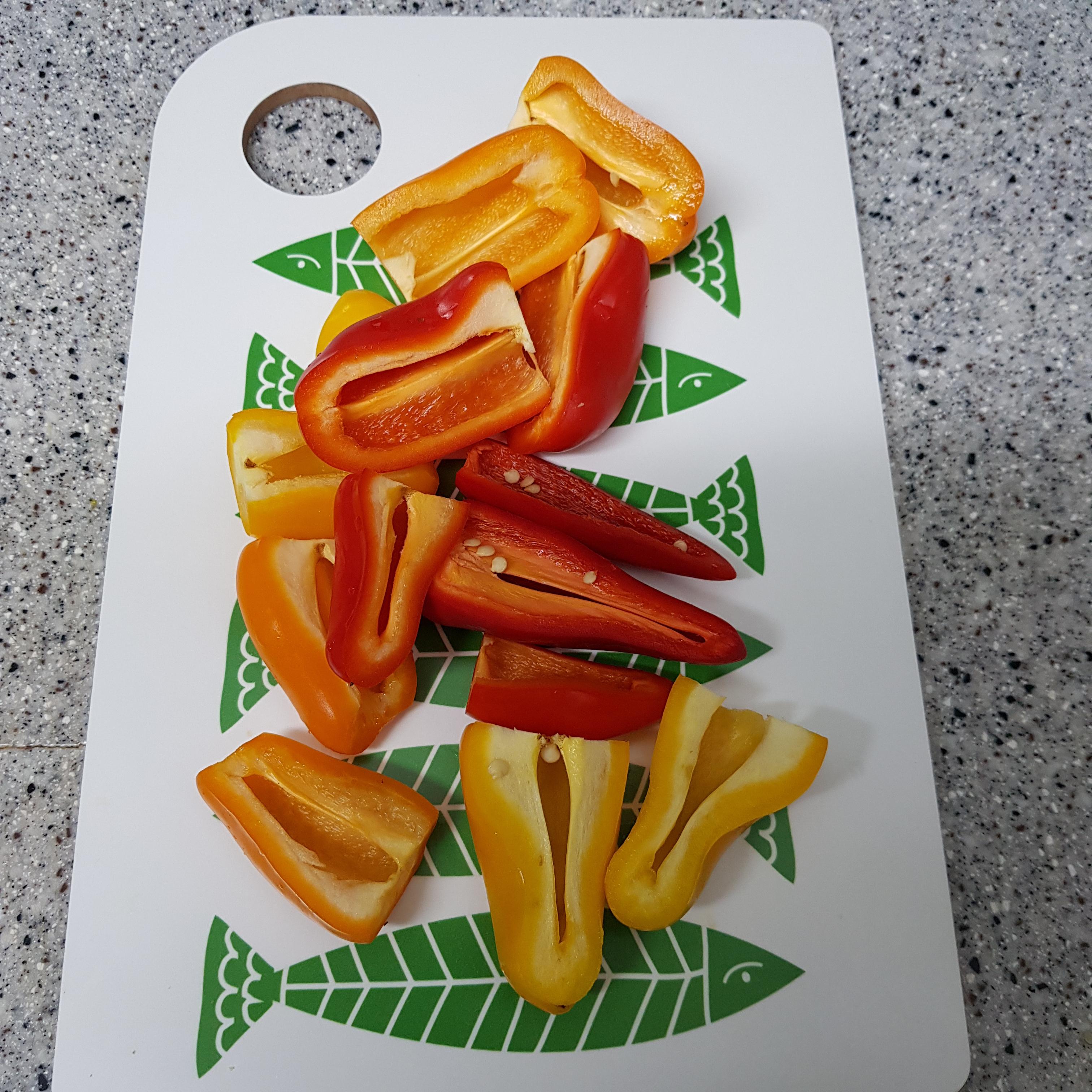 ▶ 파프리카는 씻은 후 꼭지를 자르고 반으로 자른 후 씨를 제거해주세요