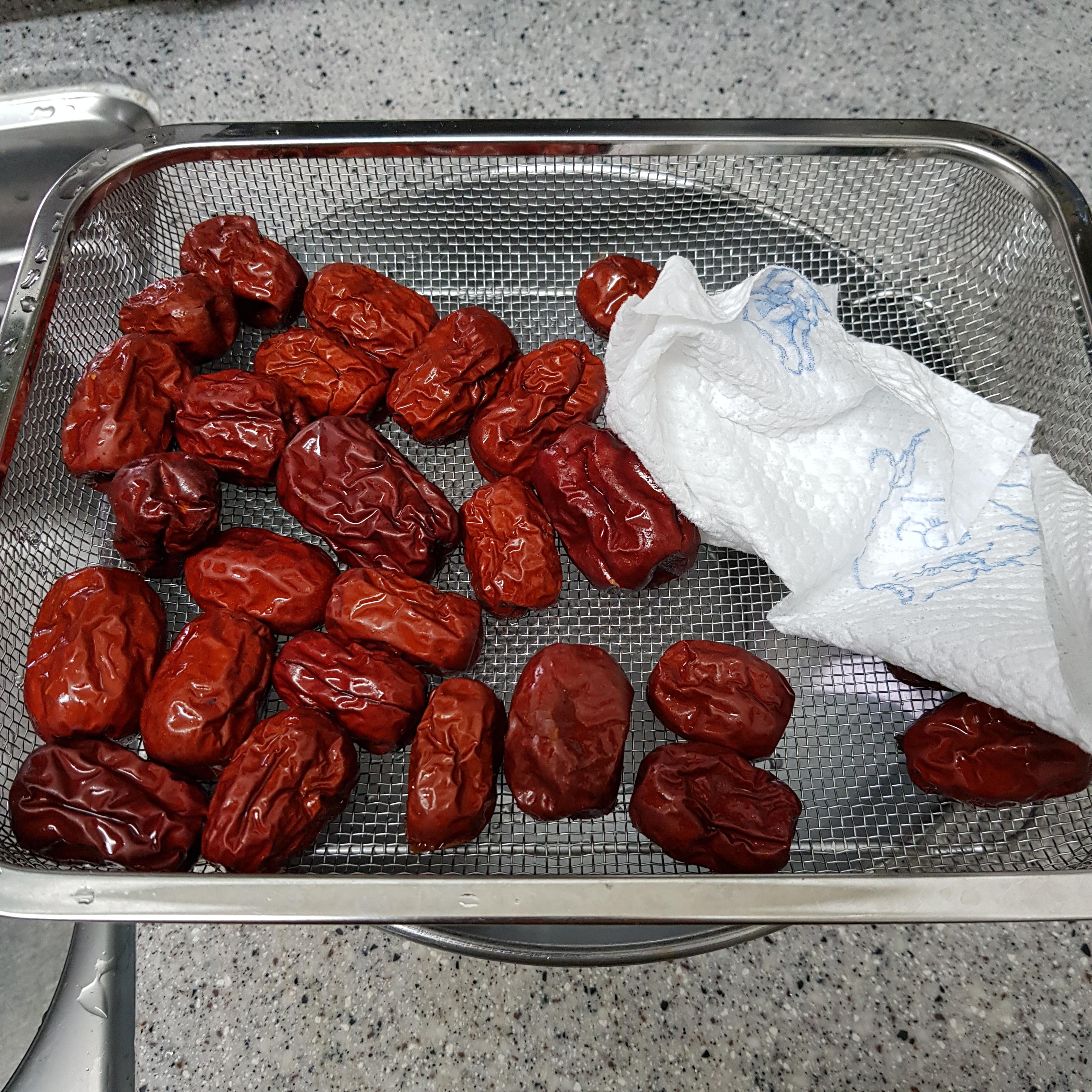 ▶ 건대추는 솔을 이용해 주름 사이사이 깨끗이 씻어준 후 채반에 밭쳐 물기를 빼주고 남은 물기는 키친타월을 사용해 닦아서 준비해주세요