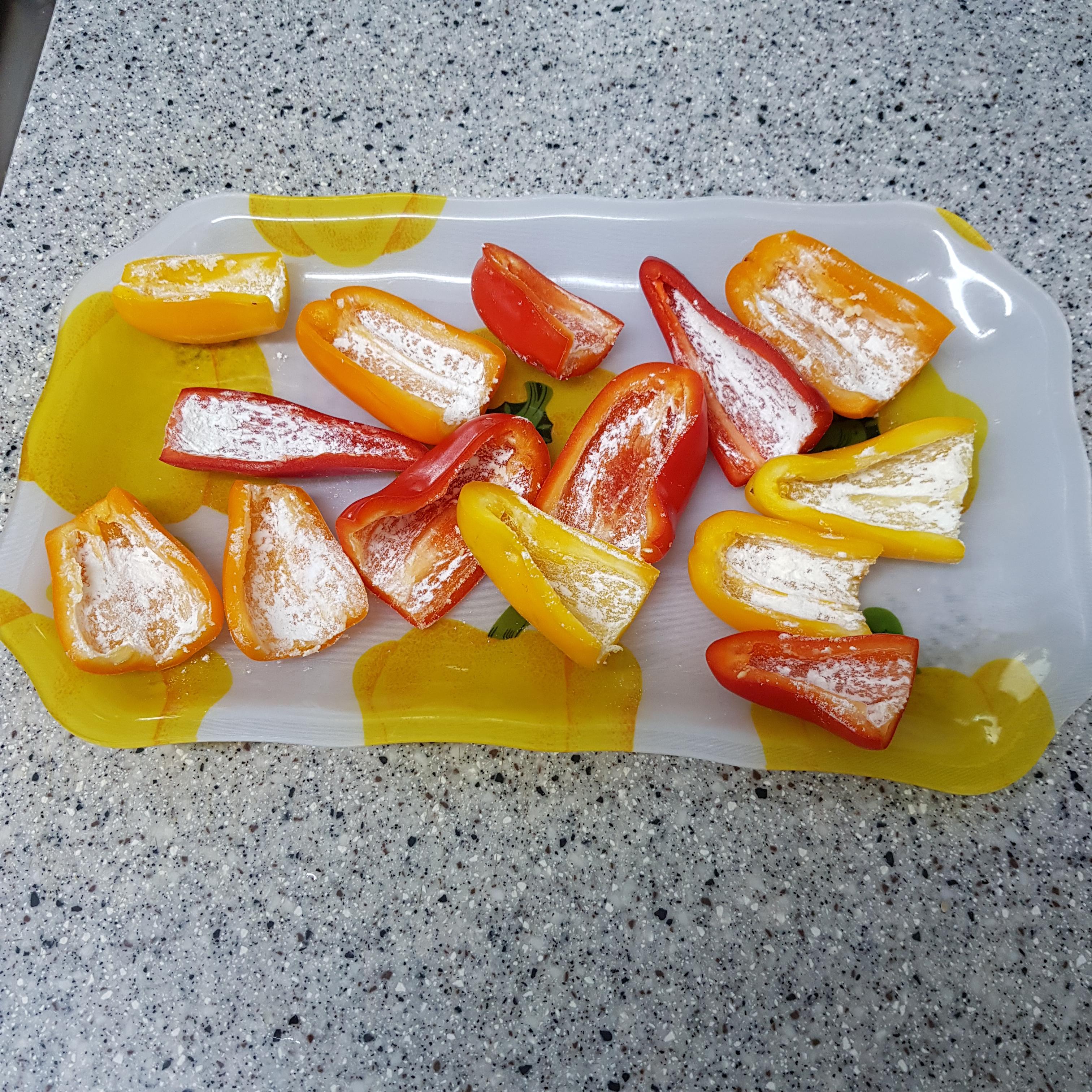 ▶ 파프리카 속에 티스푼을 사용해 속재료를 채워주고 채운 속재료 쪽에 살짝만 밀가루를 묻혀준 후 달걀물도 속재료 넣은 쪽에만 적셔주세요 참고로 스팸은 짠맛이 강해 별도 양념은 하지 않고 달걀물에 후춧가루 약간만 넣어주었답니다