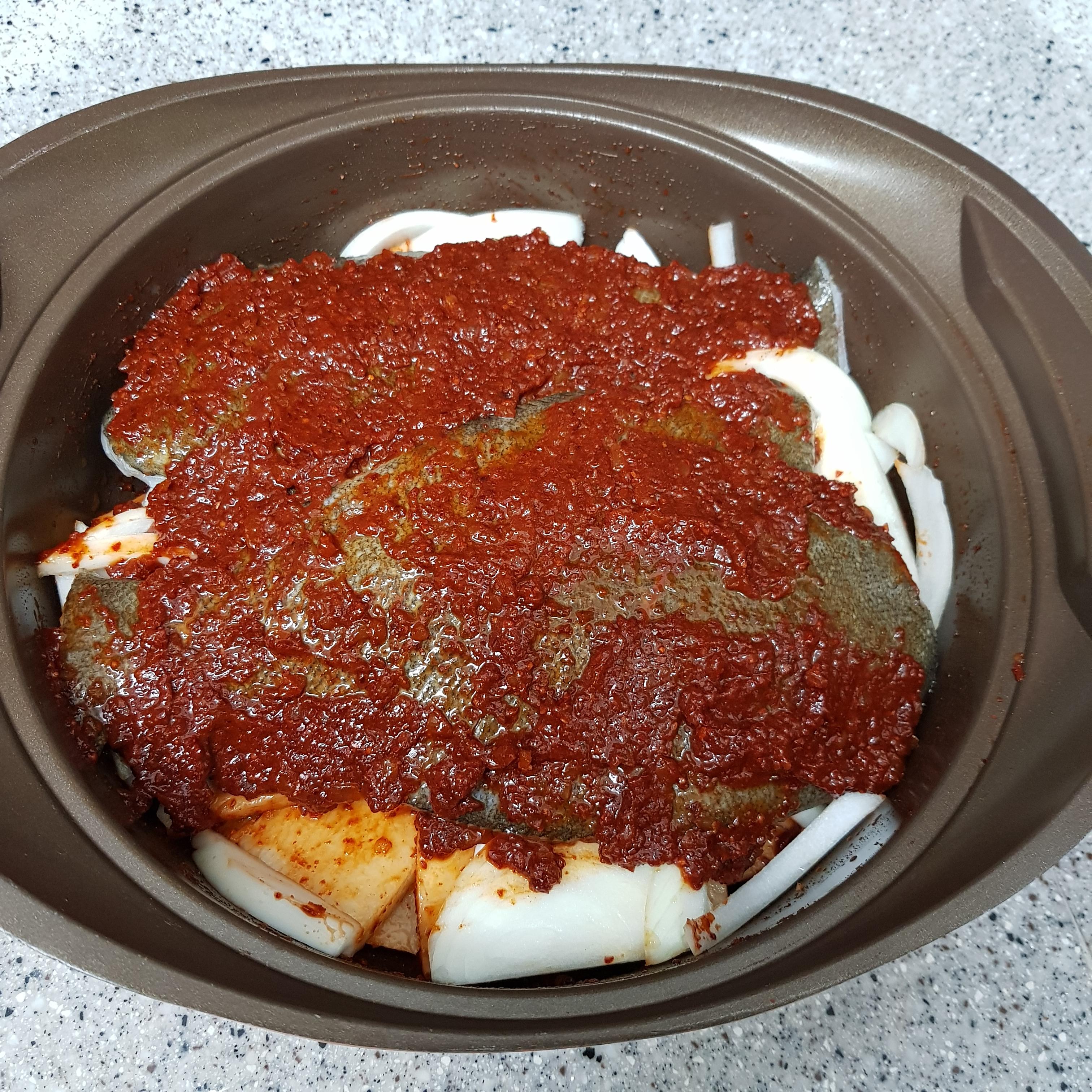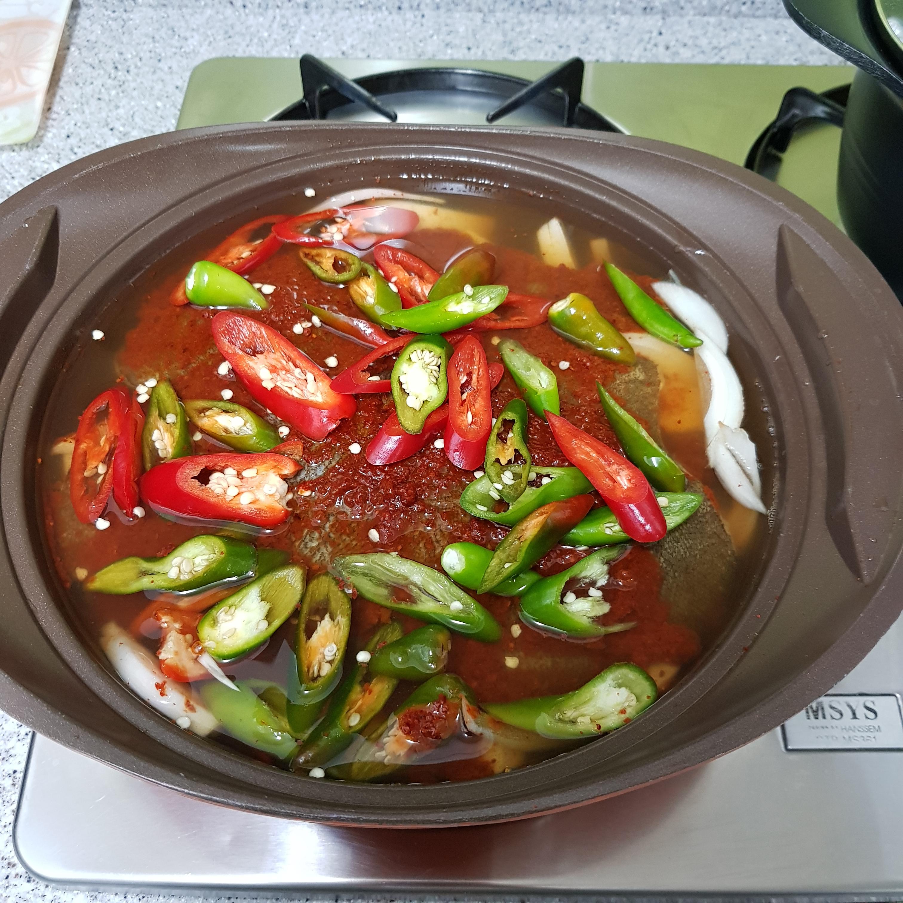 밑간 한 광어 2마리, 무 400g, 대파 2대, 홍고추 1개, 청양고추 5개, 양파 160g 육수(물 2L+시판용 다시 티백 2봉지)