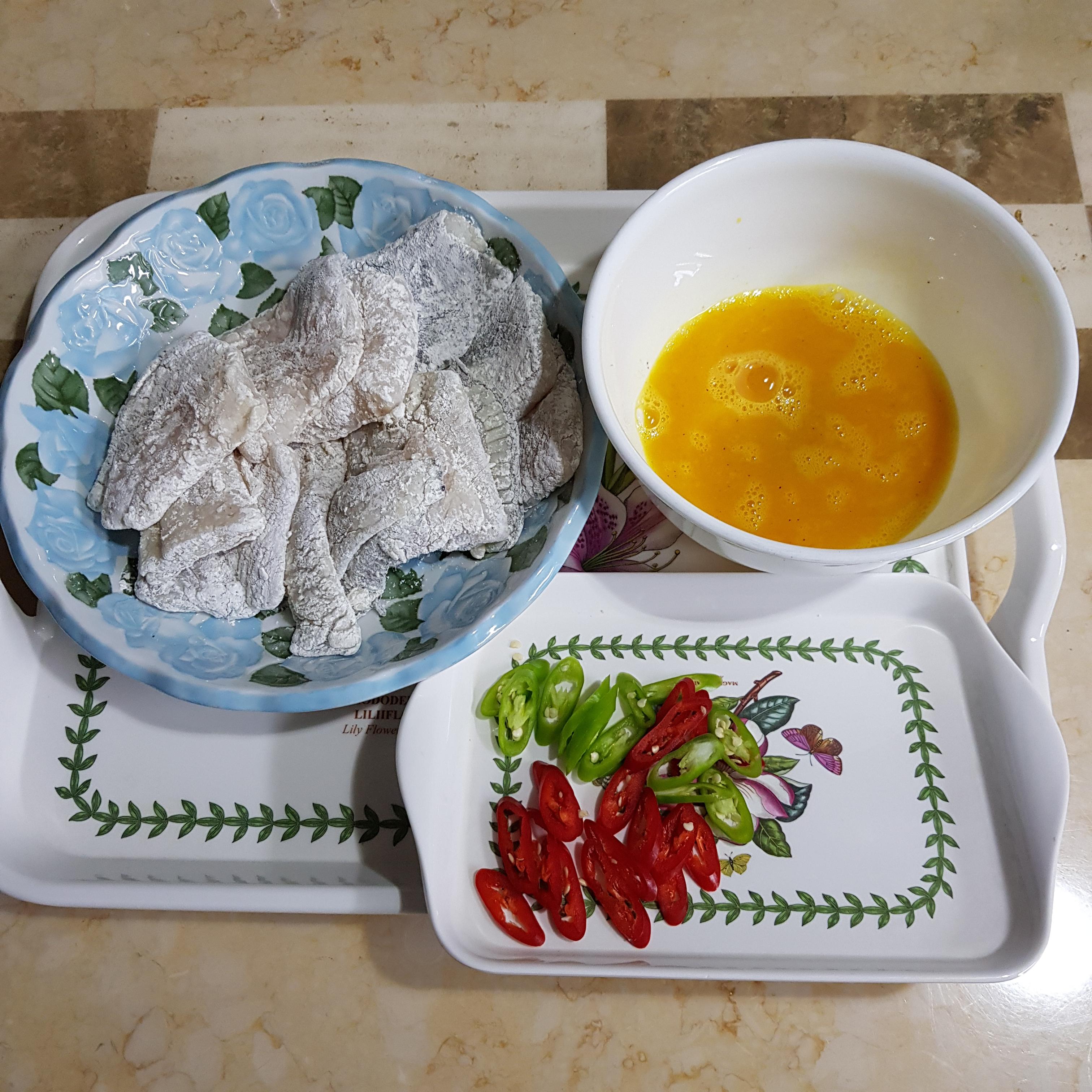 손질한 광어 1마리, 밀가루 1큰술, 달걀 1개, 일회용 비닐백 1장, 홍고추 1개+청양고추 1개(데코용)