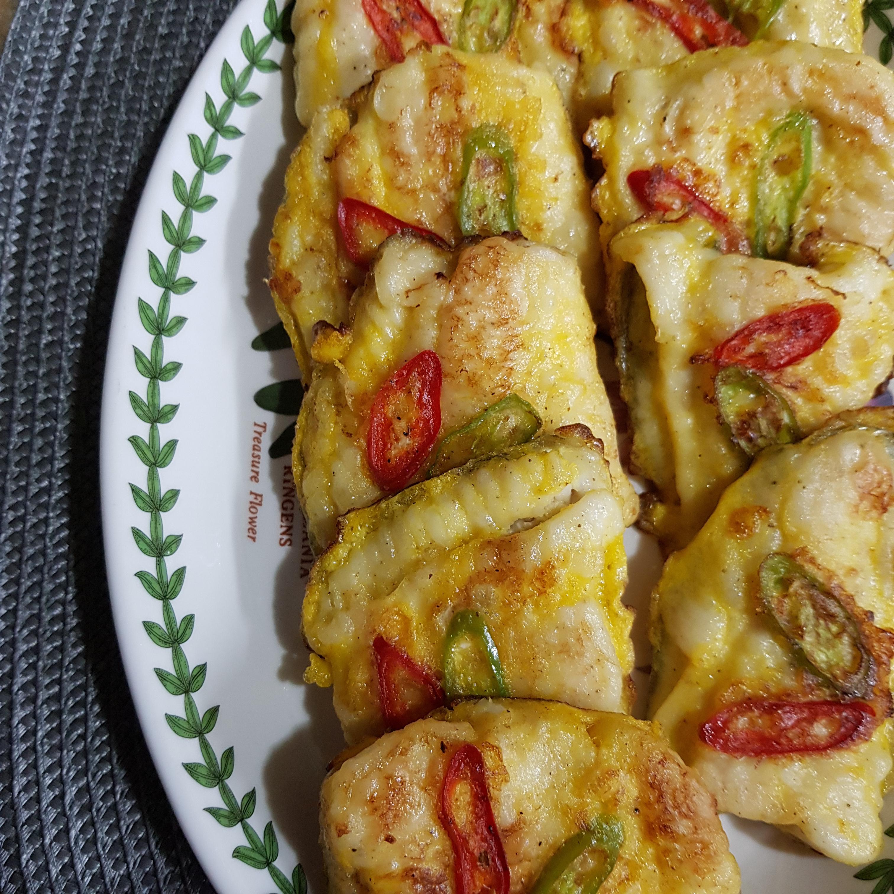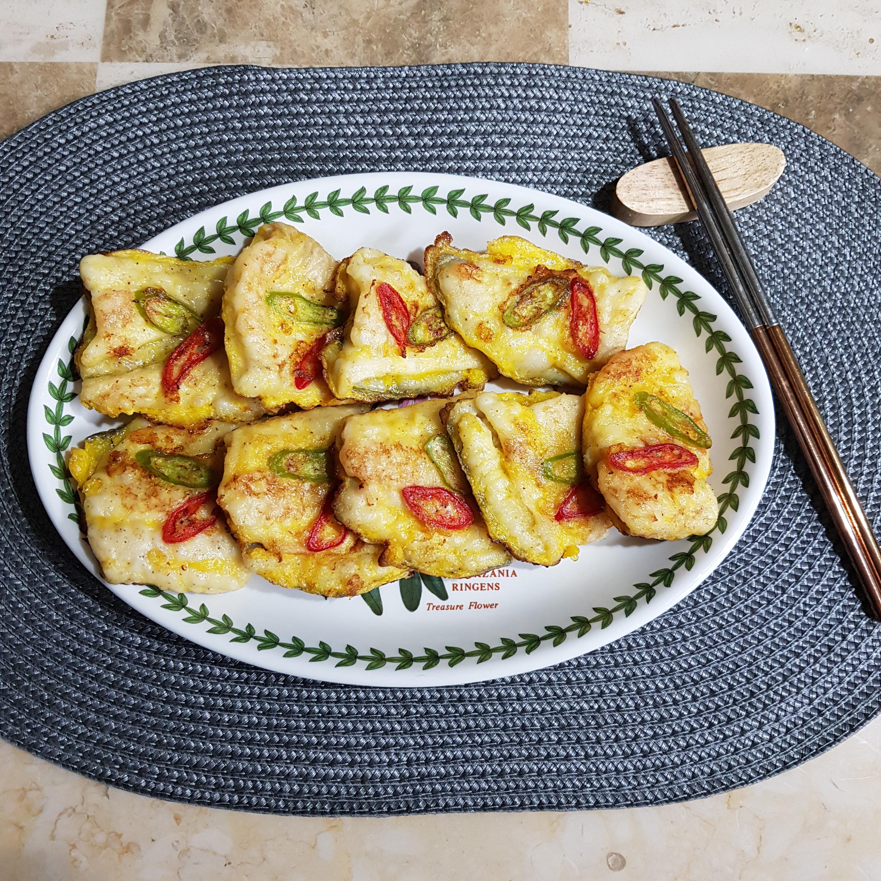 ▶ 한쪽 면에 데코용 고추를 얹어주고 앞뒤 노릇노릇 구워주면 광어전 완성입니다