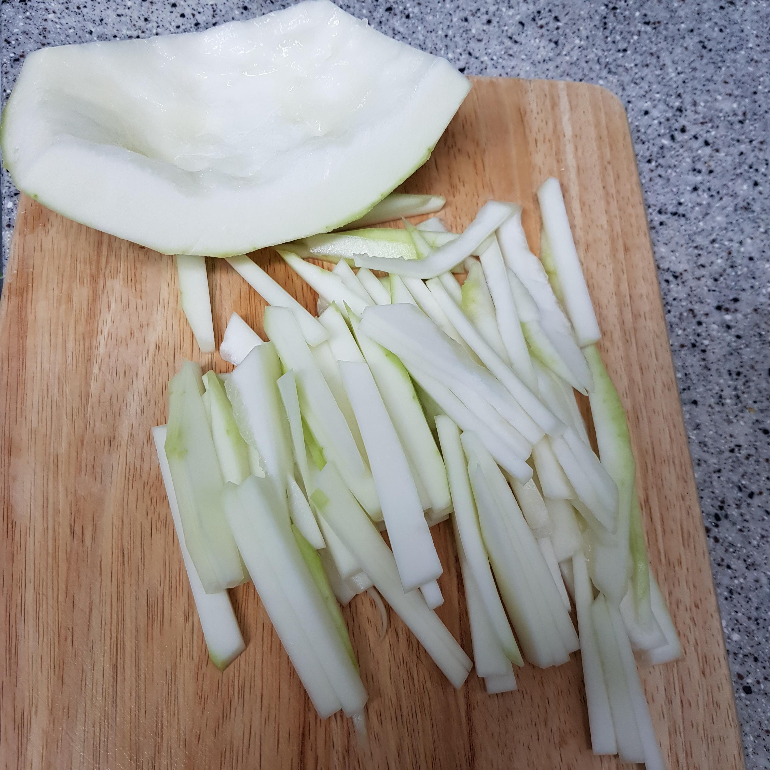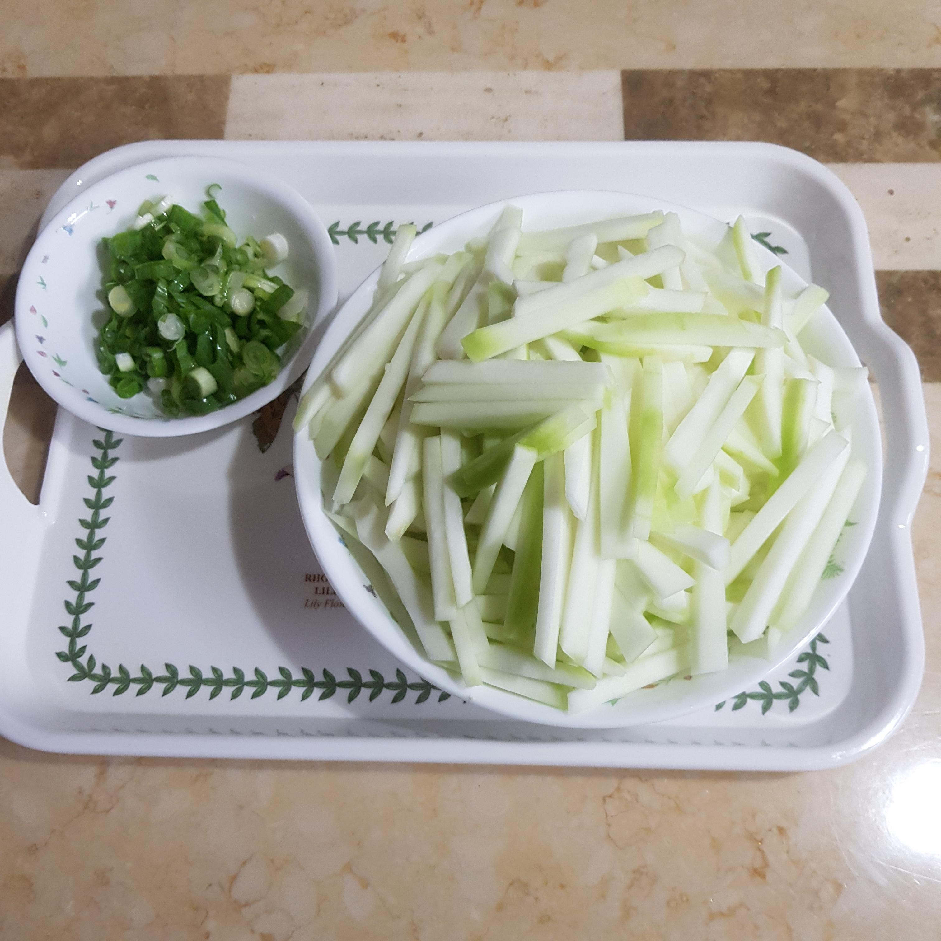 ▶ 소고기국 끓일 때랑 같은 방법으로 손질한 후 박은 채 썰고 대파는 송송 썰어주면 박나물 손질 완료입니다