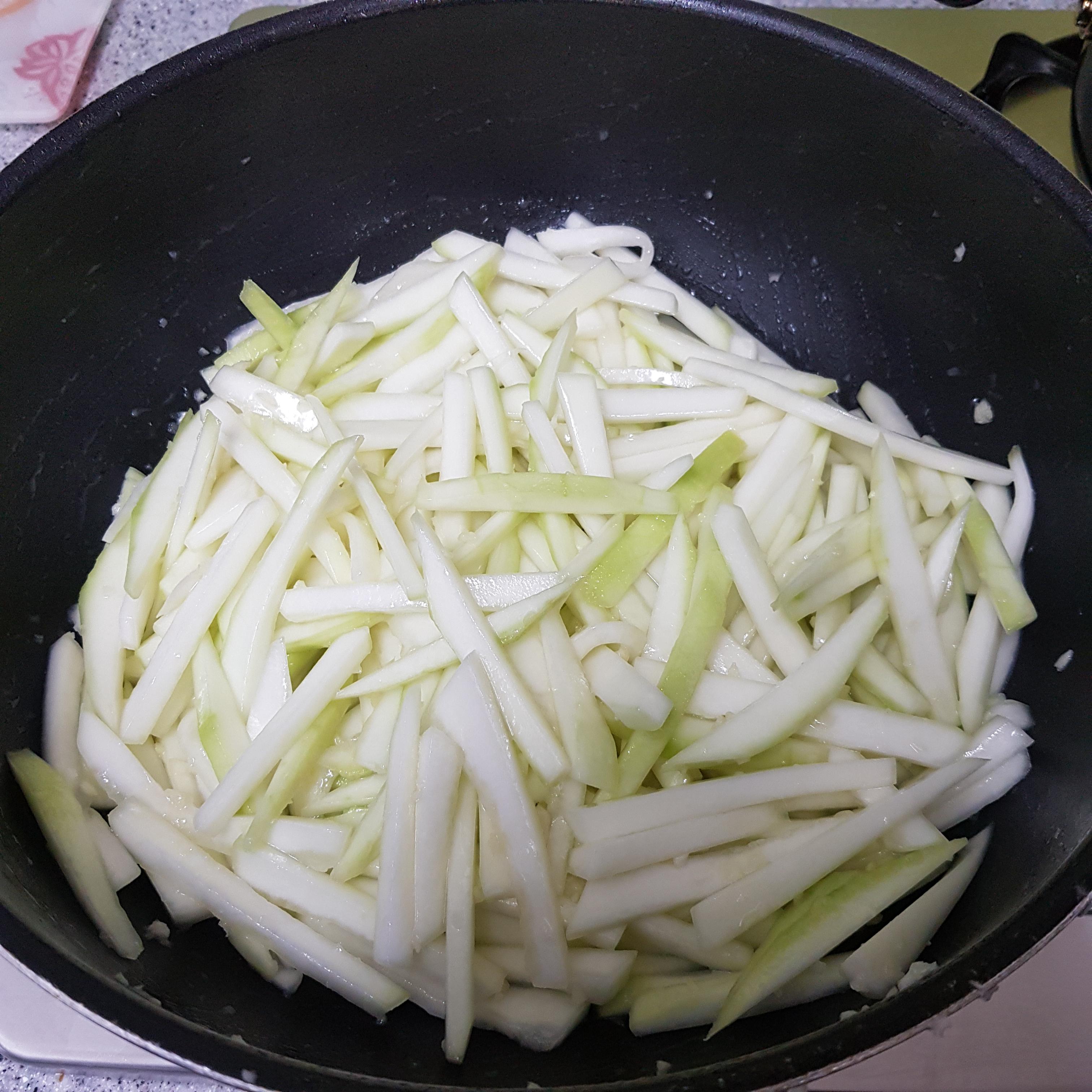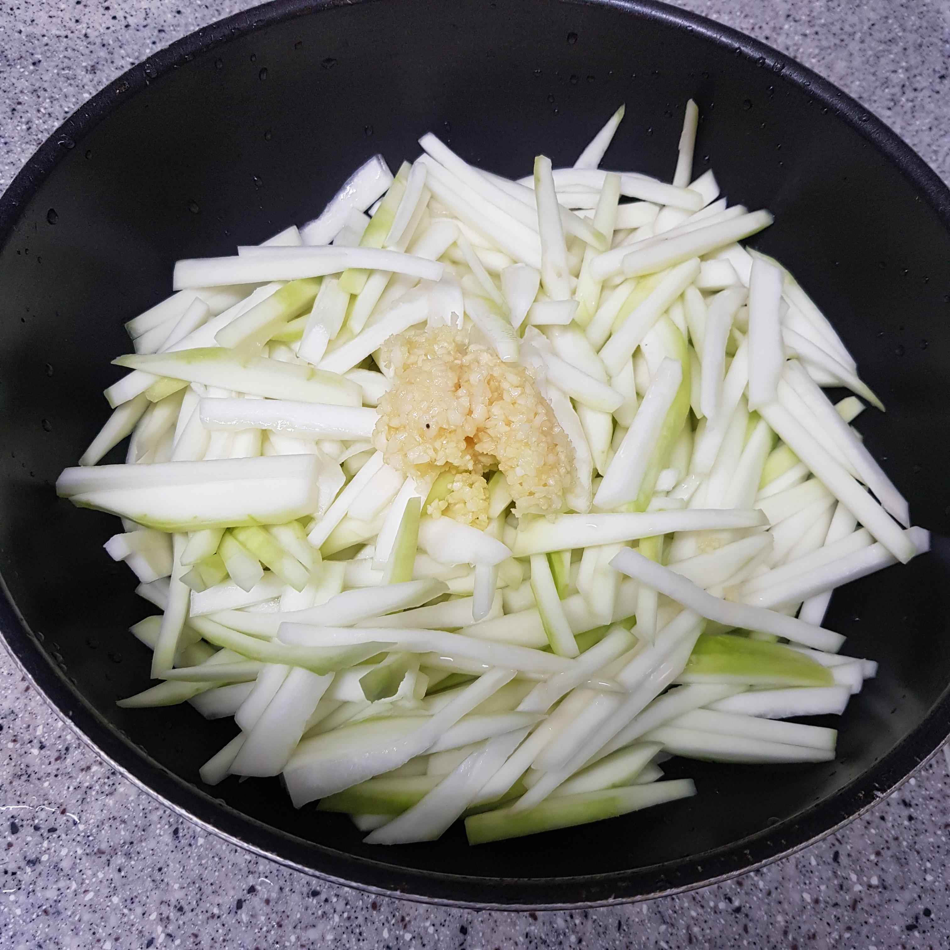 ▶ 웍에 들기름 2큰술, 채 썬 박, 다진 마늘 1큰술, 새우 육젓 국물 2큰술 넣고 볶기 전에 골고루 섞어주세요 새우 육젓이 없다면 꽃소금으로 대체 가능하니 참고해주세요