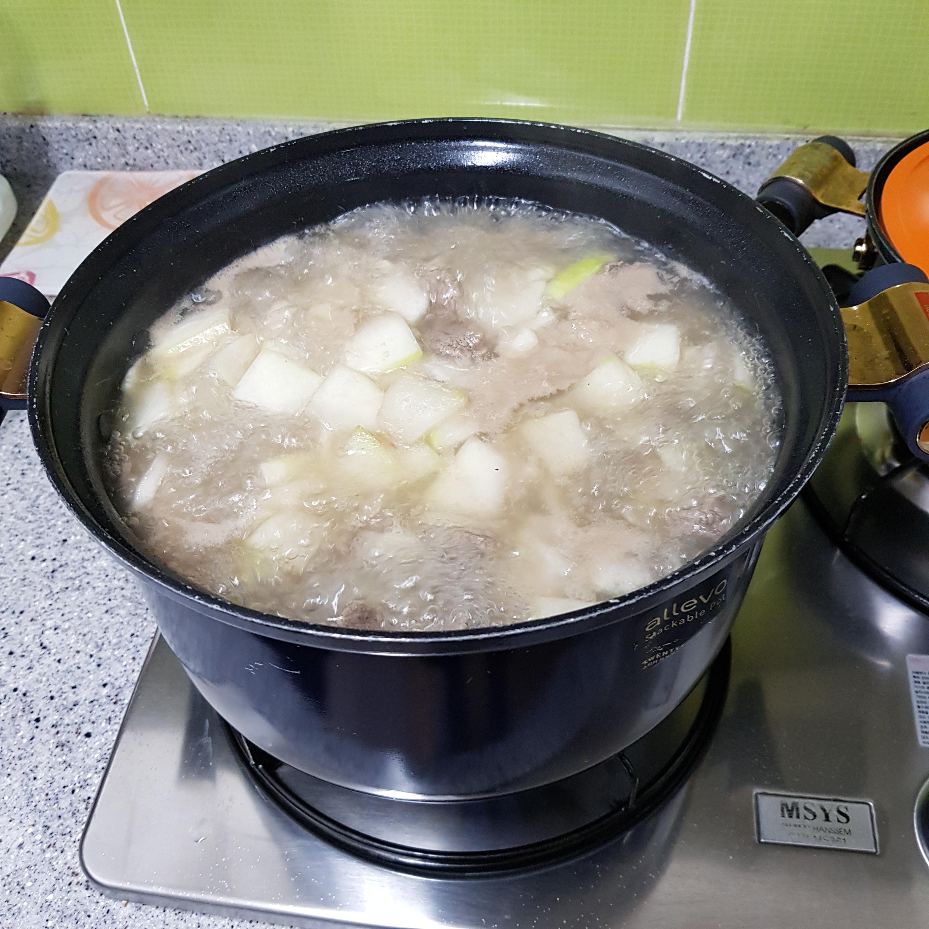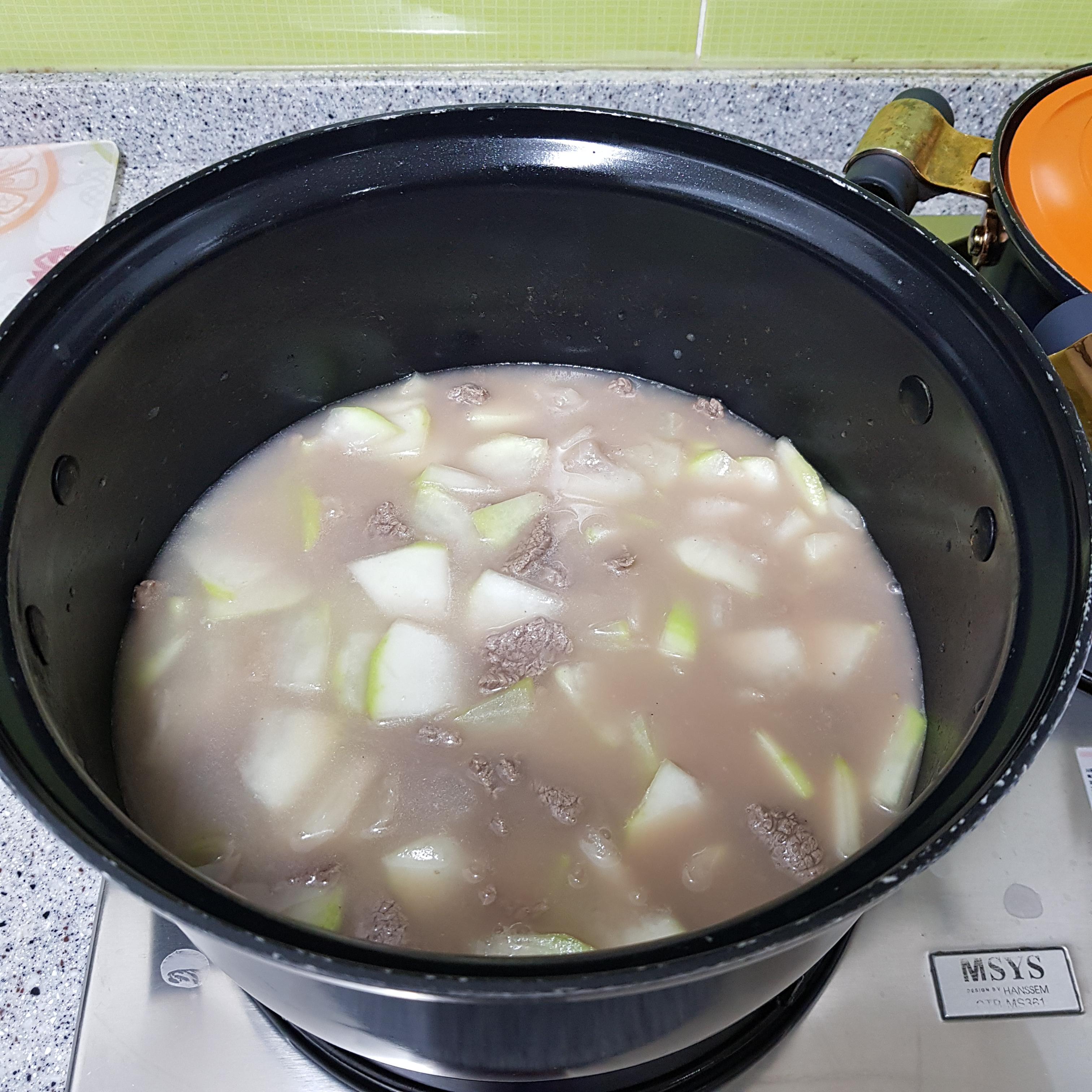 ▶ 소고기를 먼저 3분 정도 볶다가 준비한 박을 넣고 5분 더 볶은 후 쌀뜨물 1L를 넣어주세요