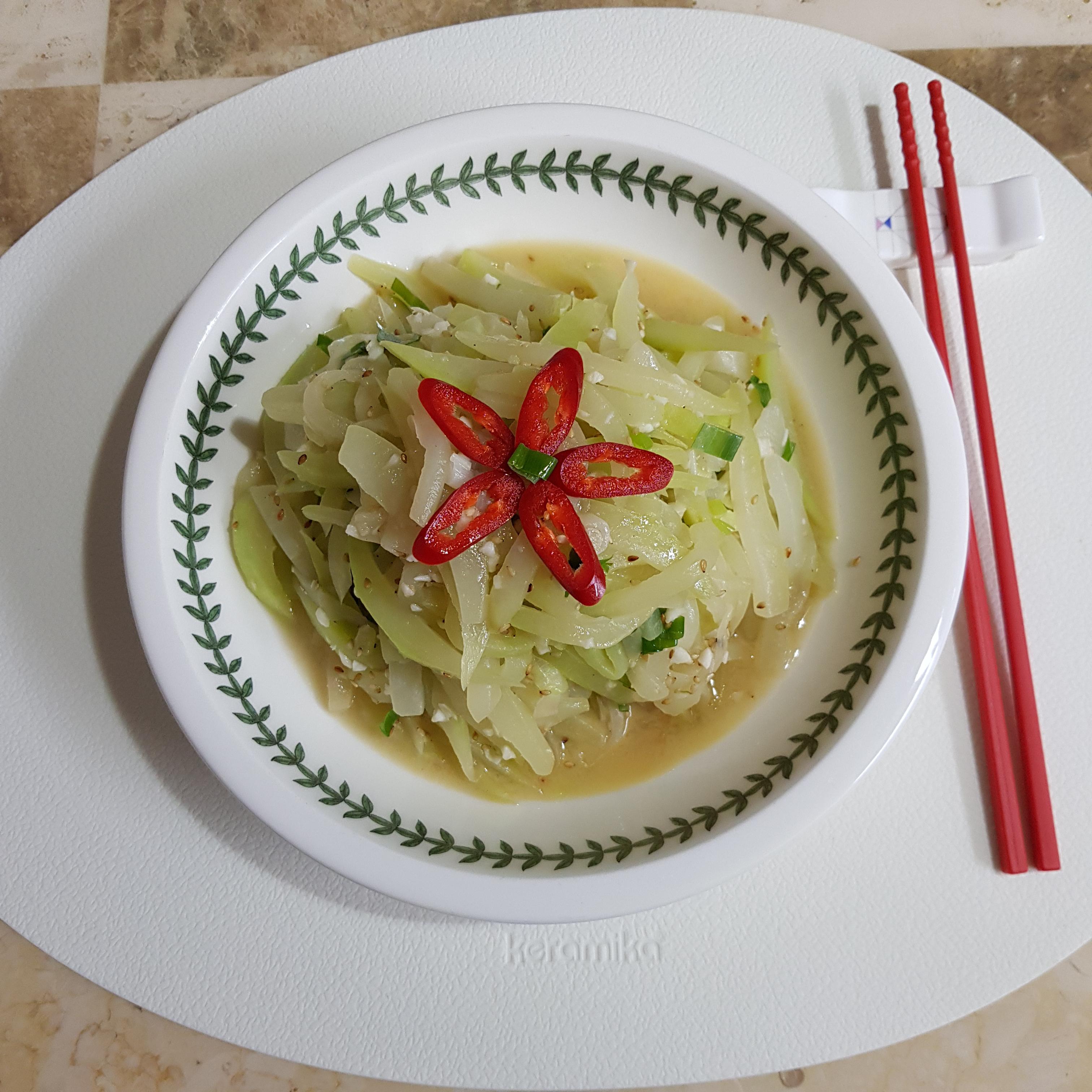 ▶ 송송 썬 대파 넣고 중불로 조절해 박이 익을 때까지 볶아준 후 참기름 1티스푼, 통깨 2큰술 넣고 마무리하시면 부드러운 박나물 만드는 법 완성입니다 그릇에 옮겨 담아 어슷썰기 한 홍고추로 데코 해주었어요^^