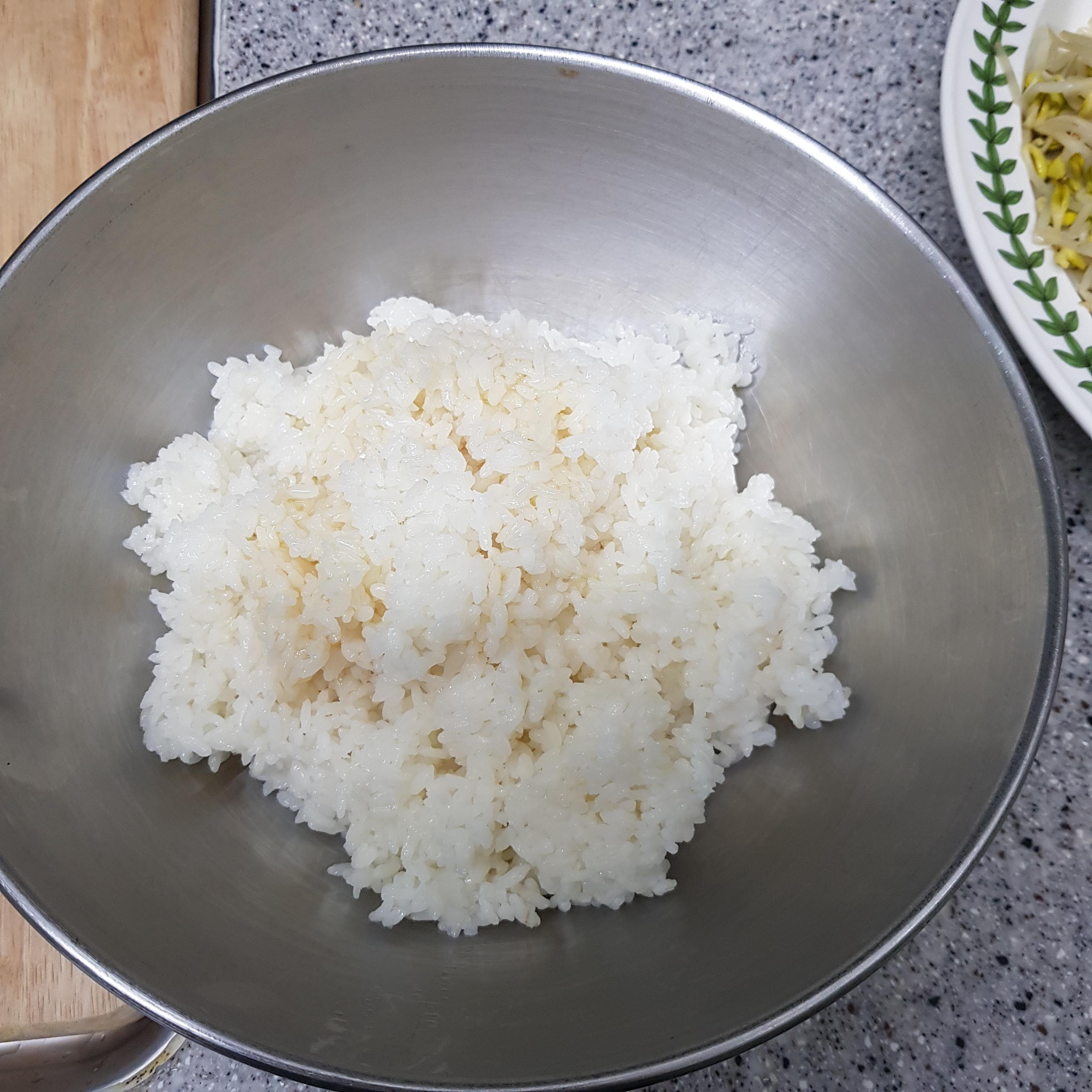 ▶ 남은 명절 나물은 깨소금을 넣어 수분을 제거하고 추가 재료는 냉장고에 있는 재료로 준비하고 밥은 참기름을 약간 넣어 골고루 섞어 준비하시면 명절음식활용 나물 김밥 재료 손질 완료입니다