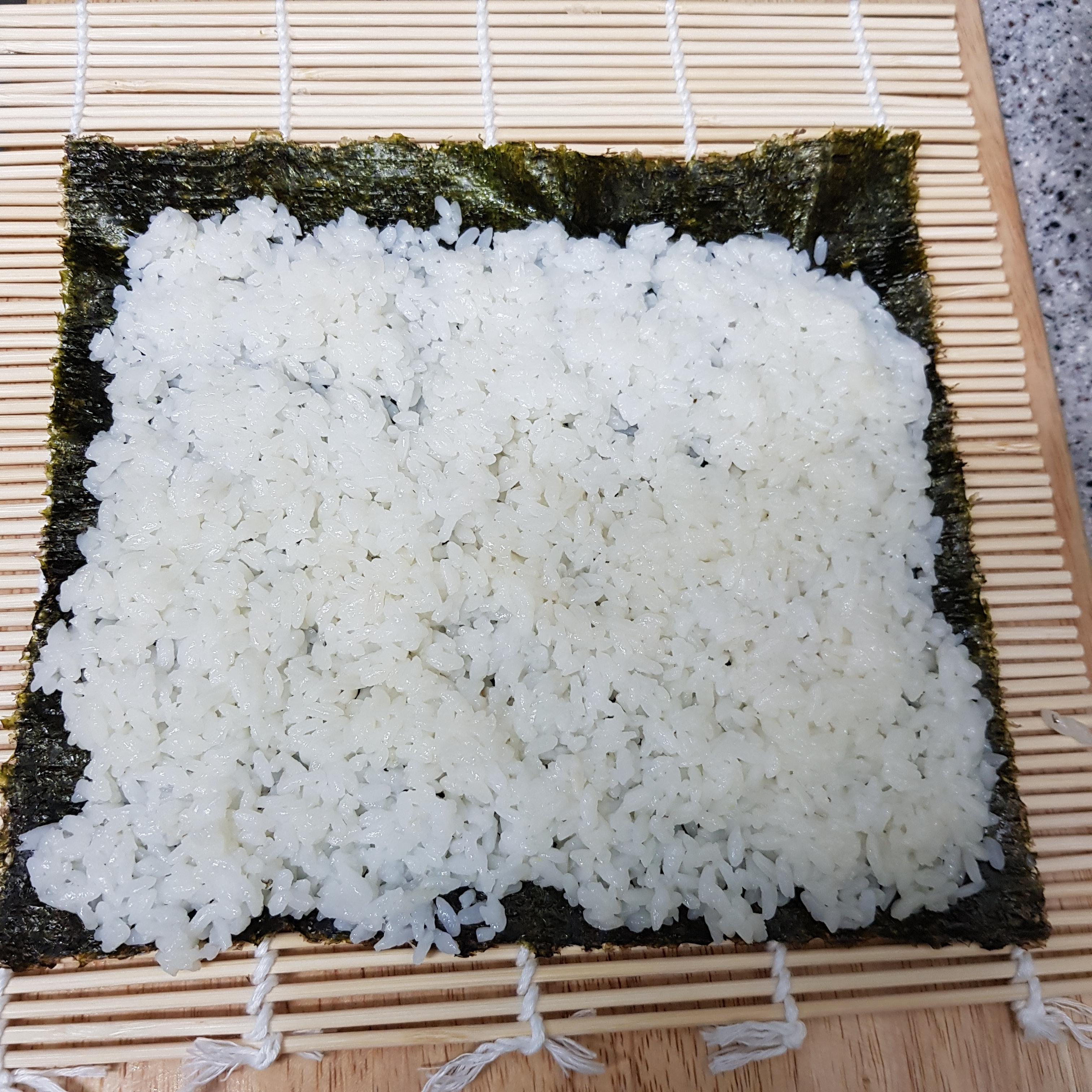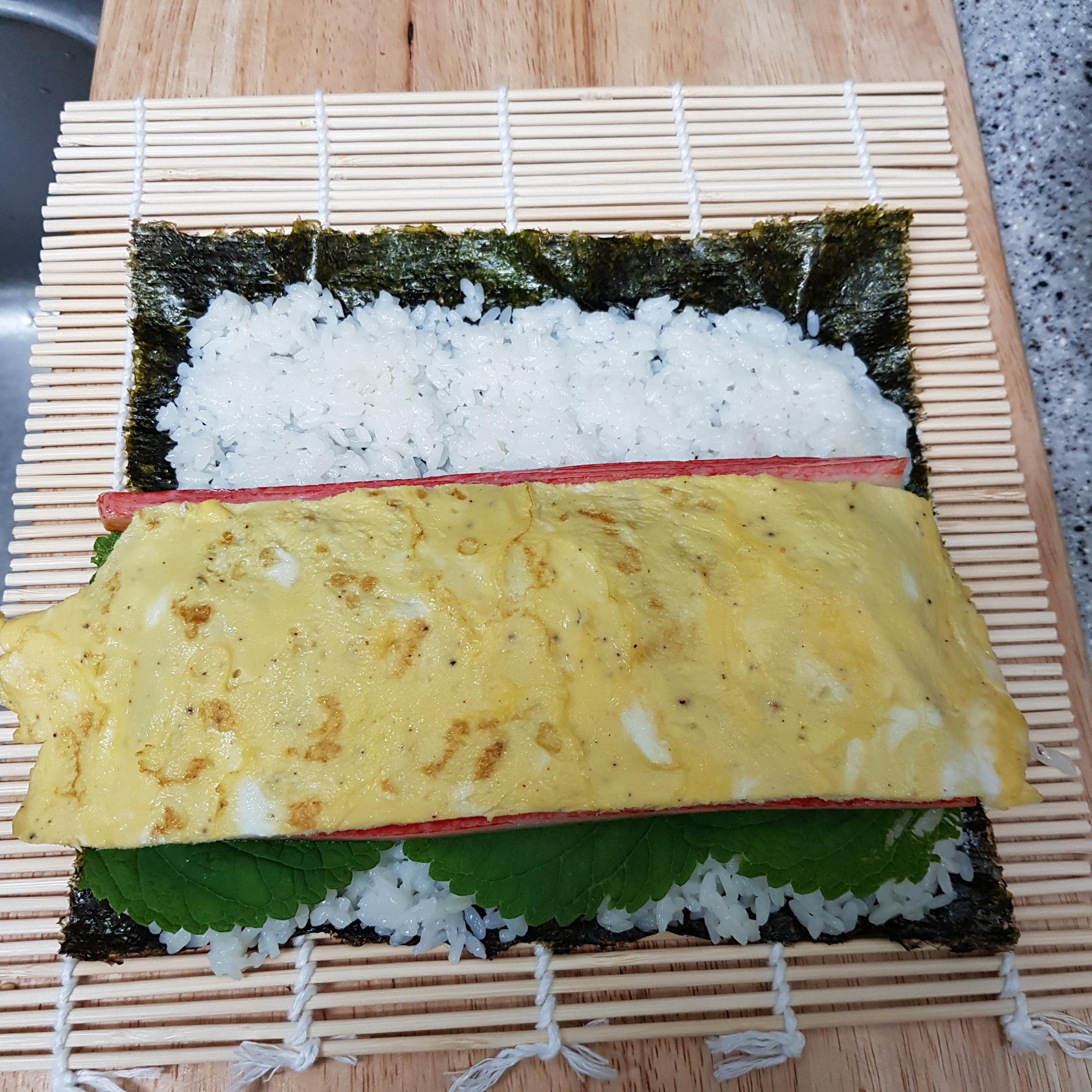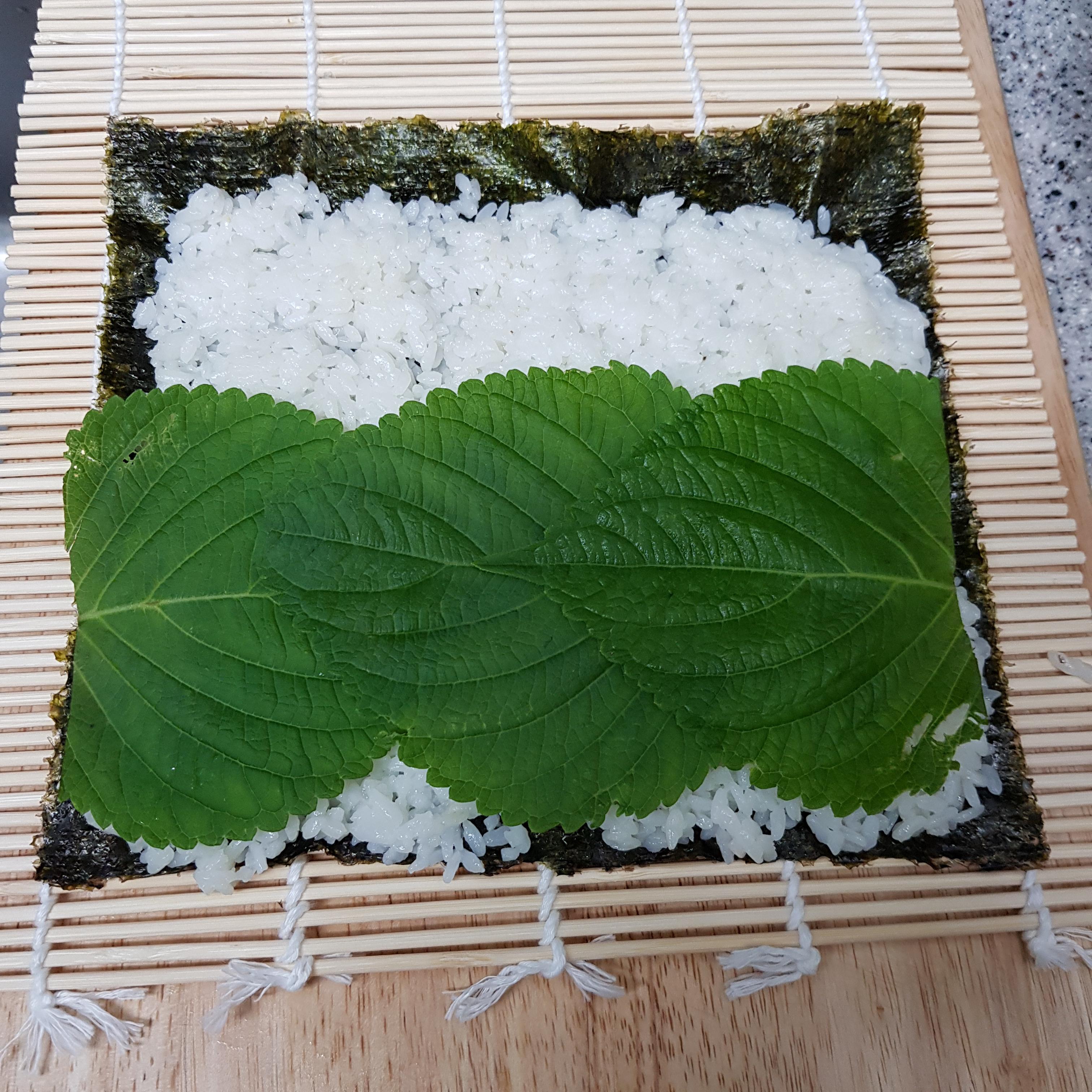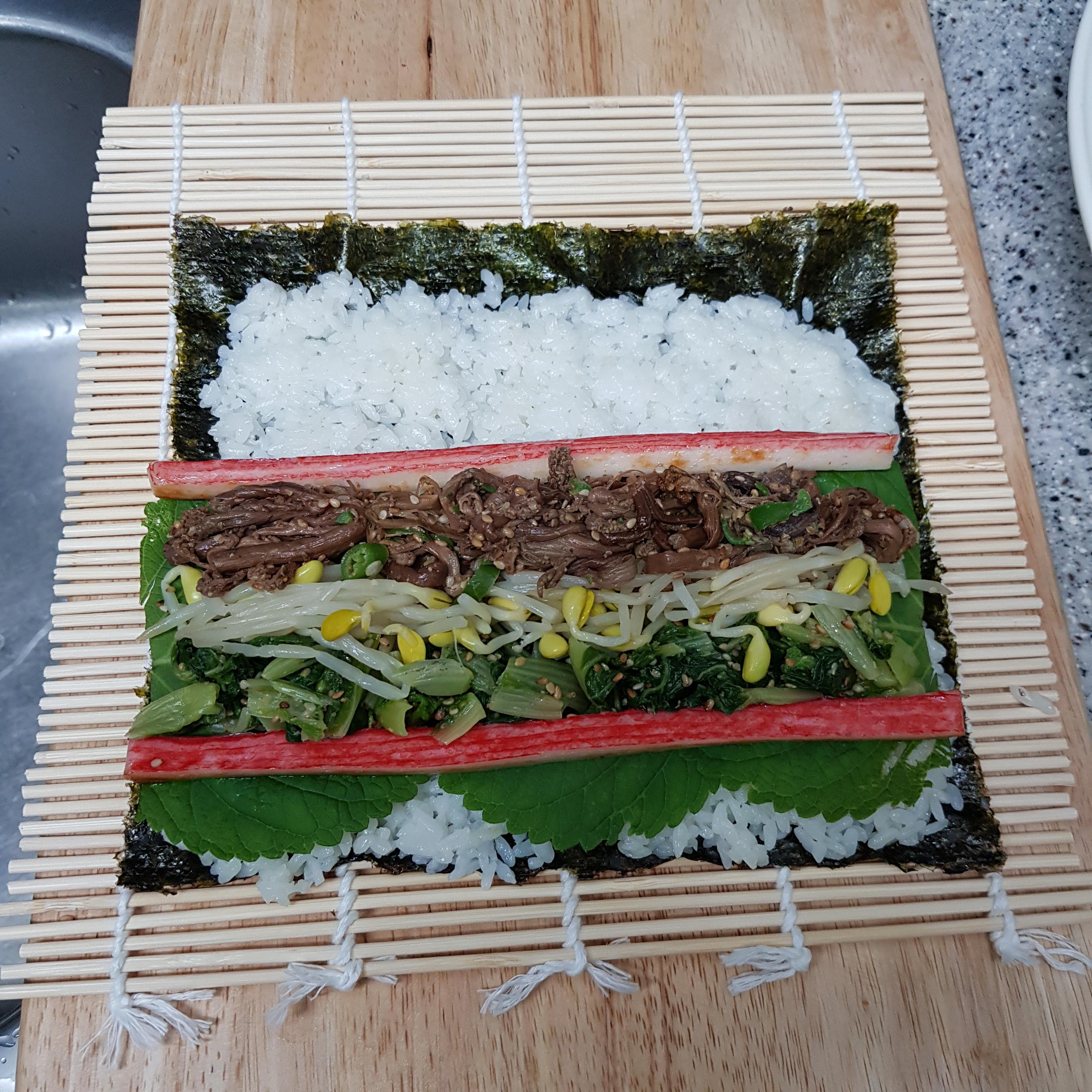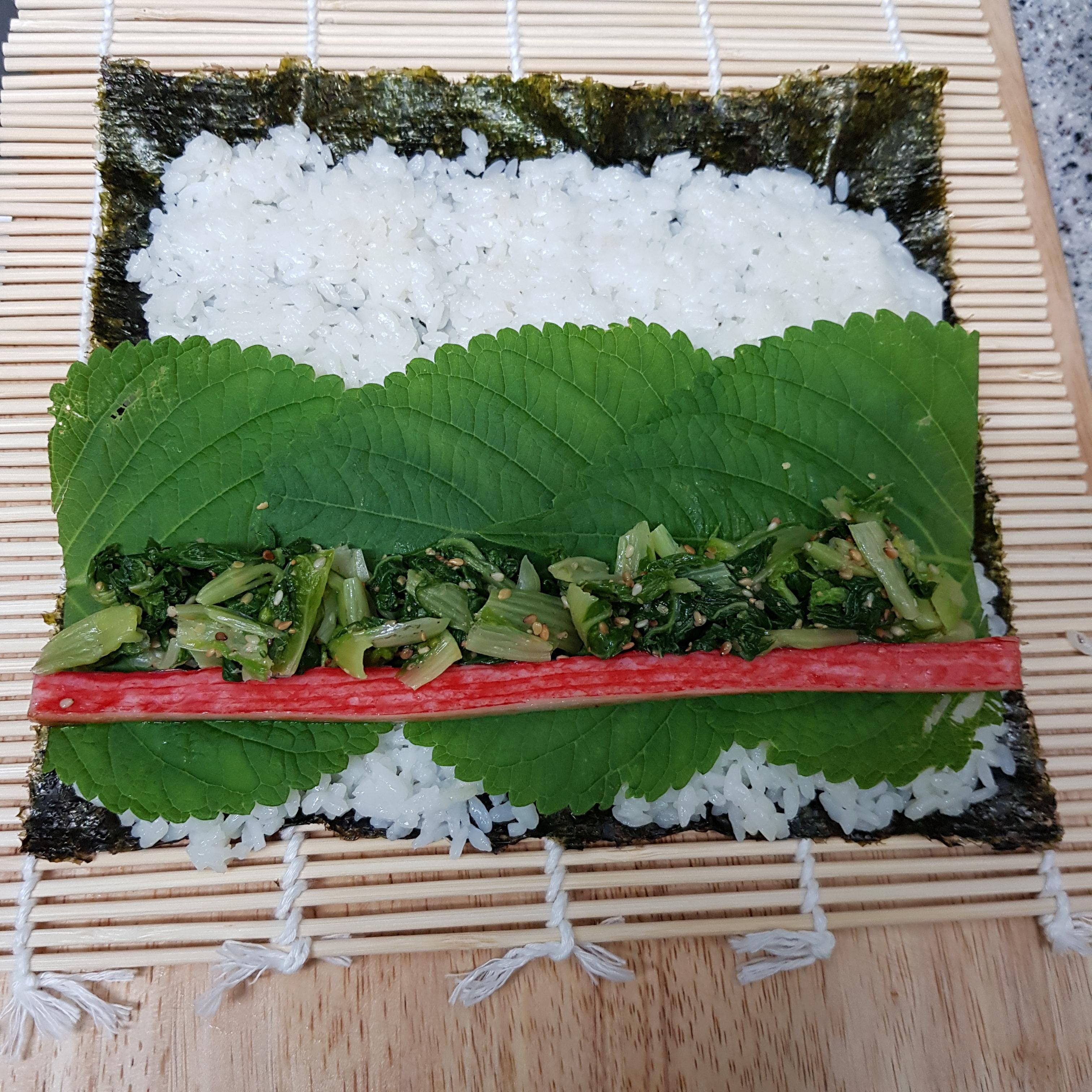 ▶ 김밥김 위에 1cm 정도 남겨두고 밥을 골고루 펴주고 밥 위에 깻잎, 맛살, 얼갈이 나물을 올려주세요