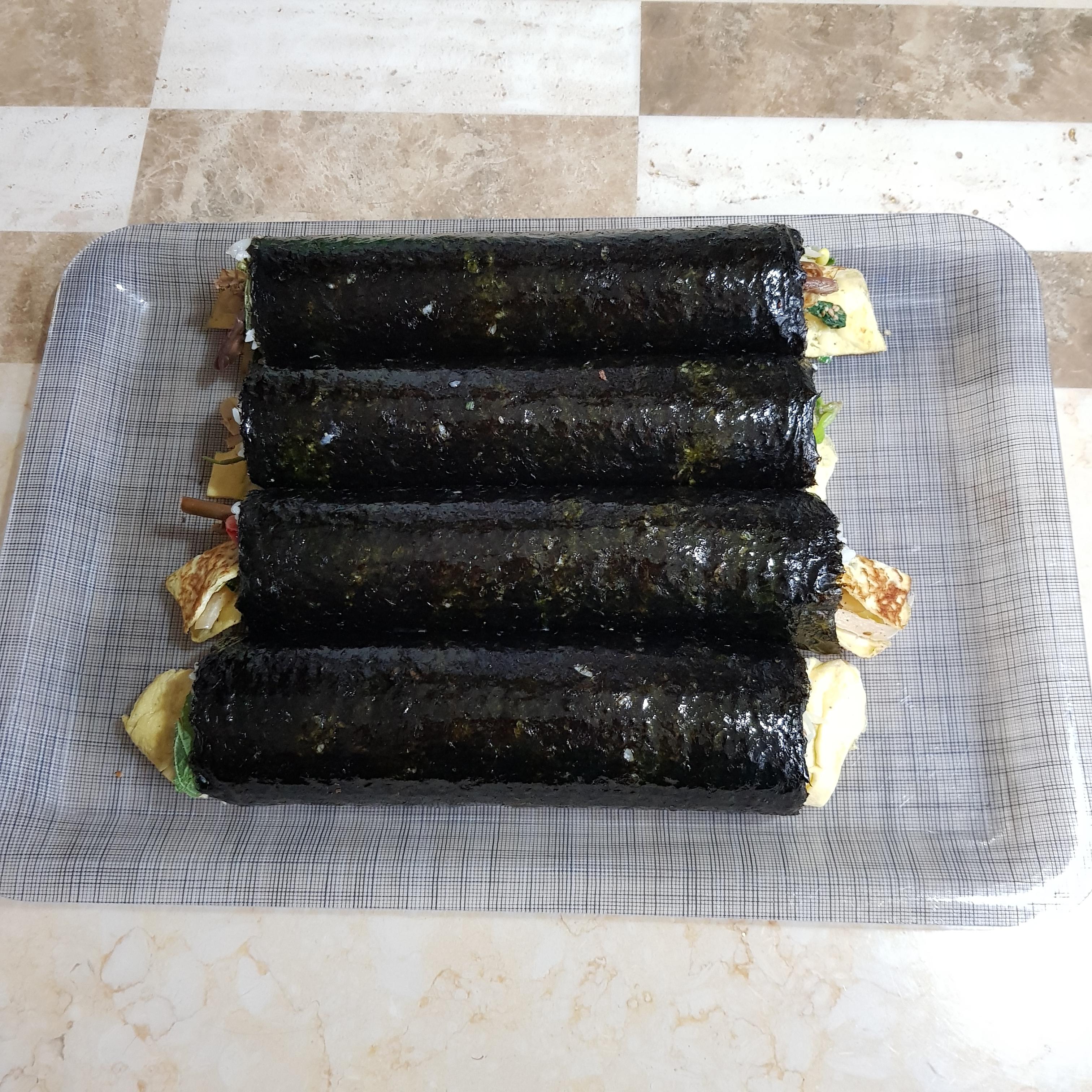 ▶ 넓게 썬 달걀지단을 덮어준 후 도라지, 시금치, 취나물을 올린 후 돌돌 말아주면 명절음식활용 나물 김밥 완성입니다