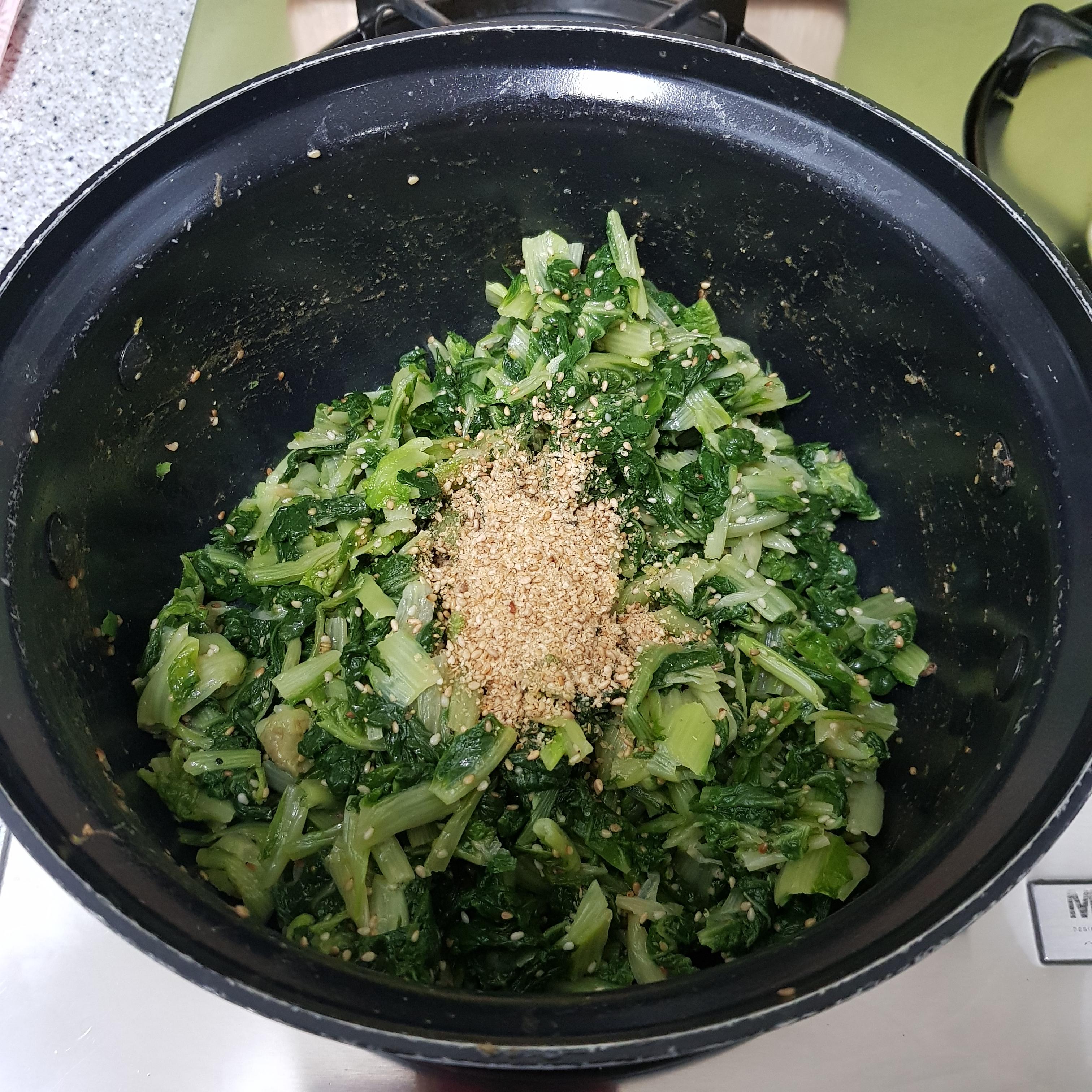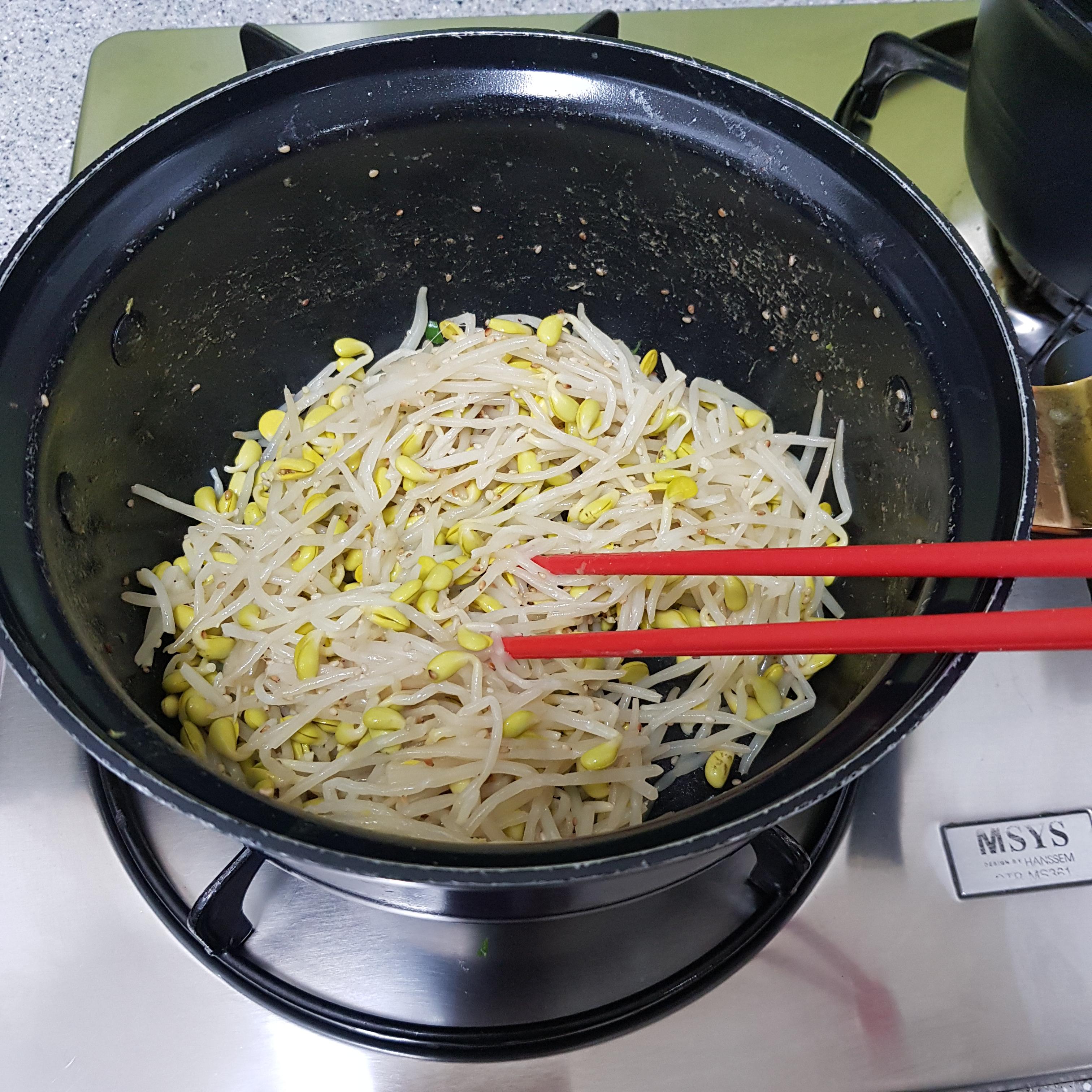 ▶ 콩나물과 얼갈이도 마찬가지로 깨소금 1큰술씩 넣어 국물이 없을때까지 살짝만 볶아 준비해주세요