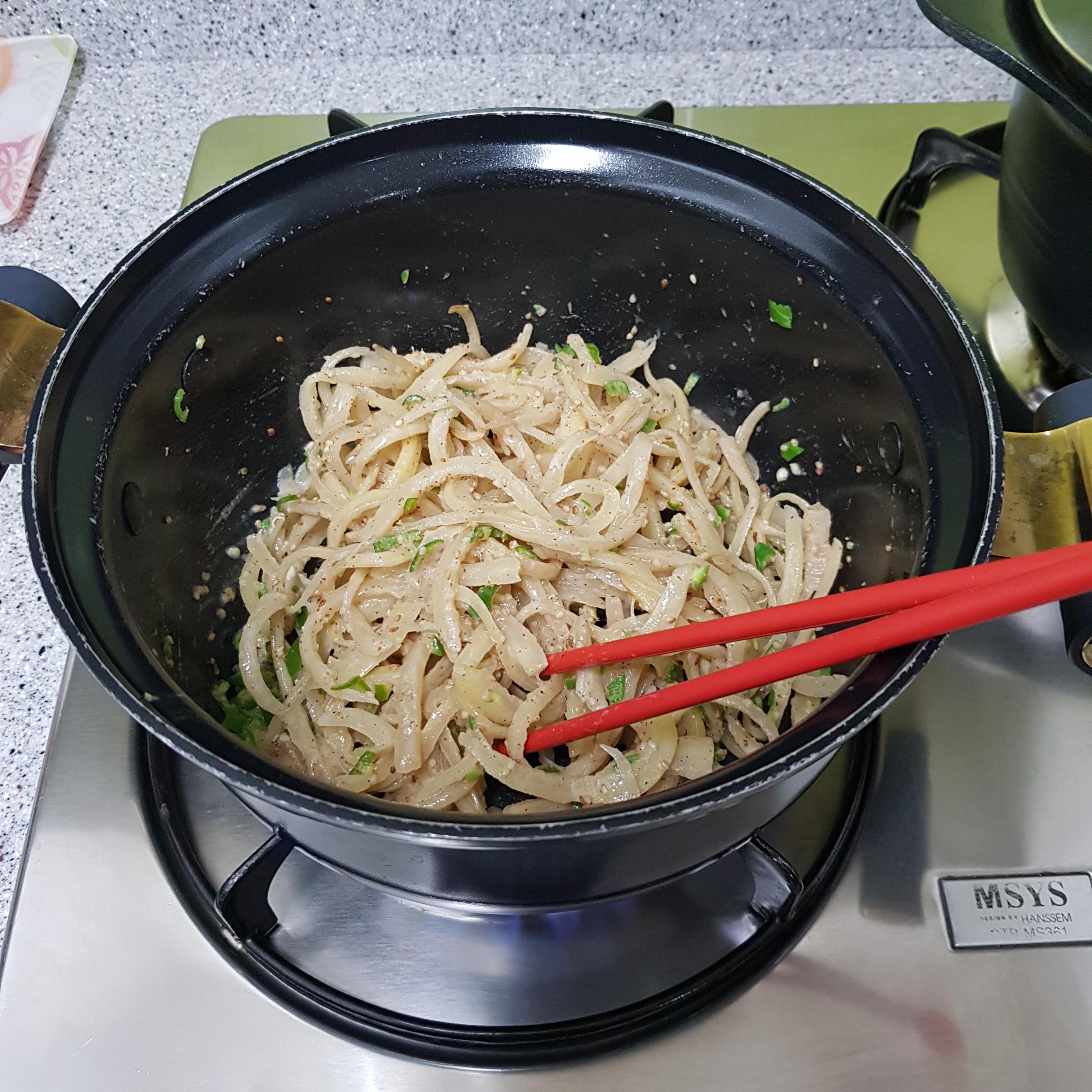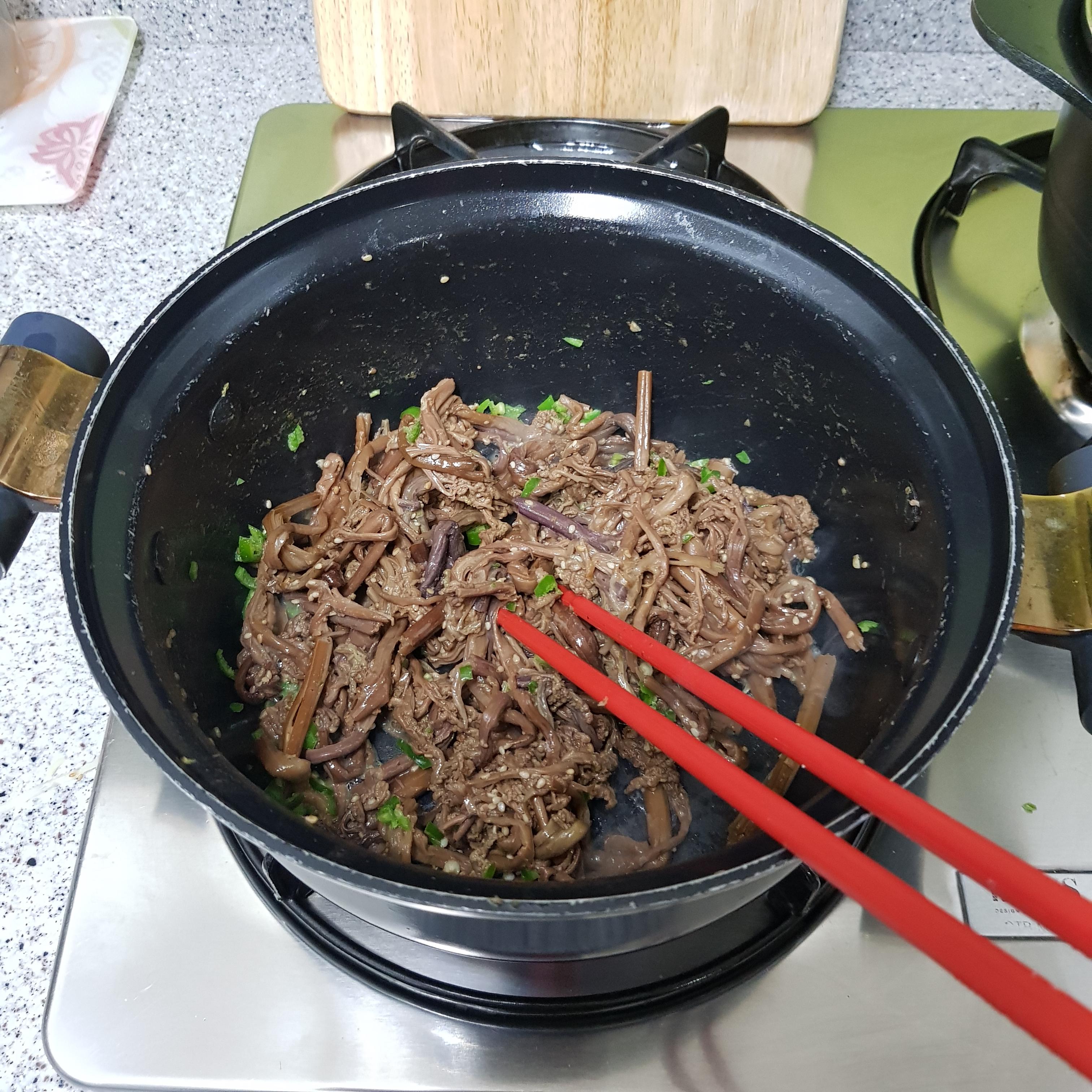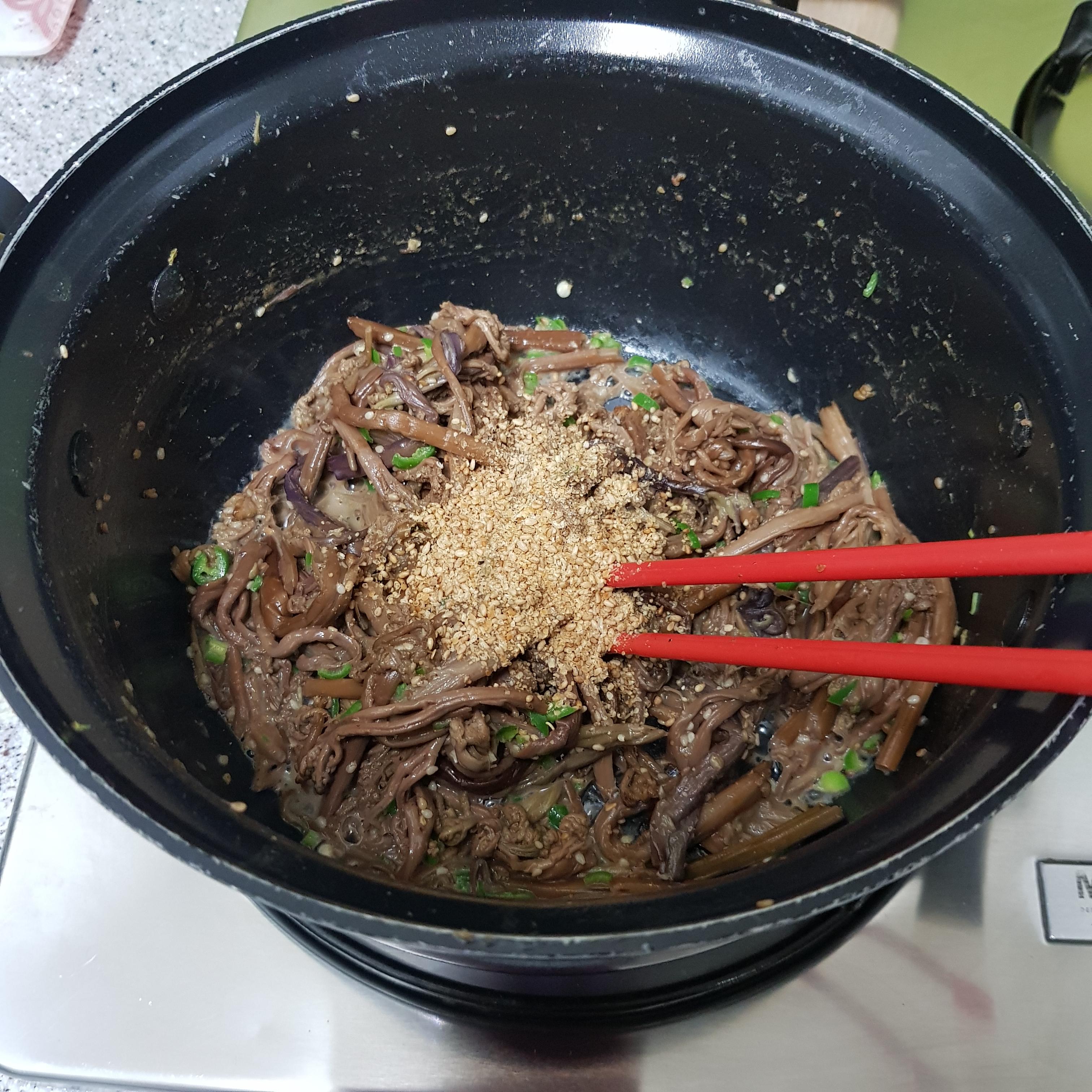 ▶ 도라지와 고사리는 매콤한 맛을 더하기 위해 다진 청양고추를 넣고 수분 제거를 위한 깨소금 1큰술을 각각 넣어 물기가 없을 때까지만 볶아 준비해주세요