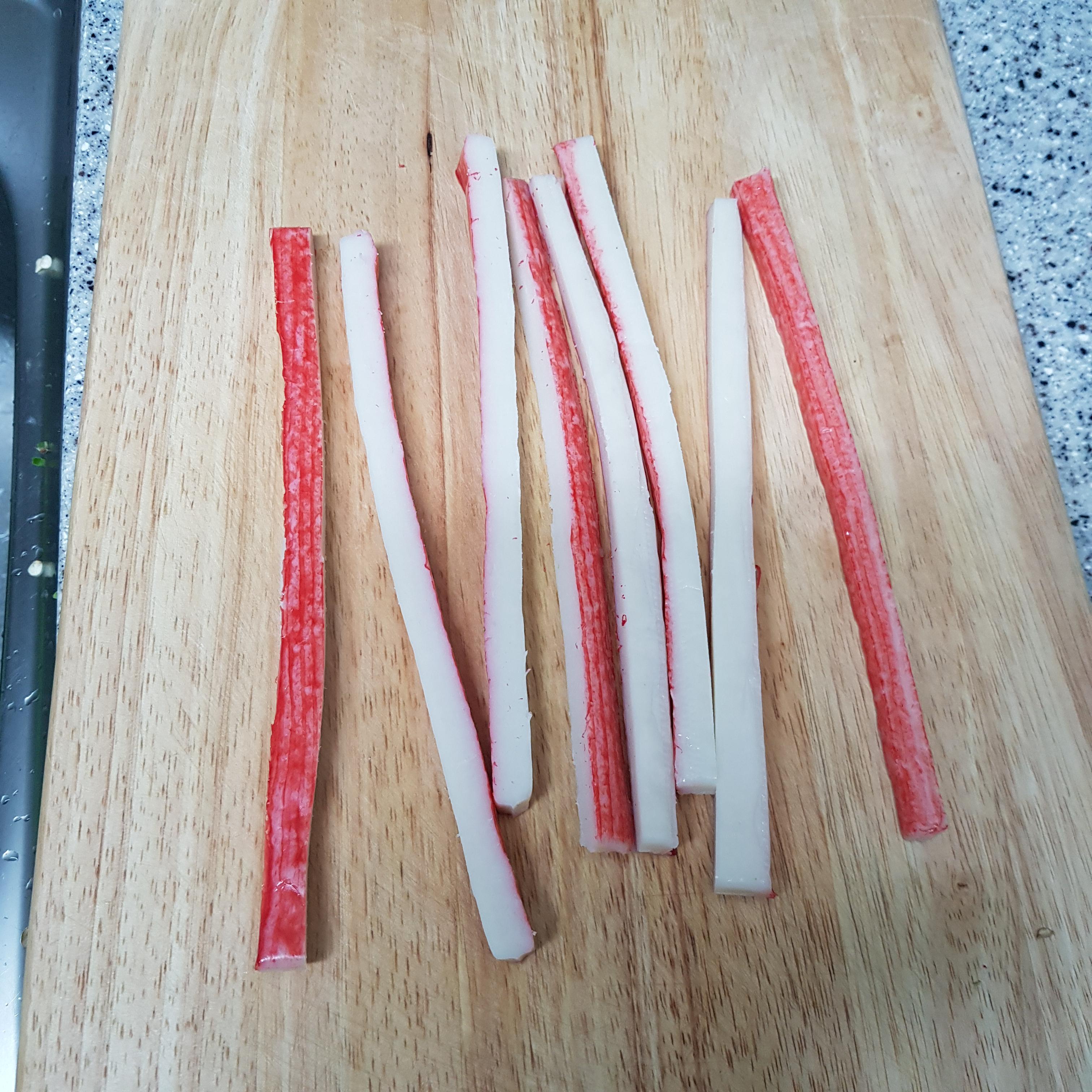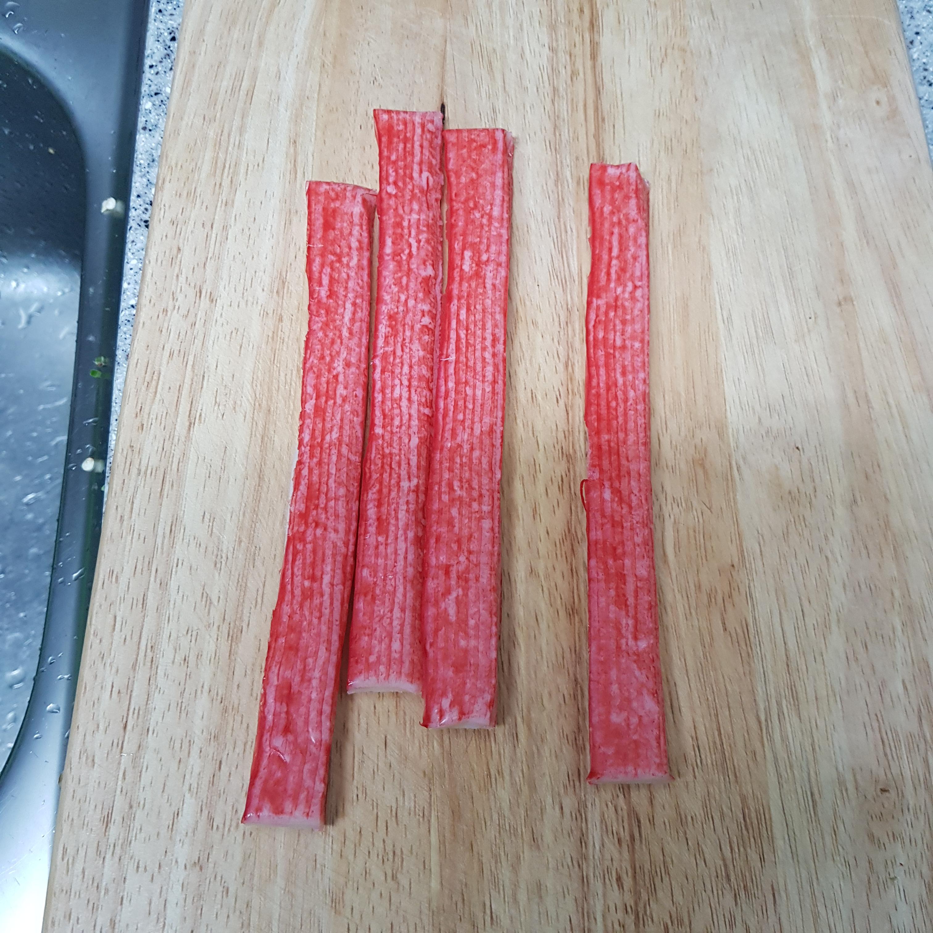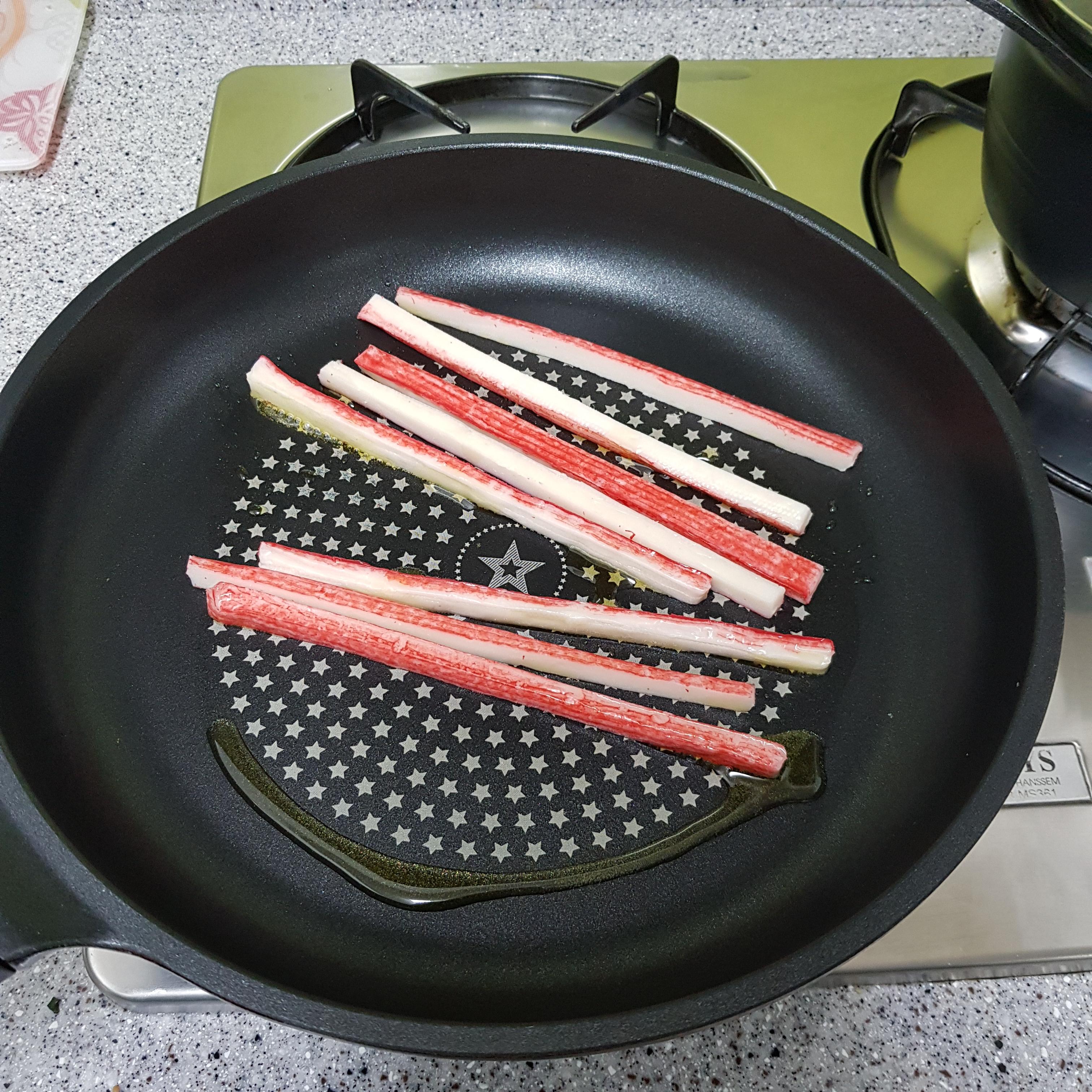 ▶ 맛살은 반으로 자른 뒤 기름을 두르고 살짝 구워 준비해주세요 저는 꼬지 하고 남은 맛살을 사용했는데 맛살이 없다면 햄 또는 단무지 등 냉장고에 남은 재료를 활용하시면 된답니다