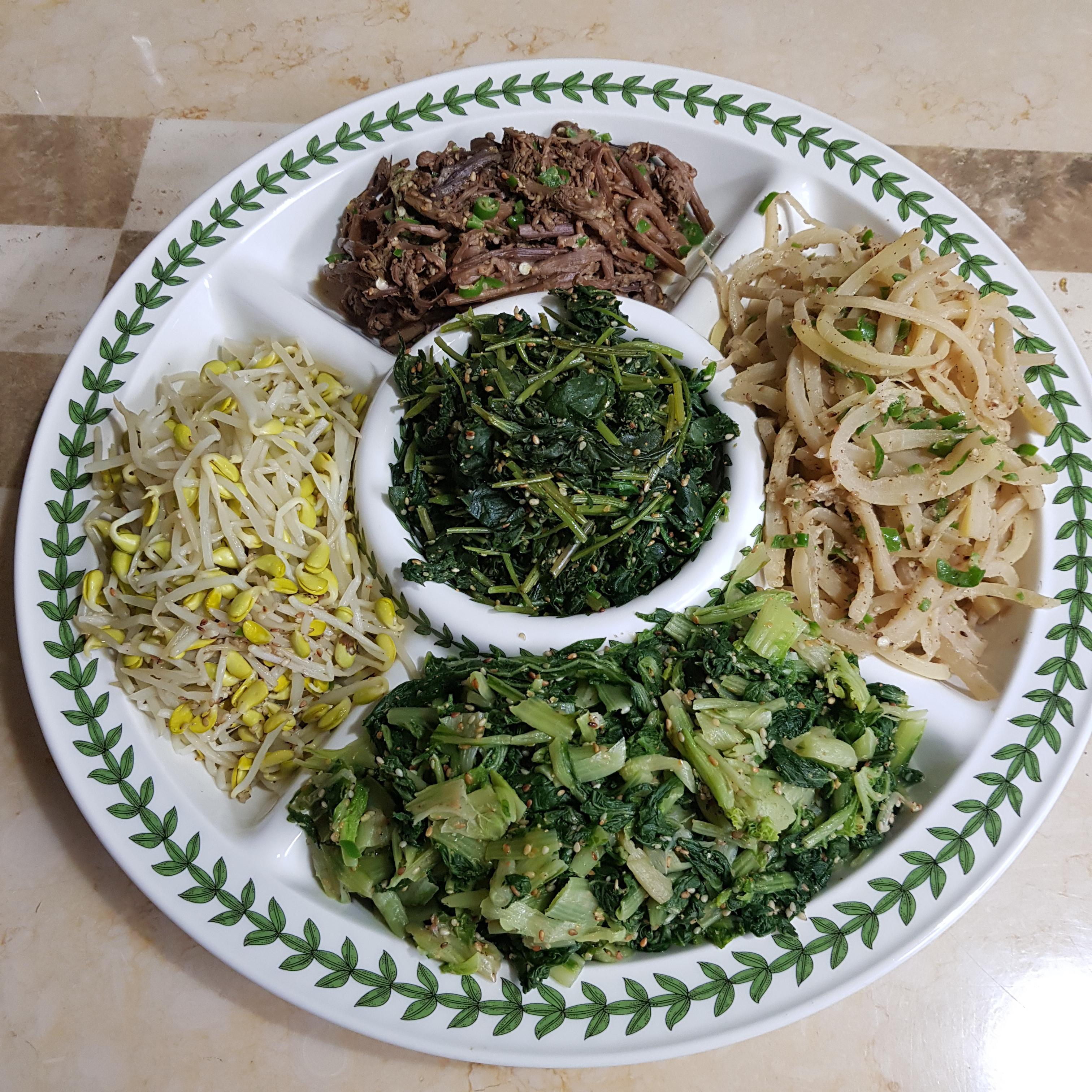 ▶ 취나물과 시금치는 남은 양이 적어 같이 넣고 깨소금 1큰술 넣어 살짝 볶아 물기 제거해 준비해주었답니다