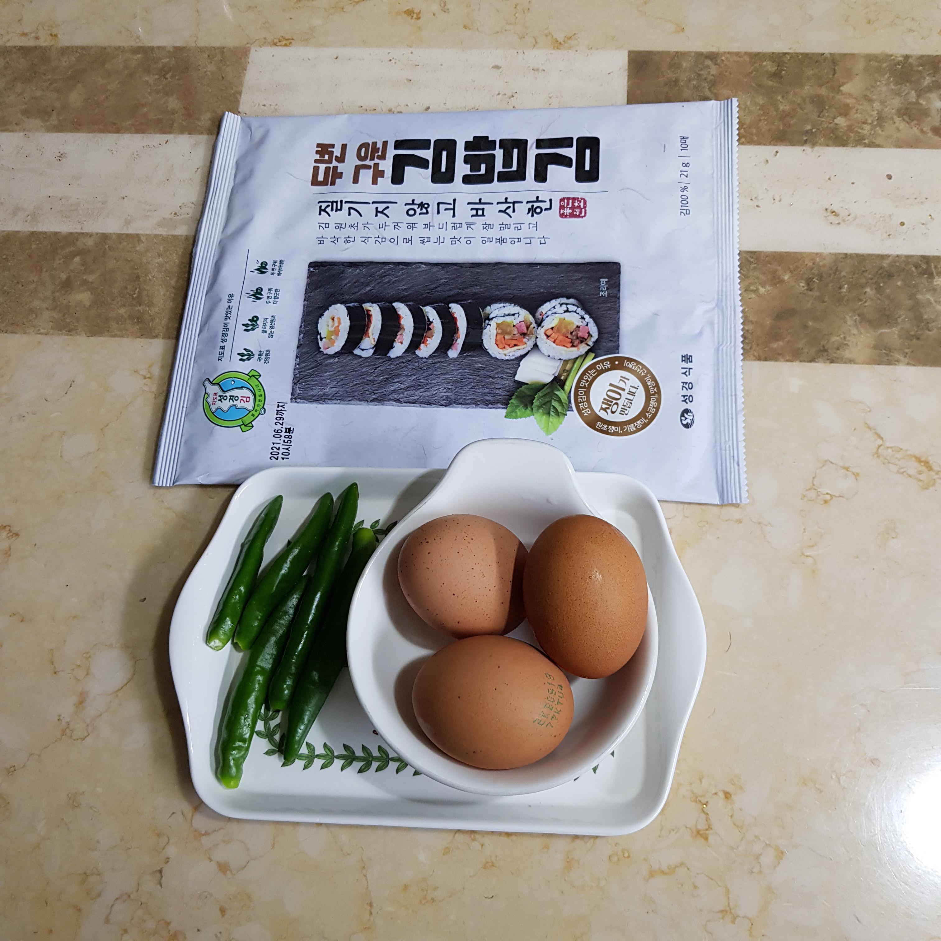 남은 나물, 청양고추 5개, 달걀 3개, 깻잎 16장, 김밥김 4장, 맛살 4줄