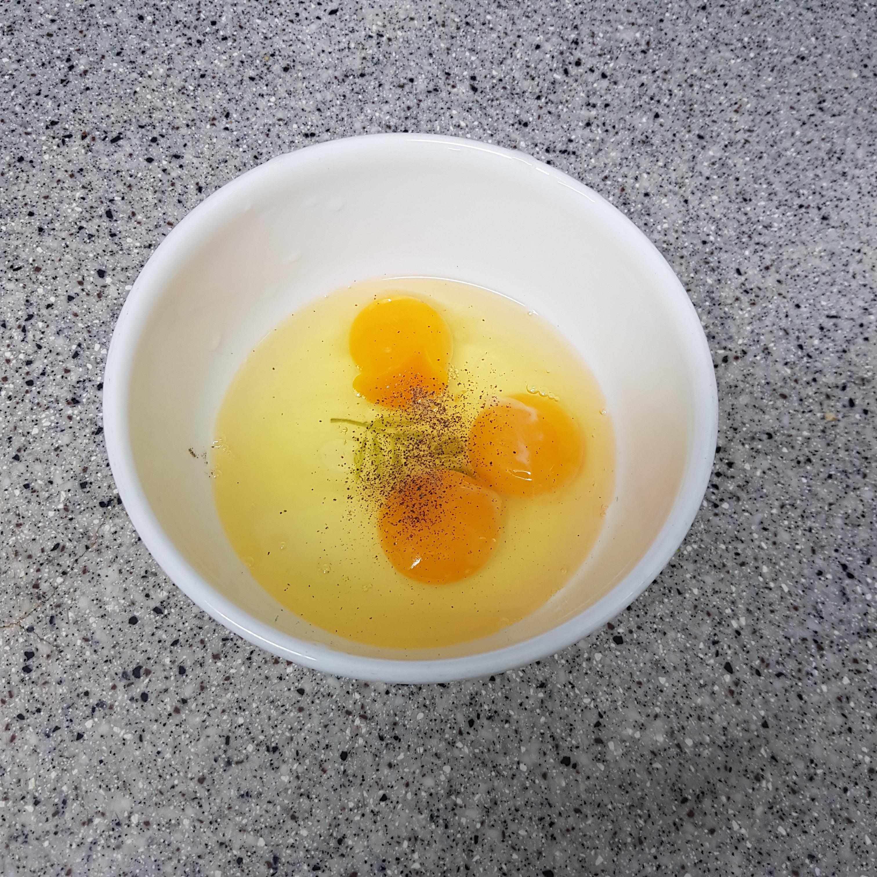 ▶ 달걀 3개에 후춧가루 1꼬집, 꽃소금 1꼬집을 넣어 잘 섞어 준비해주세요